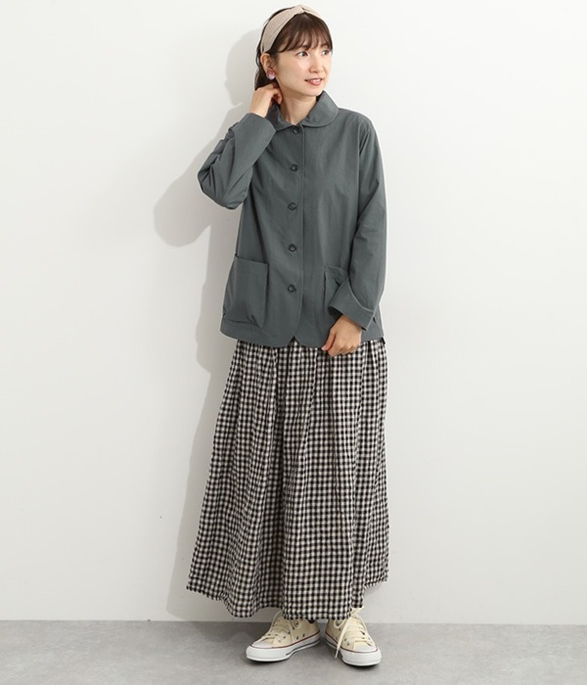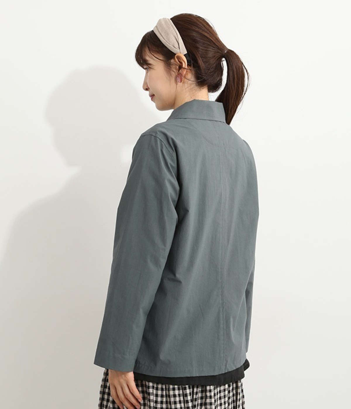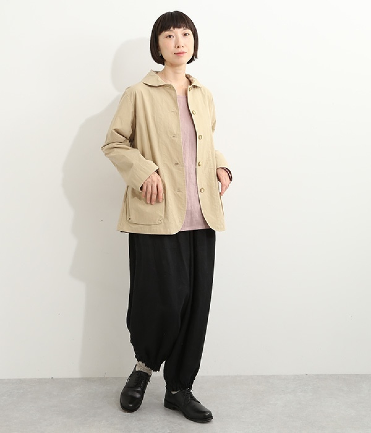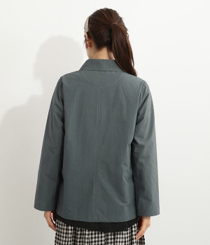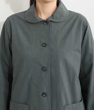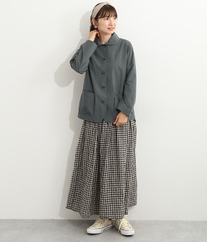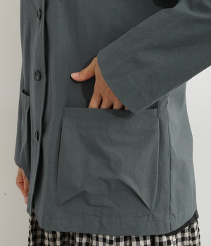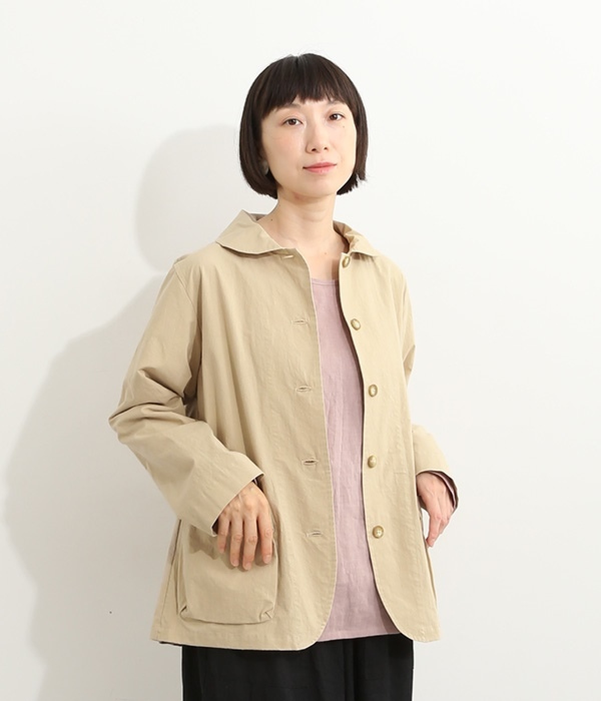 かわいらしくソフトな印象に見せてくれる丸襟を添えたジャケット。カーブした前合わせの裾ラインや角のないパッチポケットにも、やわらかさを意識したディテールが光ります。ボディや袖のシルエットはゆるくなりすぎないレギュラーシルエットを採用。シンプルで着まわしやすく、インナーに主張が強めのアイテムをしのばせてフロントからのぞかせるのもおすすめです。