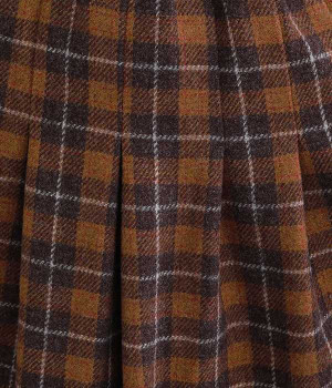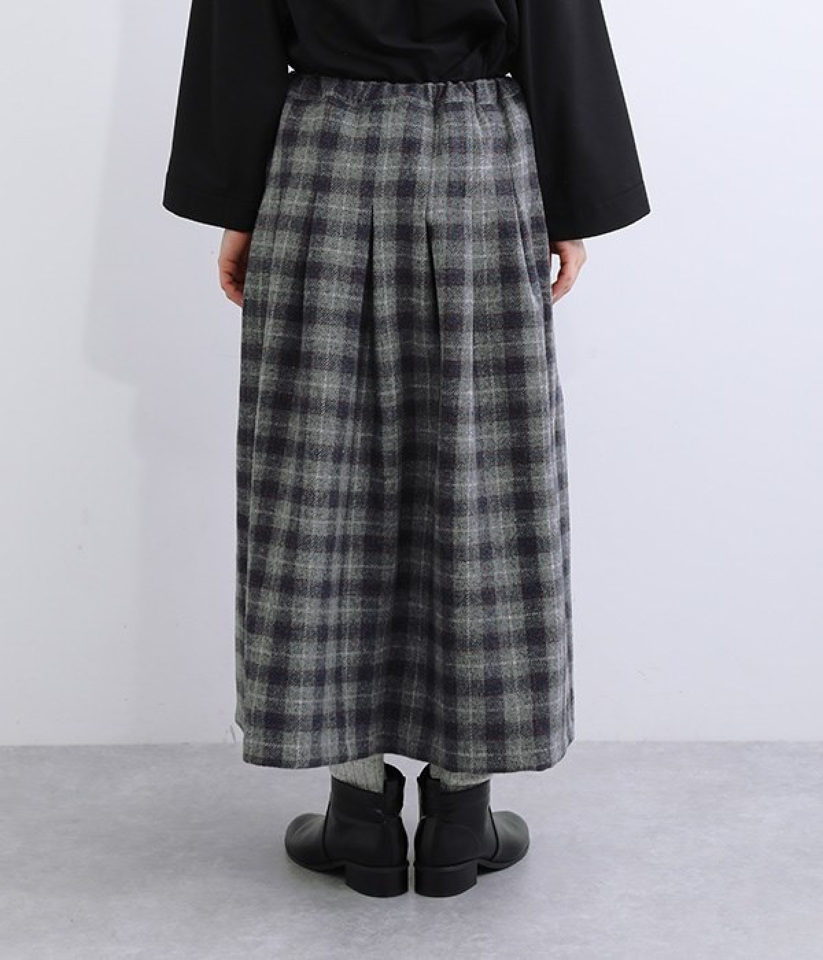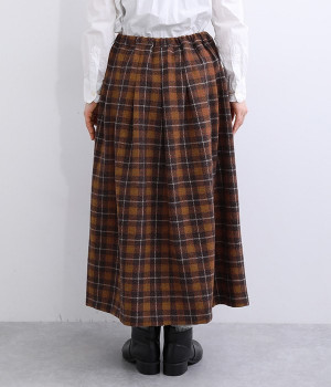 ウール素材であたたかみを感じさせるチェック柄スカート。ウエストにタックを施すことでお腹まわりはすっきりと見え、女性らしいフレアなシルエットに仕上がりました。ブラウスやニットなどシンプルな合わせでもクラシカルな雰囲気たっぷりに。長時間着用しても楽なウエストゴム仕様です。ポリエステルの裏地付きでチクチクしにくいのもうれしいポイント。