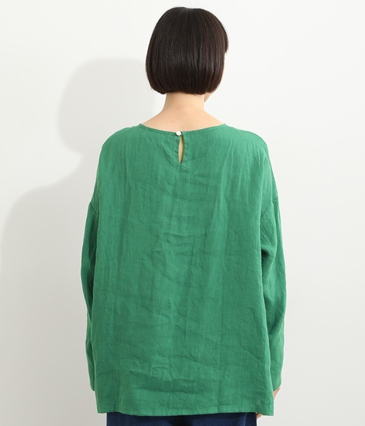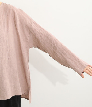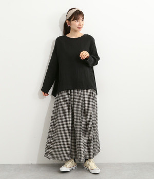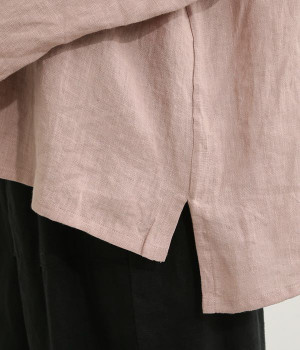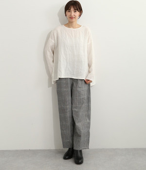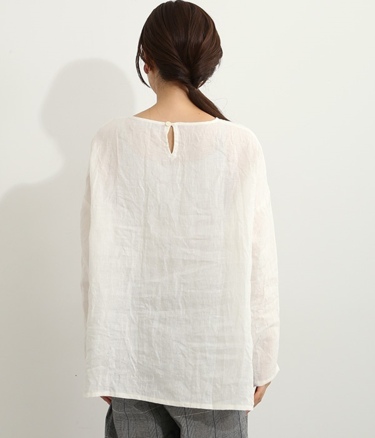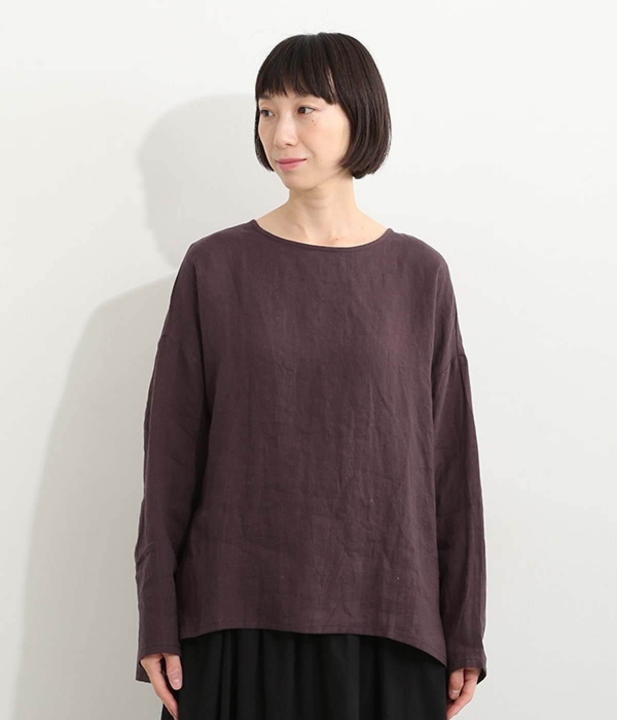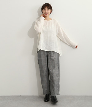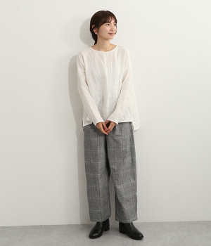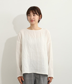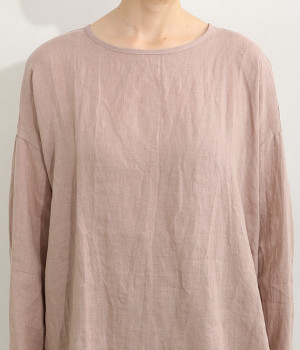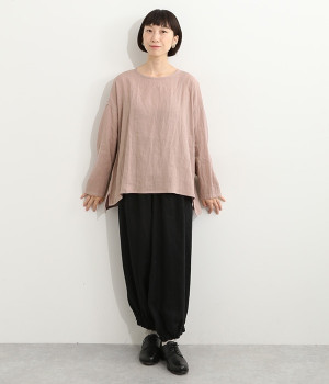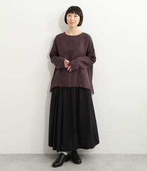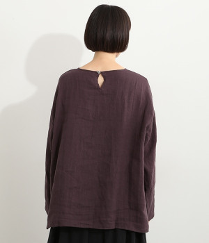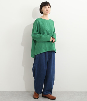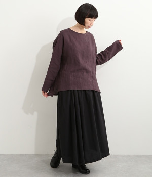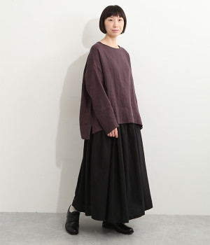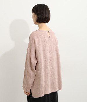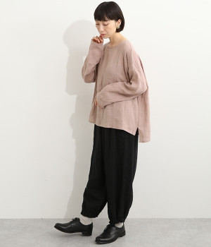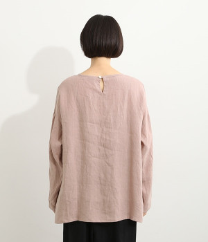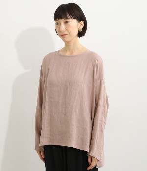 着るほどに風合いに味わいが増していくリネン素材のプルオーバー。サイドにスリットが入って両サイドが少し垂れるサマがかわいらしく、ゆったりとリラクシングな着心地です。お尻がやや隠れる着丈で長すぎず、パンツでもスカートでも着合わせを選ばないのが自慢。後ろネックは涙開きになっているため、インナーや肌がちらりとのぞくさりげない抜け感出しの工夫も加えました。