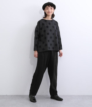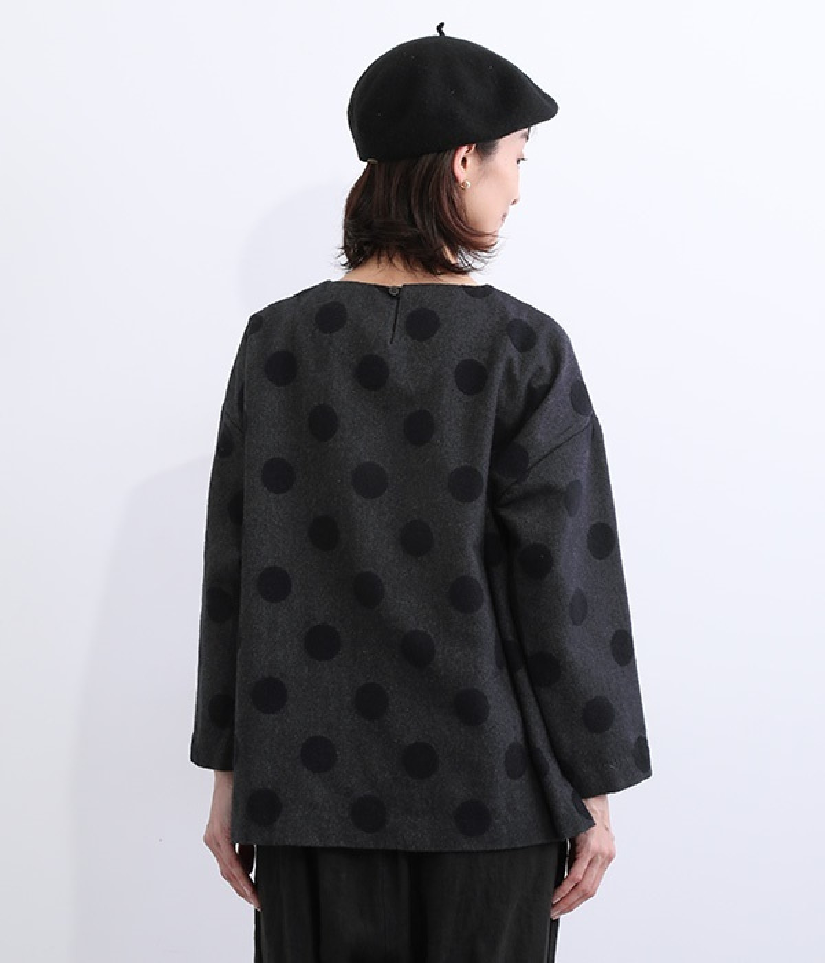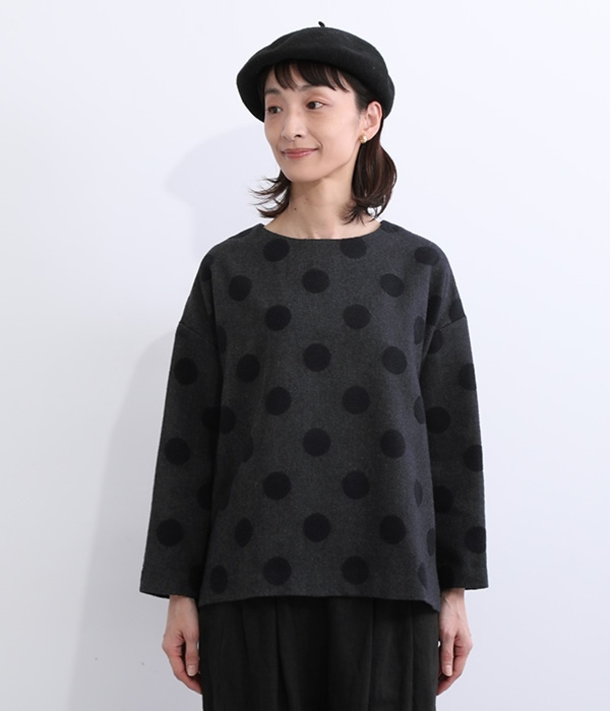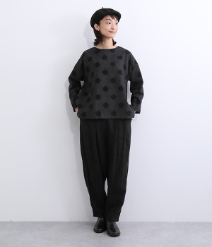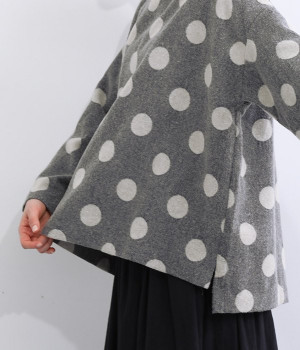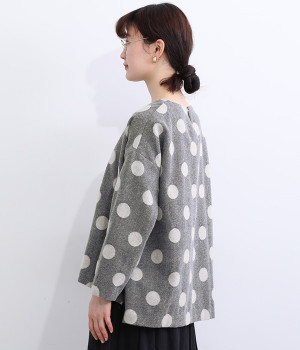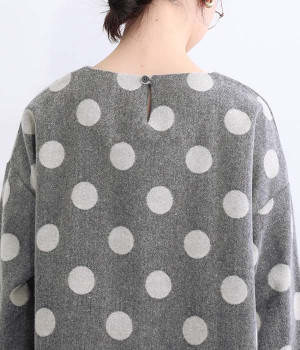 天然のあたたかさがうれしい、ウール混素材を使用したプルオーバーブラウスです。インパクトとかわいらしさの絶妙なバランスを保った中粒ドットは、立体感を持たせてさらに印象的に。ハイネックなどのインナーも合わせられるよう、ワイドな身幅に仕上げました。同素材のボトムを合わせてセットアップ風にスタイリングするのもおしゃれです。