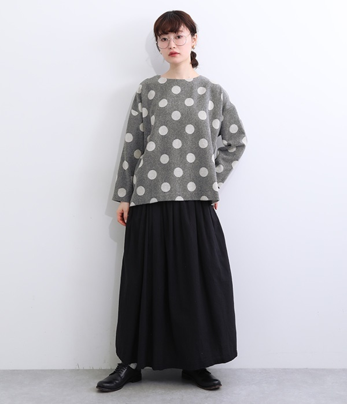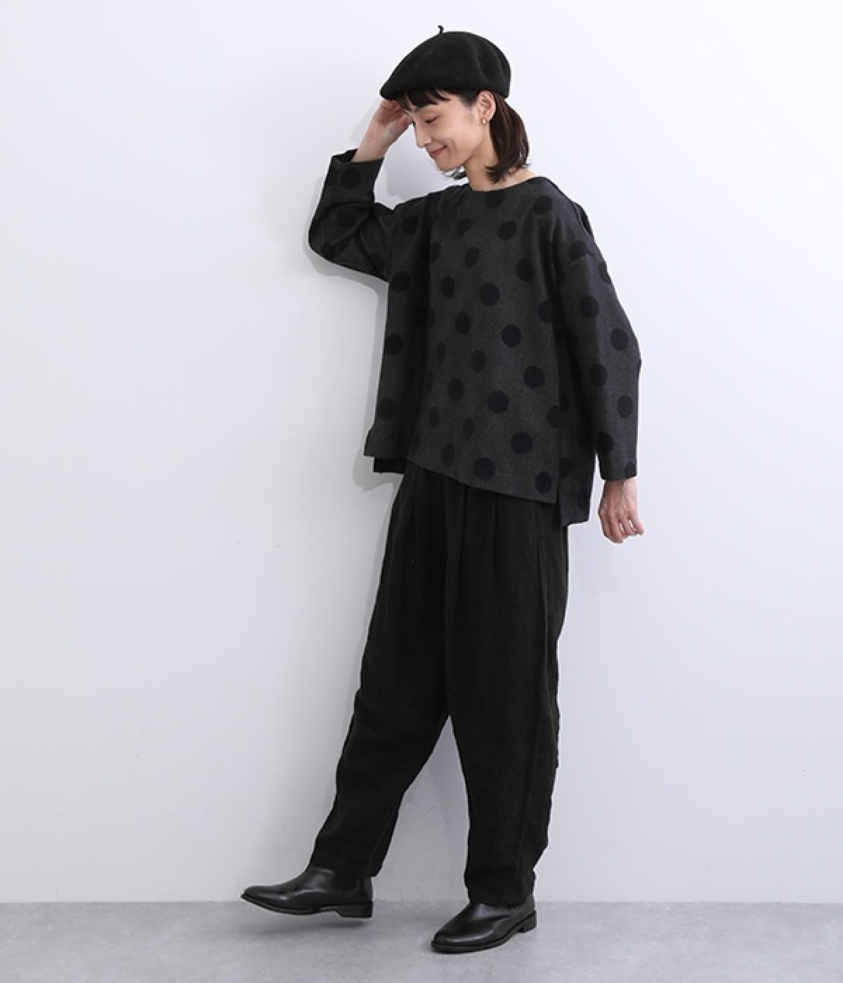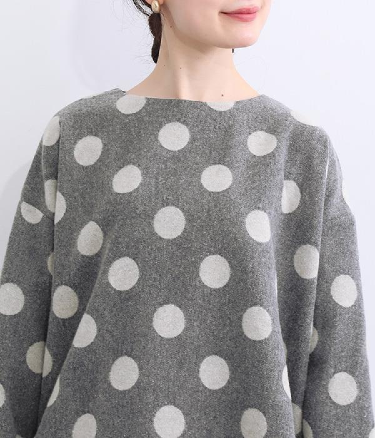 天然のあたたかさがうれしい、ウール混素材を使用したプルオーバーブラウスです。インパクトとかわいらしさの絶妙なバランスを保った中粒ドットは、立体感を持たせてさらに印象的に。ハイネックなどのインナーも合わせられるよう、ワイドな身幅に仕上げました。同素材のボトムを合わせてセットアップ風にスタイリングするのもおしゃれです。