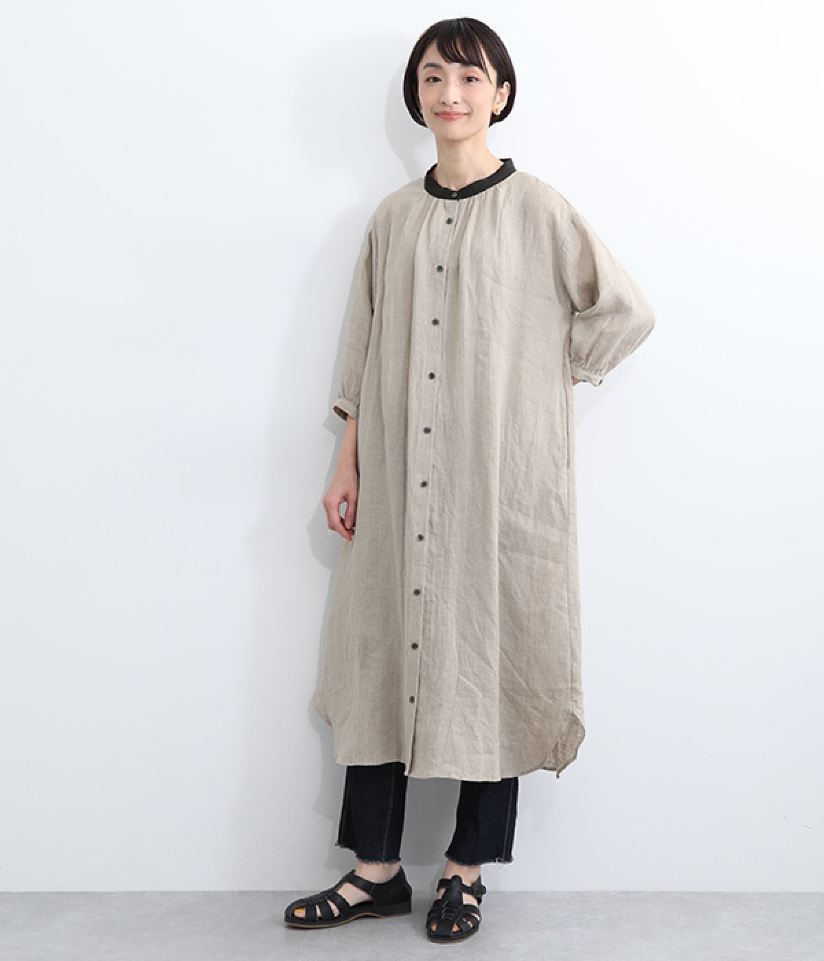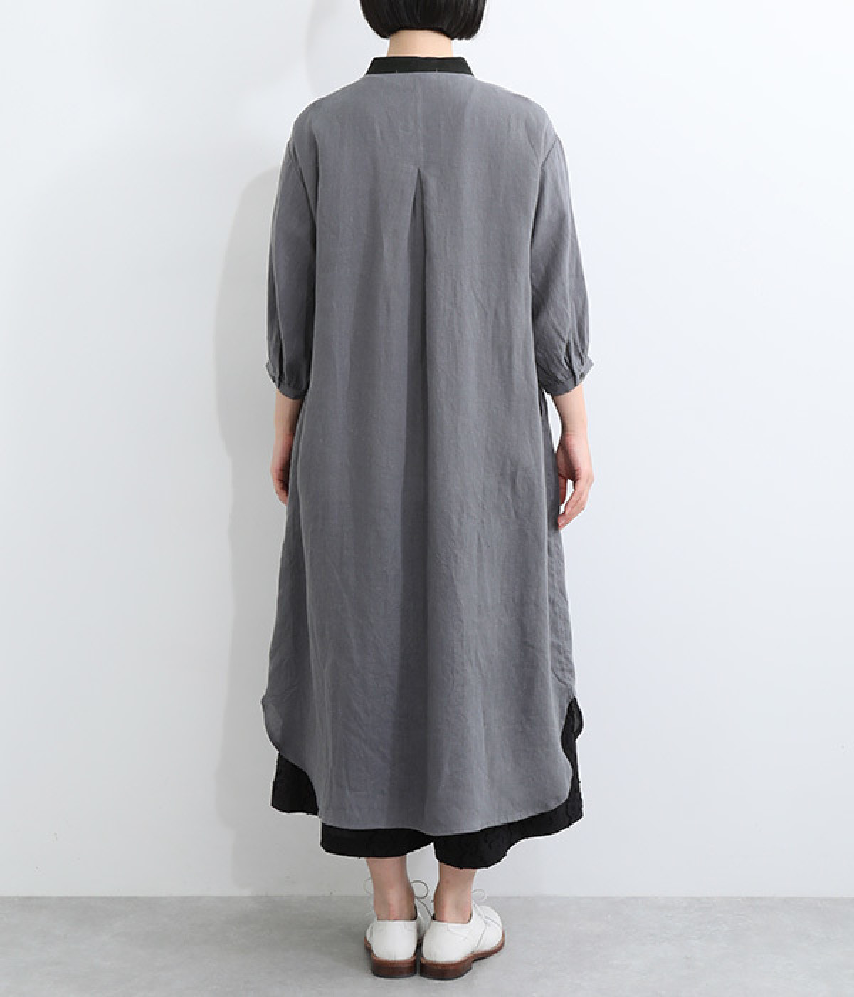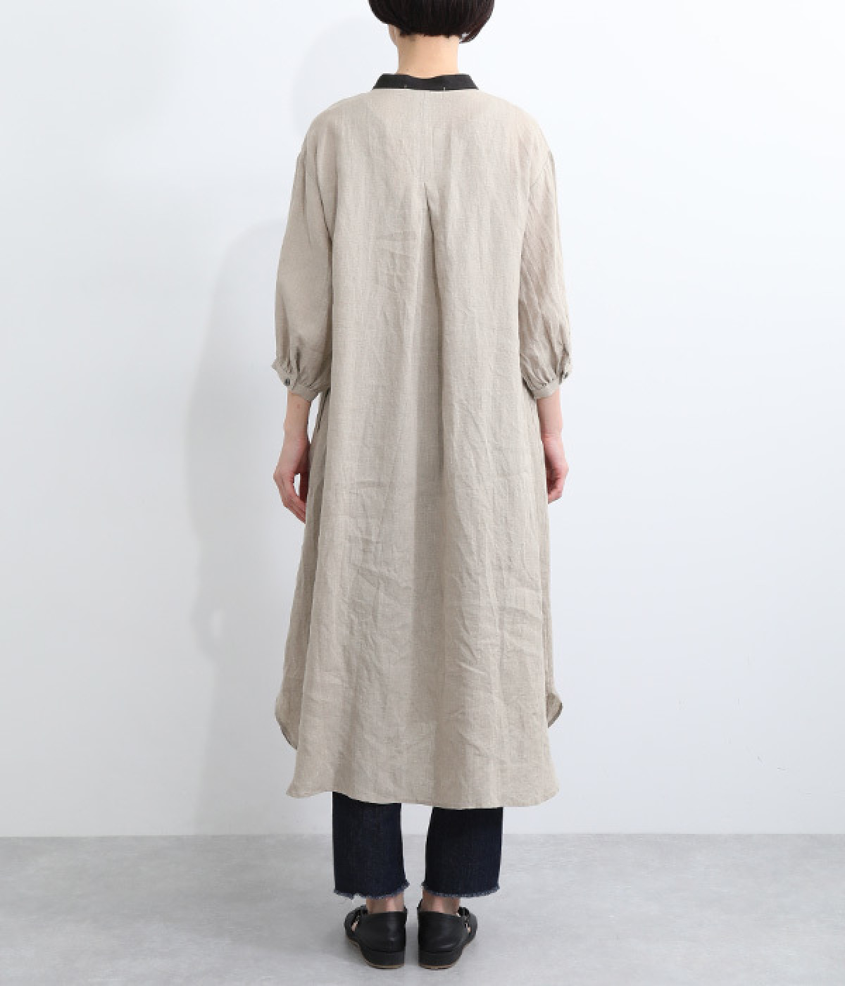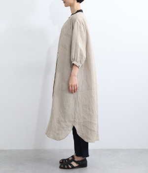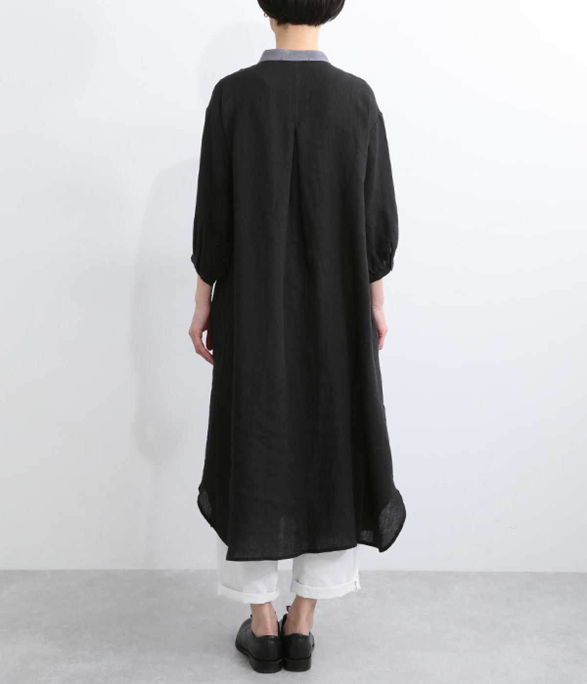 バイカラーデザインのスタンドカラーが特徴的なワンピース。リネンならではの風合いを感じられる、ざっくりとした清涼感のあるタッチがポイントです。全体がゆったりとしているので、気負わずに着用することが可能。後ろ身頃には大胆にタックを入れて、立体的な表情に仕上げました。シャツタイプのため、前をあけた羽織りのスタイリングも好バランスです。