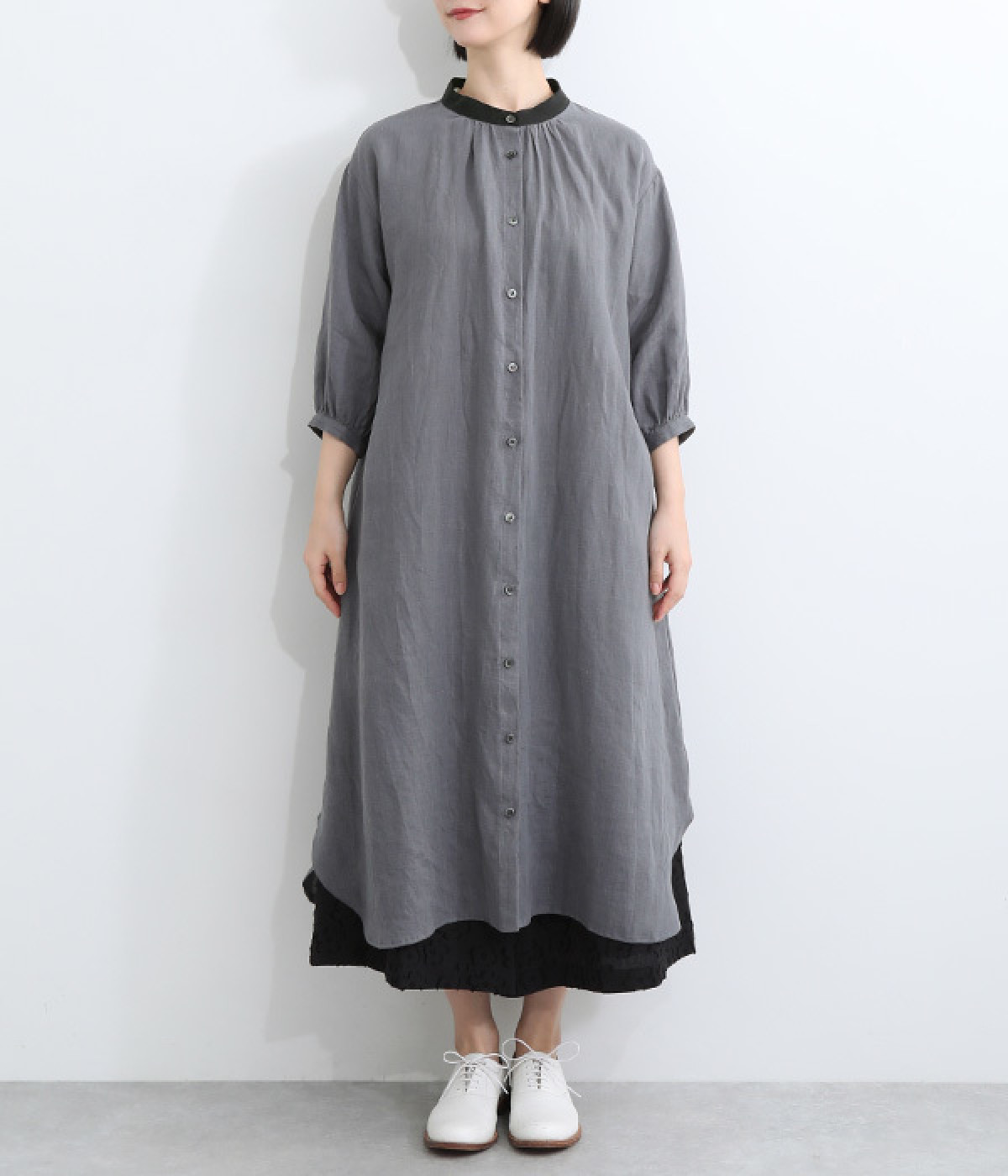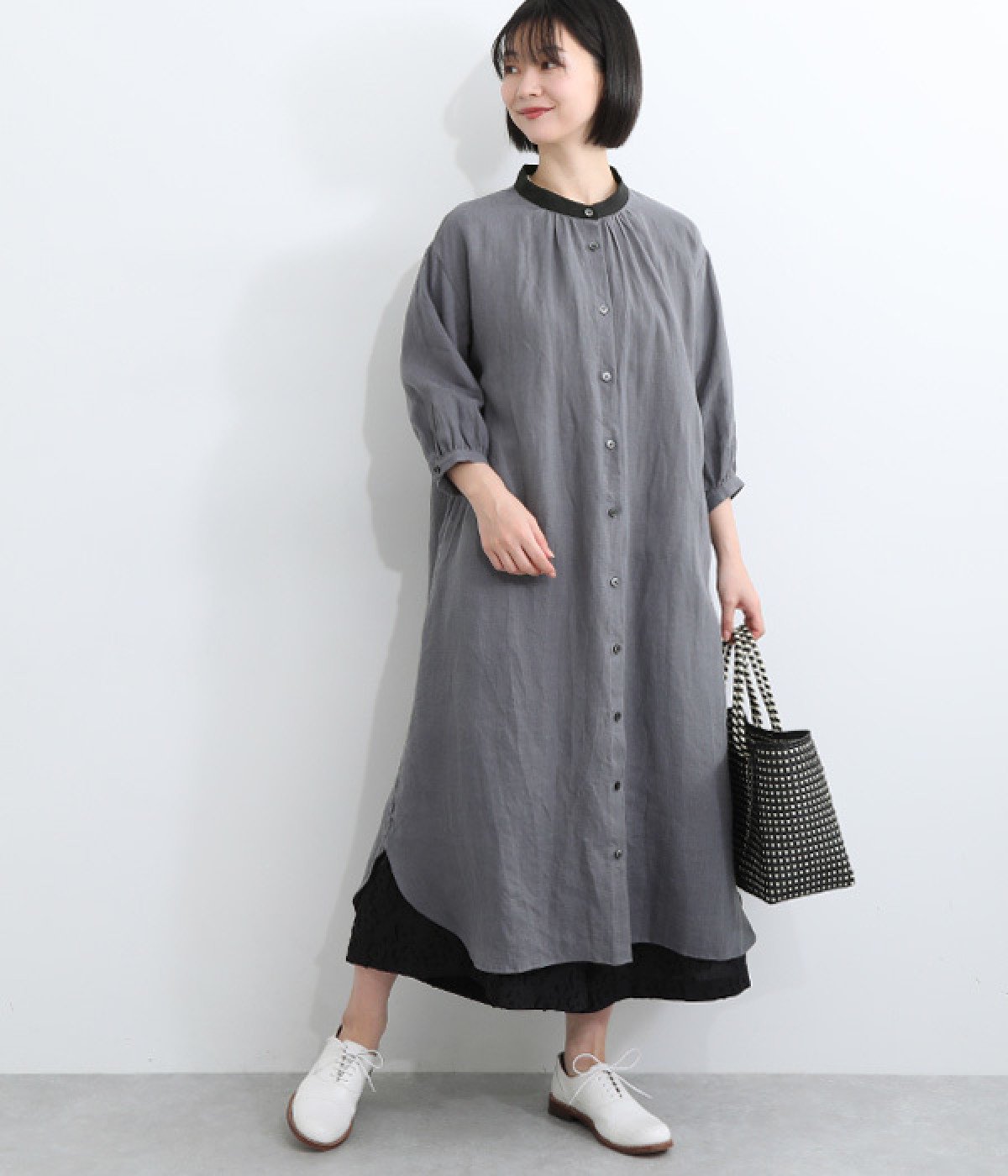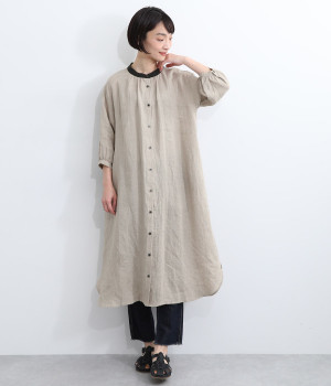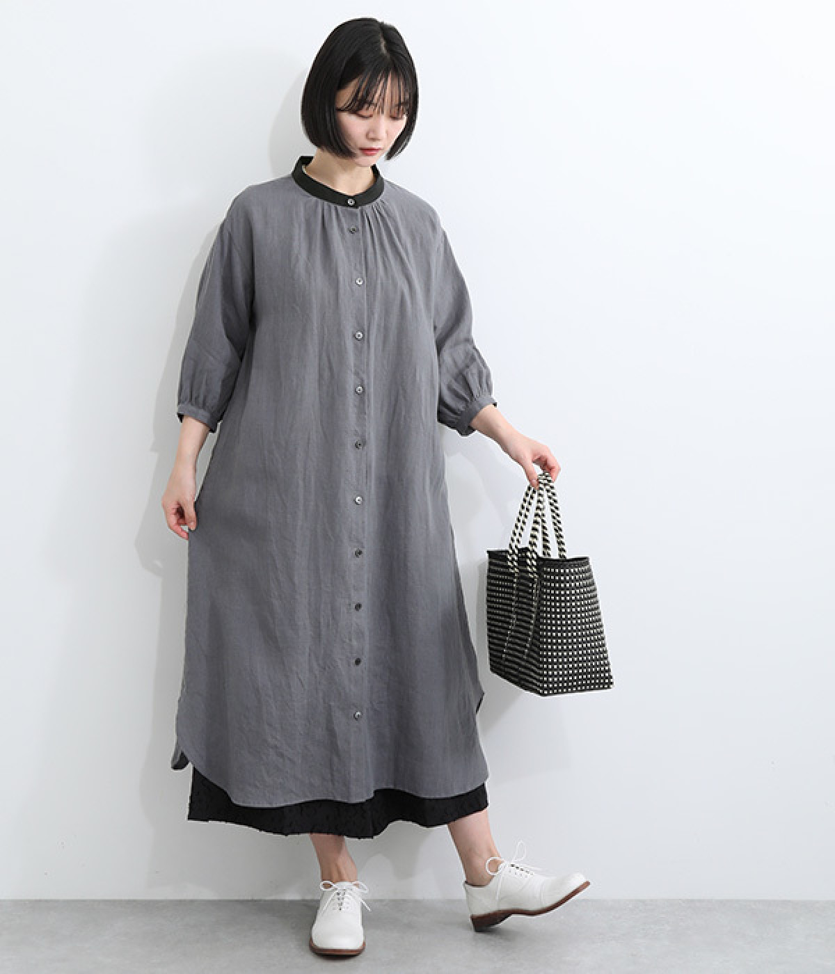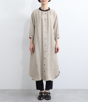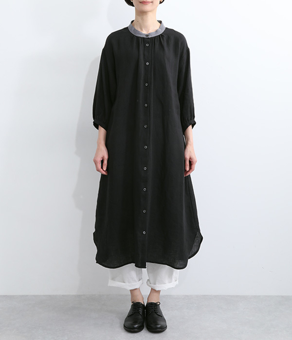 バイカラーデザインのスタンドカラーが特徴的なワンピース。リネンならではの風合いを感じられる、ざっくりとした清涼感のあるタッチがポイントです。全体がゆったりとしているので、気負わずに着用することが可能。後ろ身頃には大胆にタックを入れて、立体的な表情に仕上げました。シャツタイプのため、前をあけた羽織りのスタイリングも好バランスです。