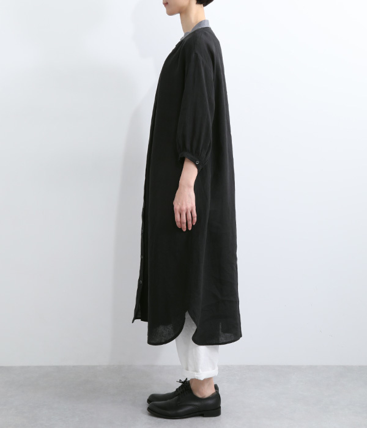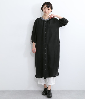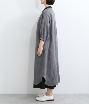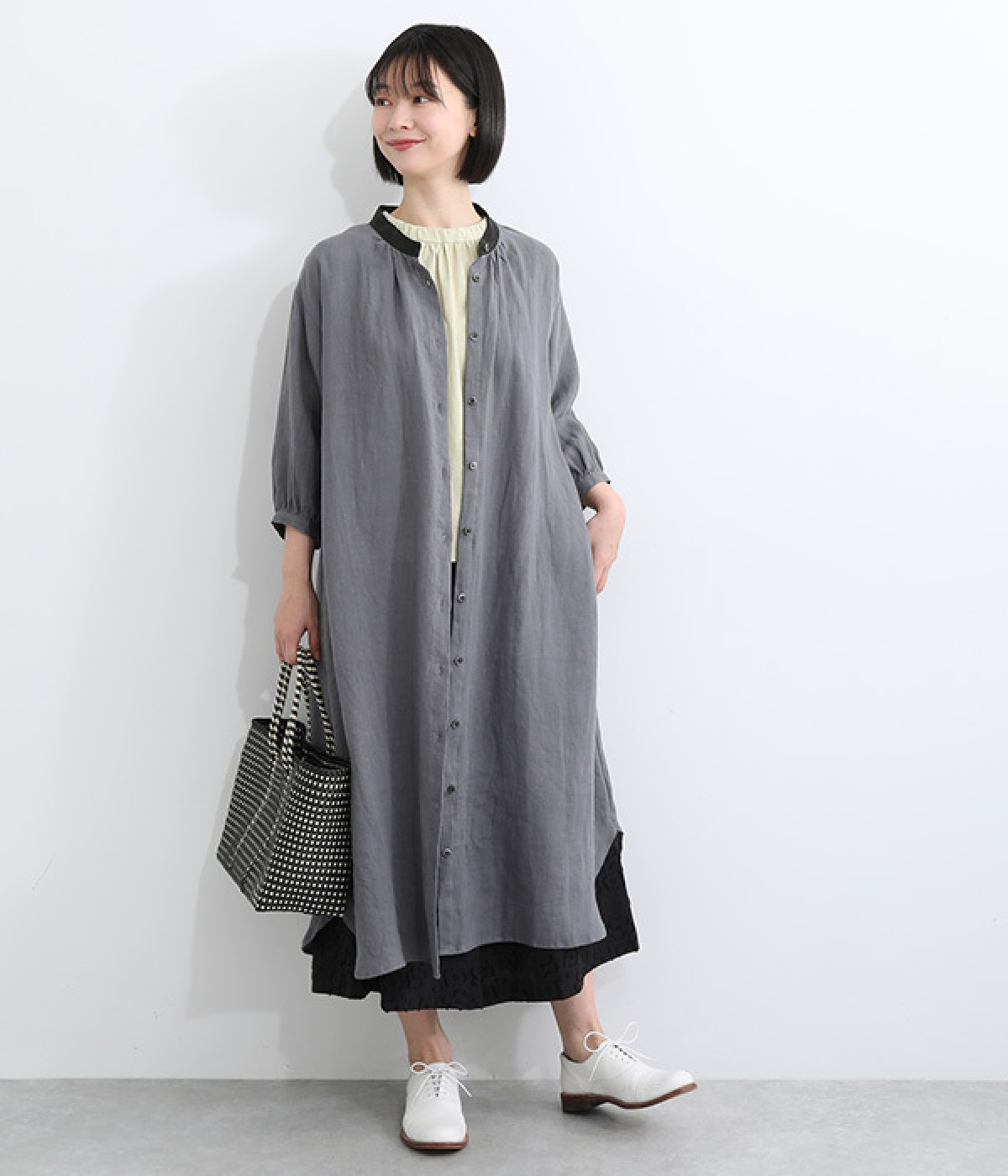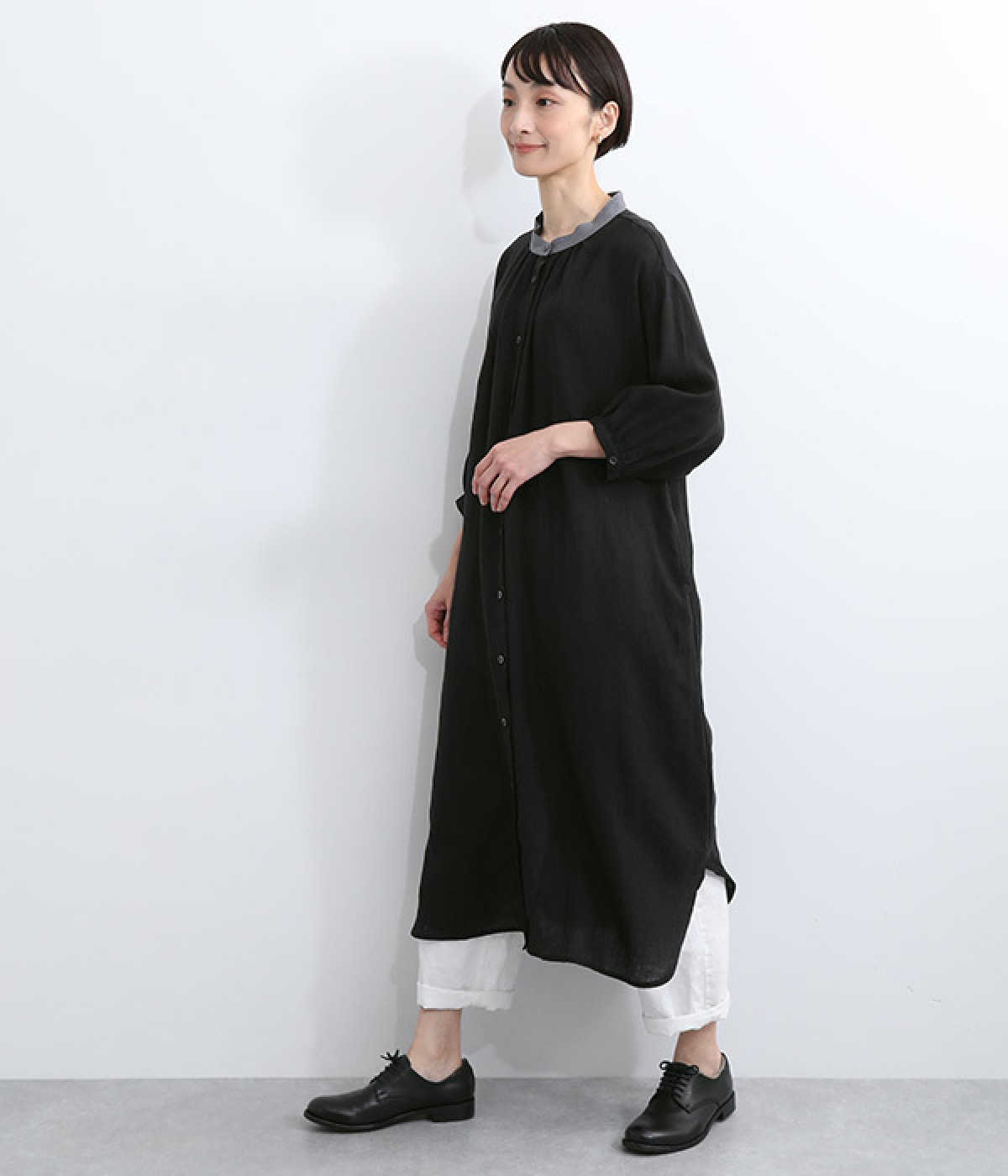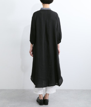 バイカラーデザインのスタンドカラーが特徴的なワンピース。リネンならではの風合いを感じられる、ざっくりとした清涼感のあるタッチがポイントです。全体がゆったりとしているので、気負わずに着用することが可能。後ろ身頃には大胆にタックを入れて、立体的な表情に仕上げました。シャツタイプのため、前をあけた羽織りのスタイリングも好バランスです。