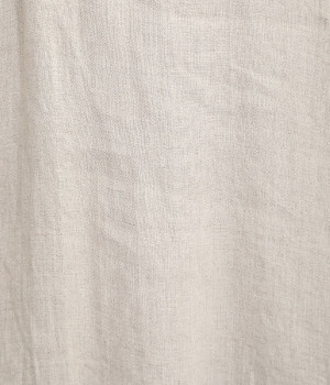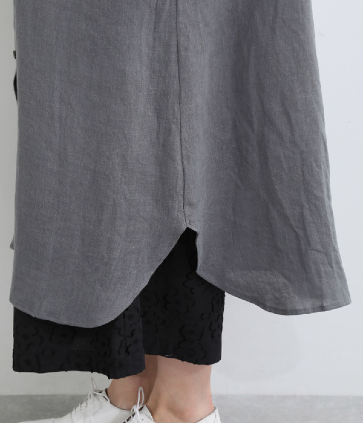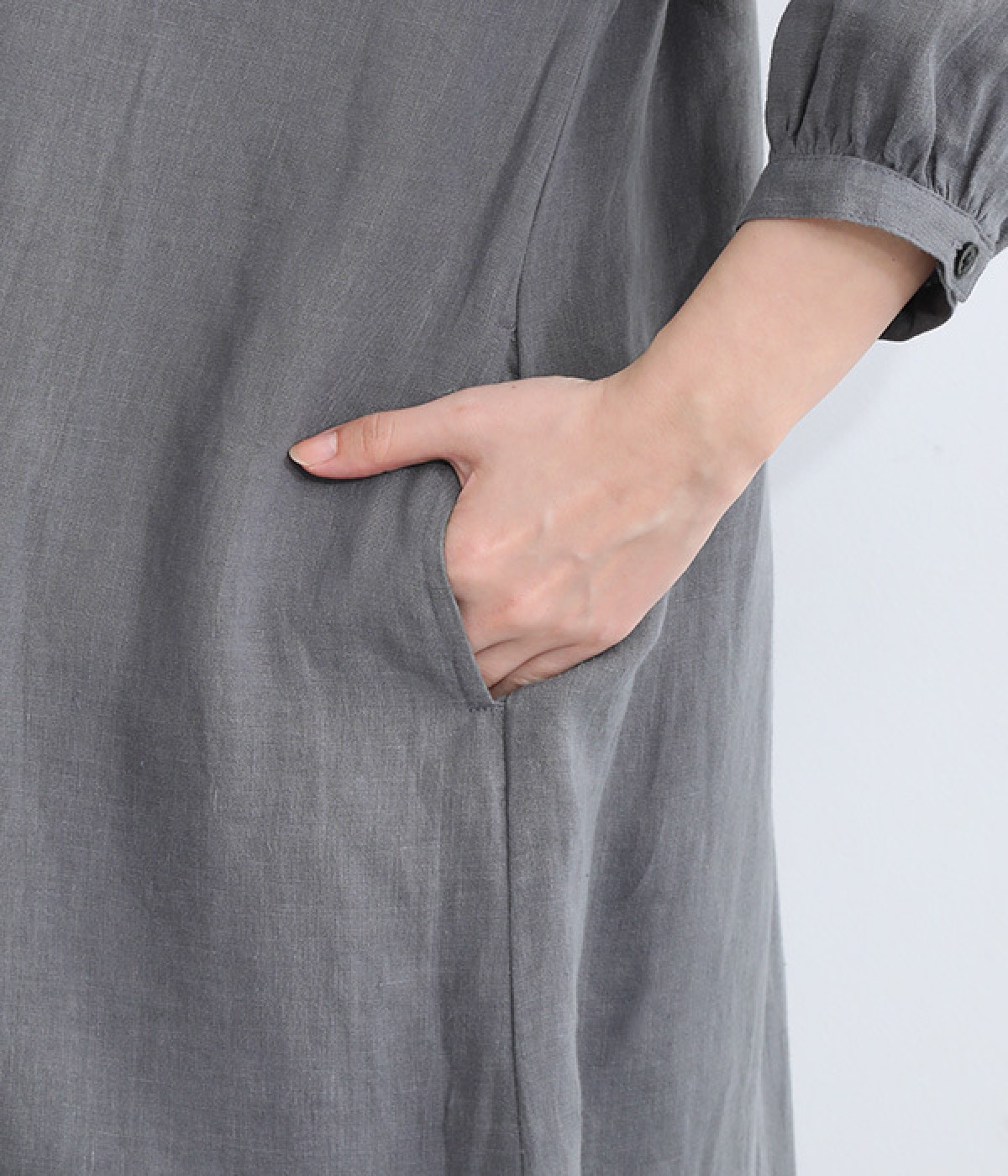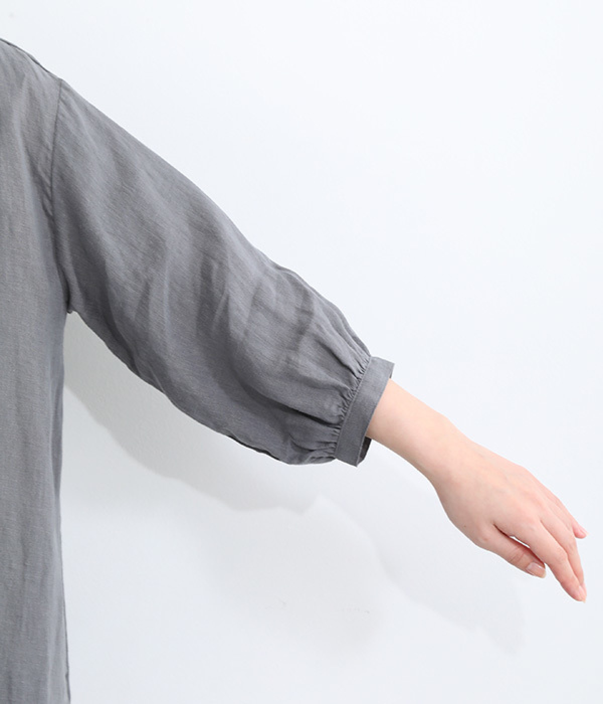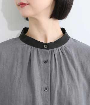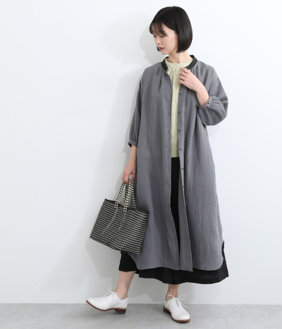 バイカラーデザインのスタンドカラーが特徴的なワンピース。リネンならではの風合いを感じられる、ざっくりとした清涼感のあるタッチがポイントです。全体がゆったりとしているので、気負わずに着用することが可能。後ろ身頃には大胆にタックを入れて、立体的な表情に仕上げました。シャツタイプのため、前をあけた羽織りのスタイリングも好バランスです。