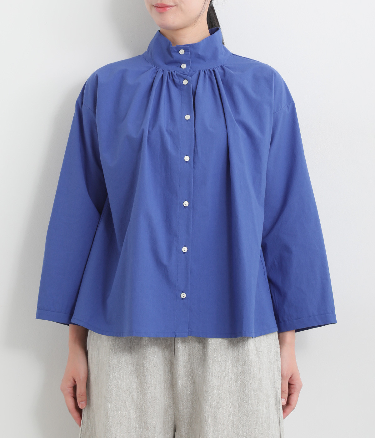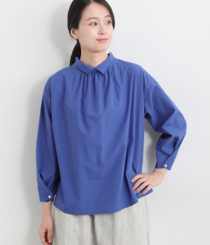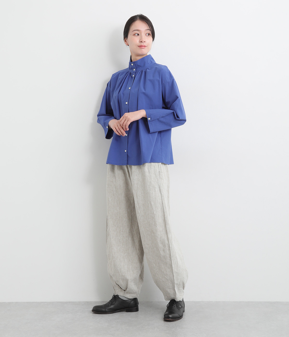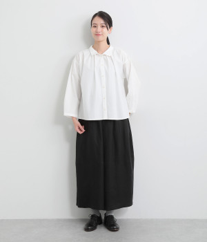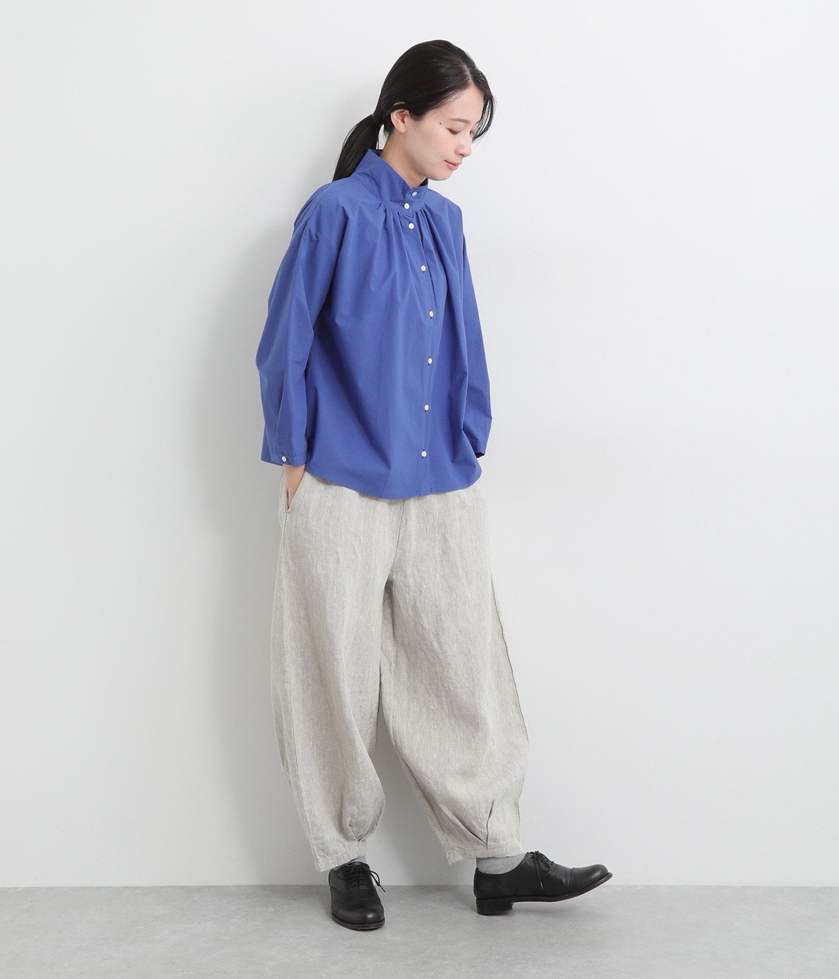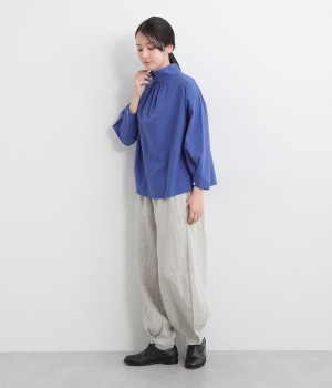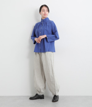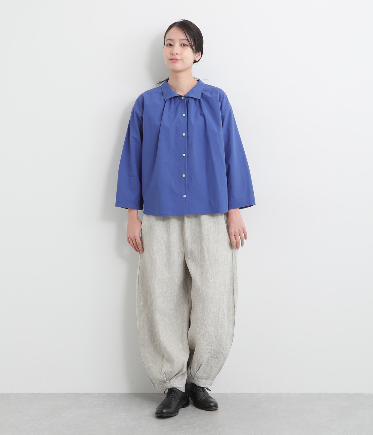 洗いざらしのシワ感やソフトなふくらみ、動きを持たせたワッシャー感が特徴的な、巧みな染色技法「近江晒」のコットンを使用。軽やかなのに独特の存在感があってメイン使いにもなる生地感です。