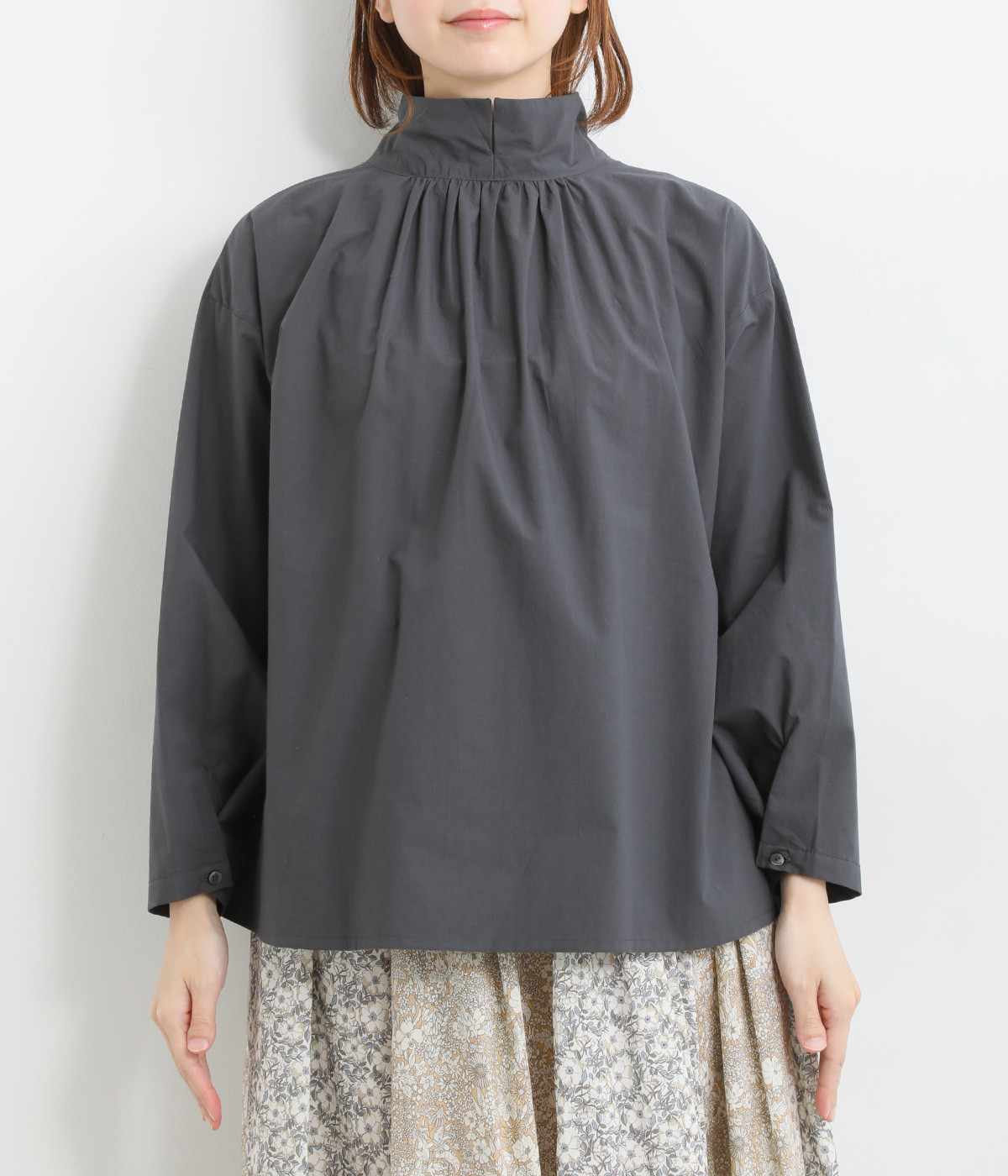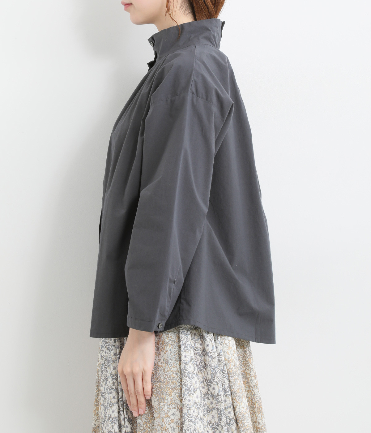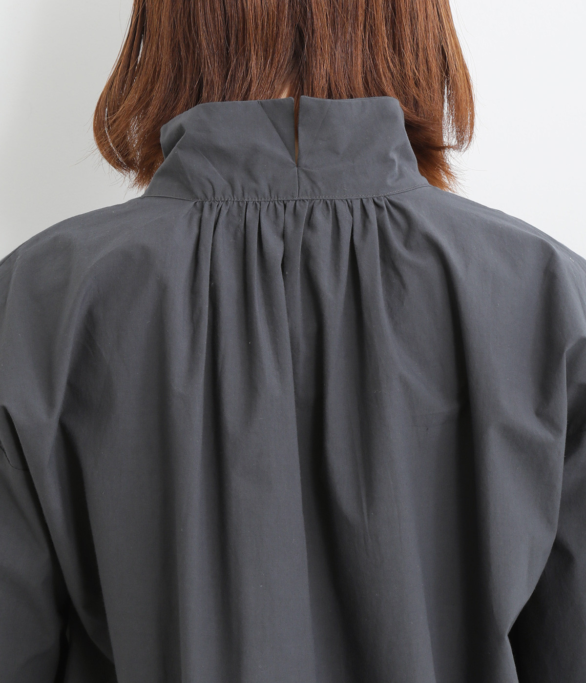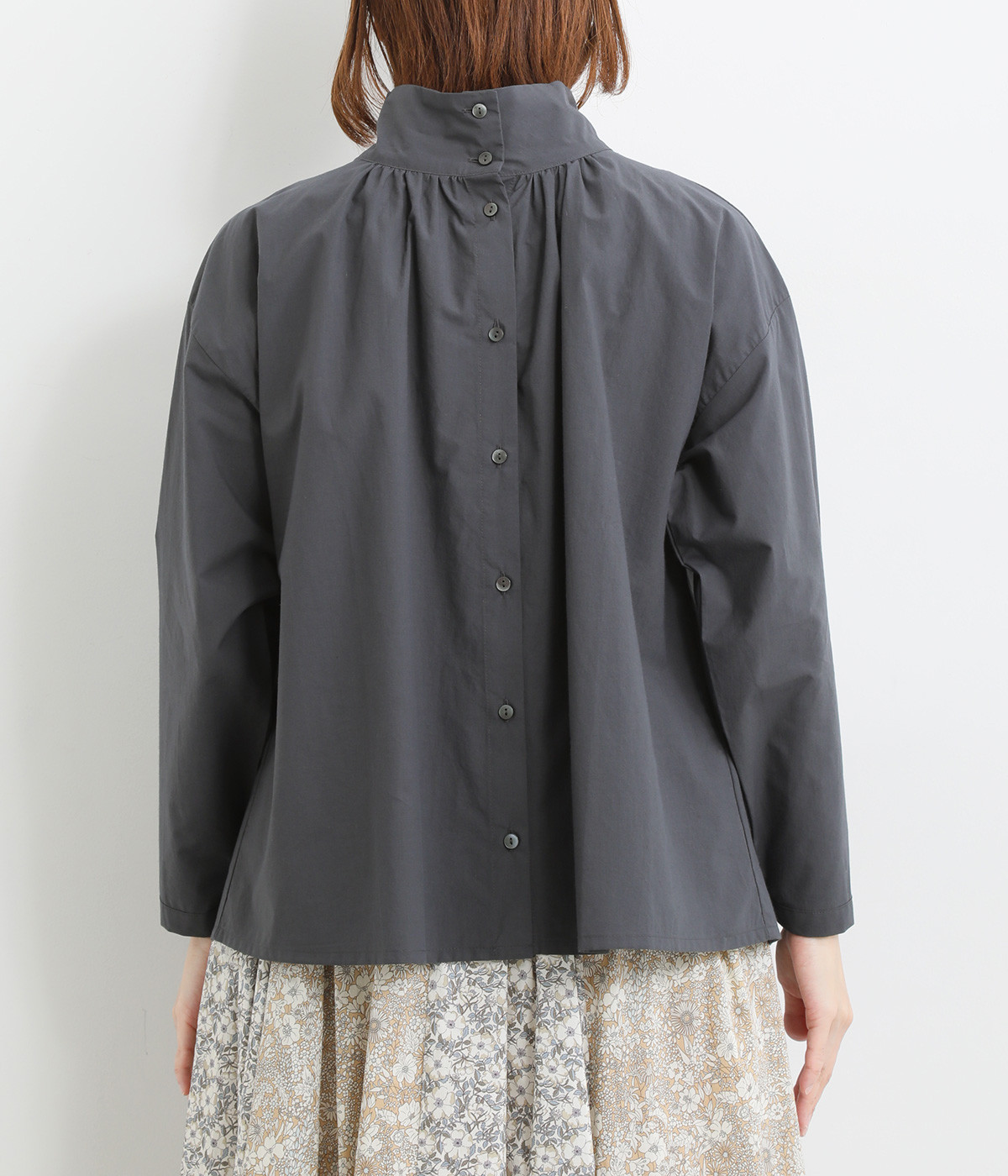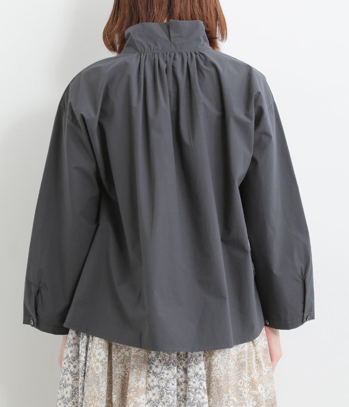 羽織りにしたり後ろボタンにしたりと着まわし力の高まる前後2way仕立てです。大人顔に見せてくれるハイネックは、折り返して襟のように見せても◎。たっぷりと広がった袖はボタンの留め位置でアレンジも楽しめます。