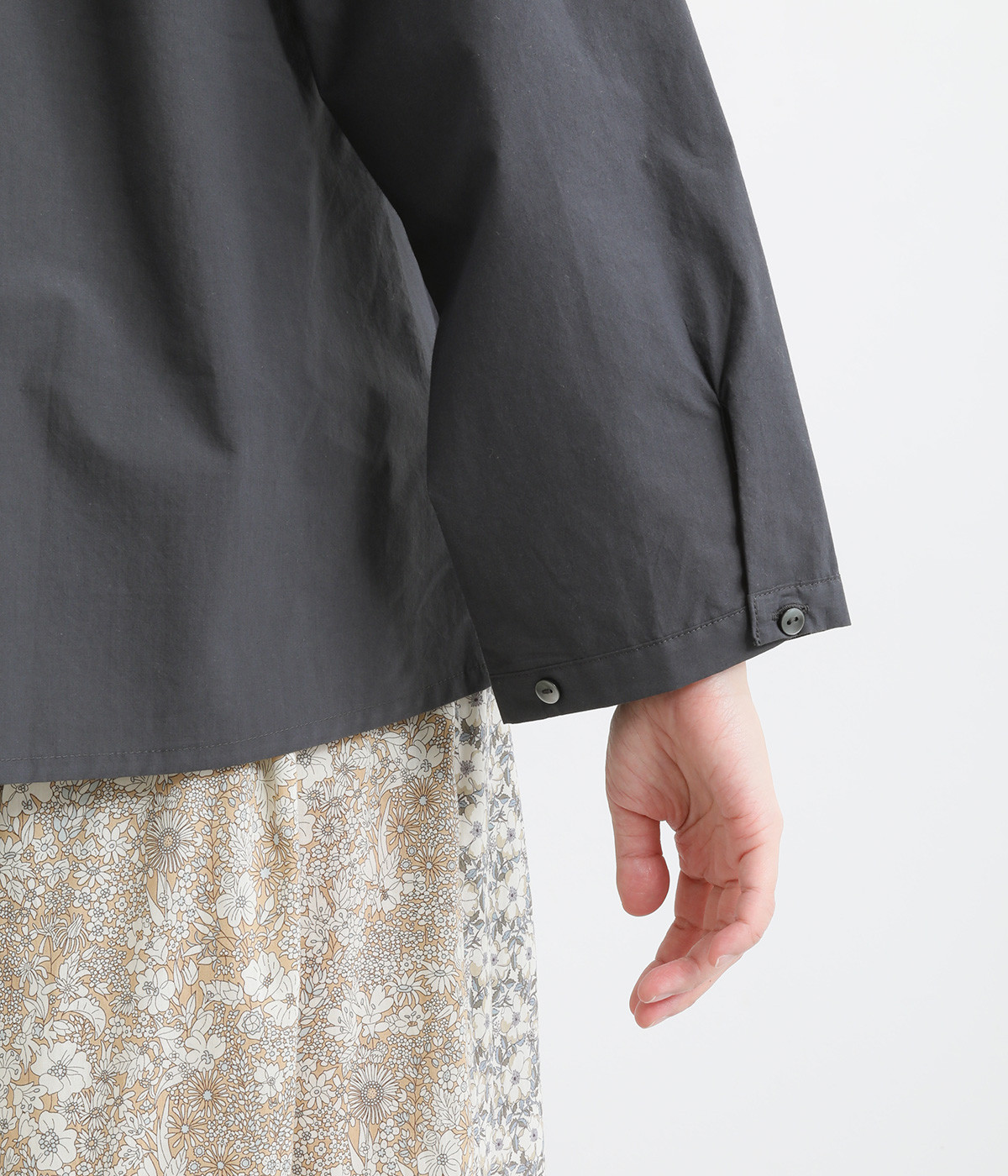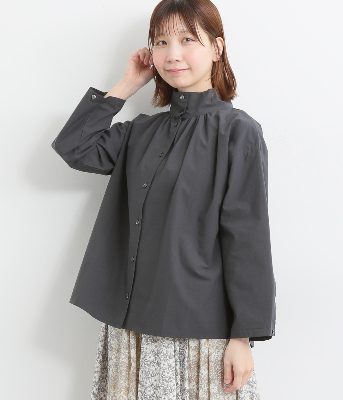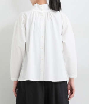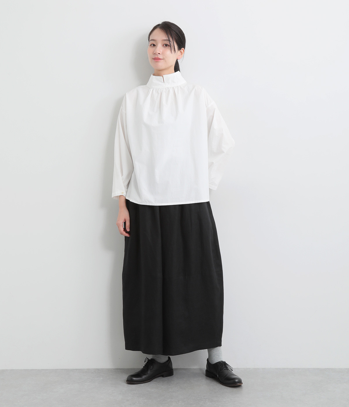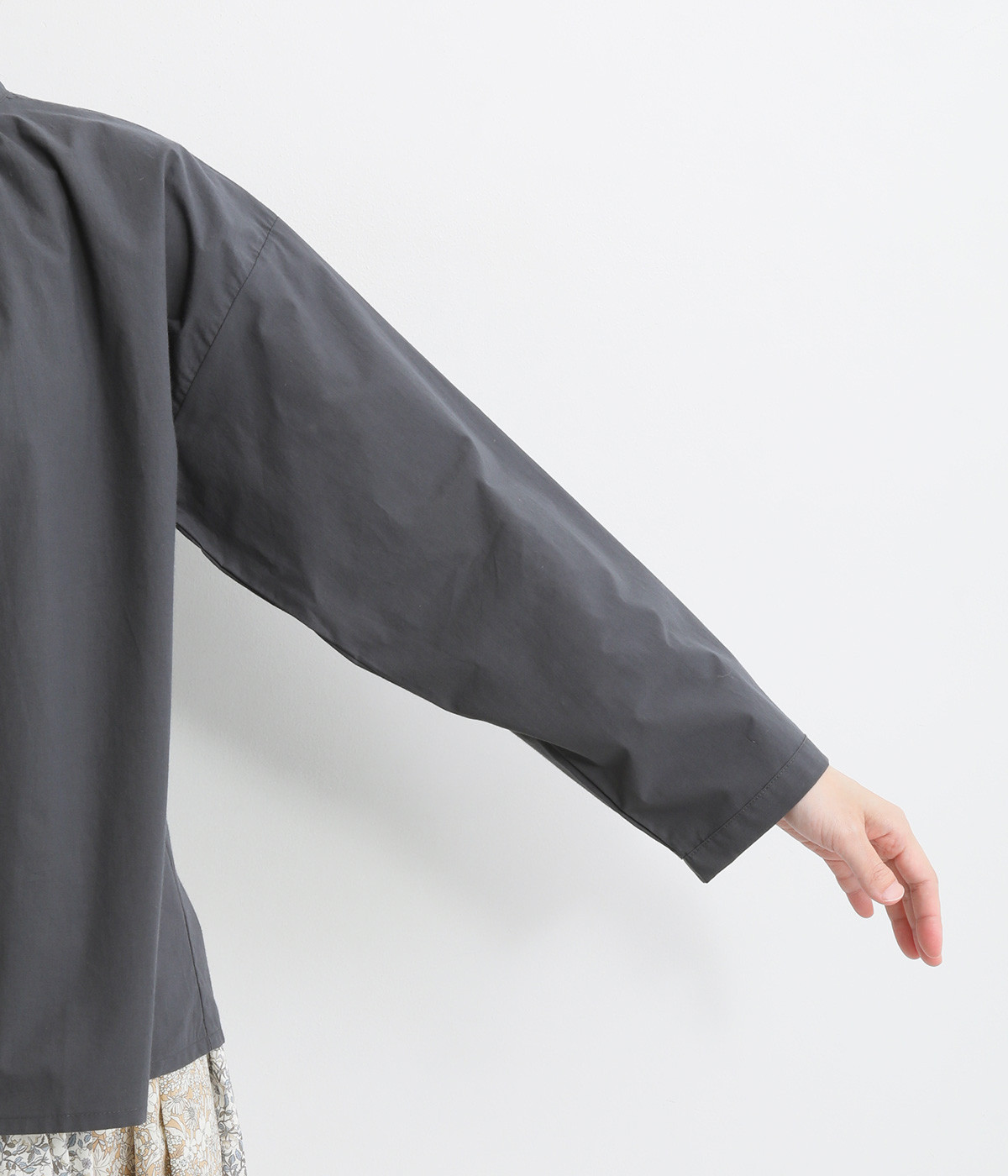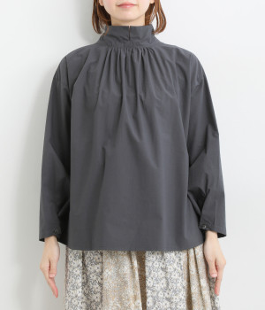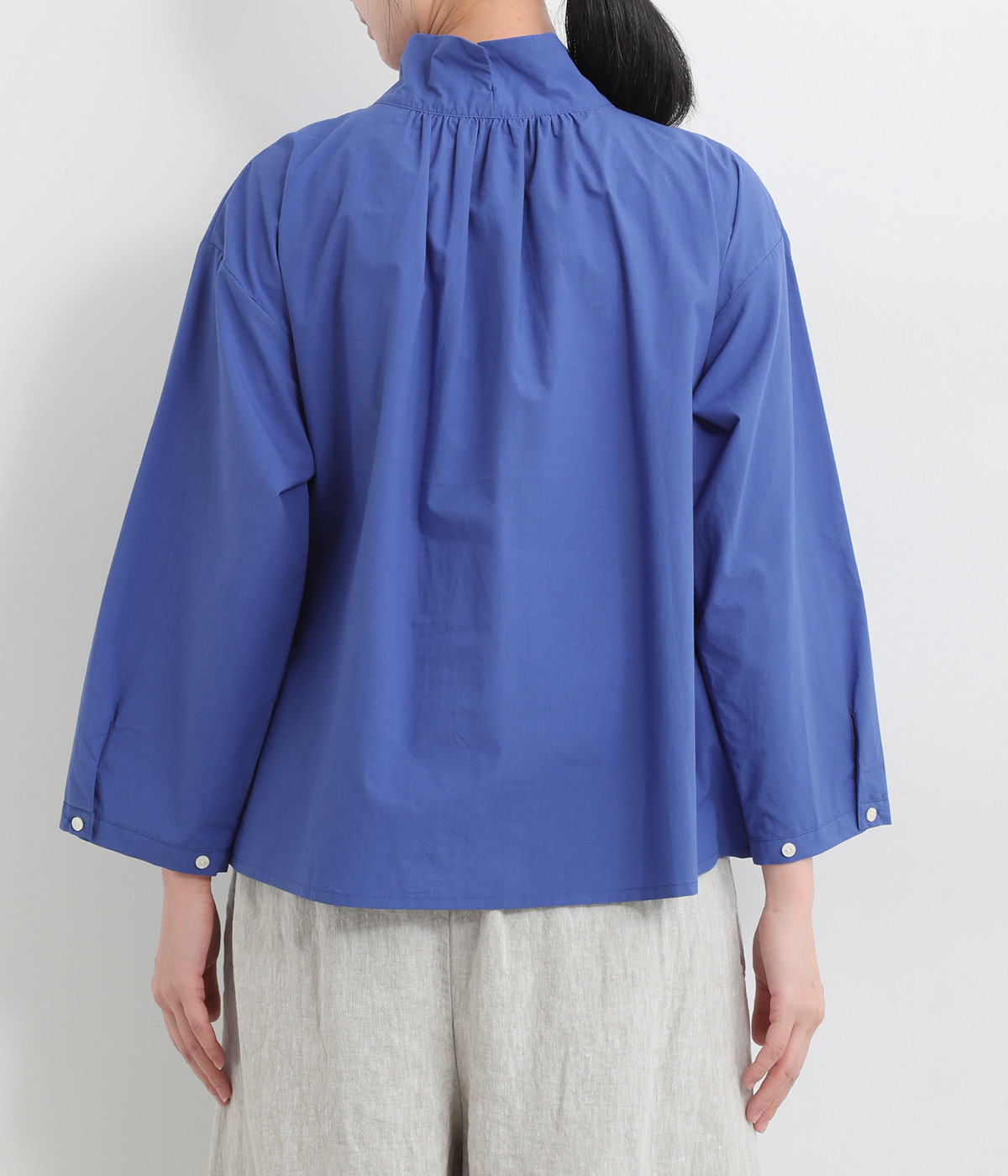 羽織りにしたり後ろボタンにしたりと着まわし力の高まる前後2way仕立てです。大人顔に見せてくれるハイネックは、折り返して襟のように見せても◎。たっぷりと広がった袖はボタンの留め位置でアレンジも楽しめます。