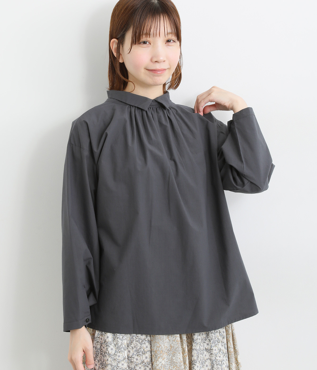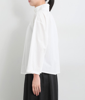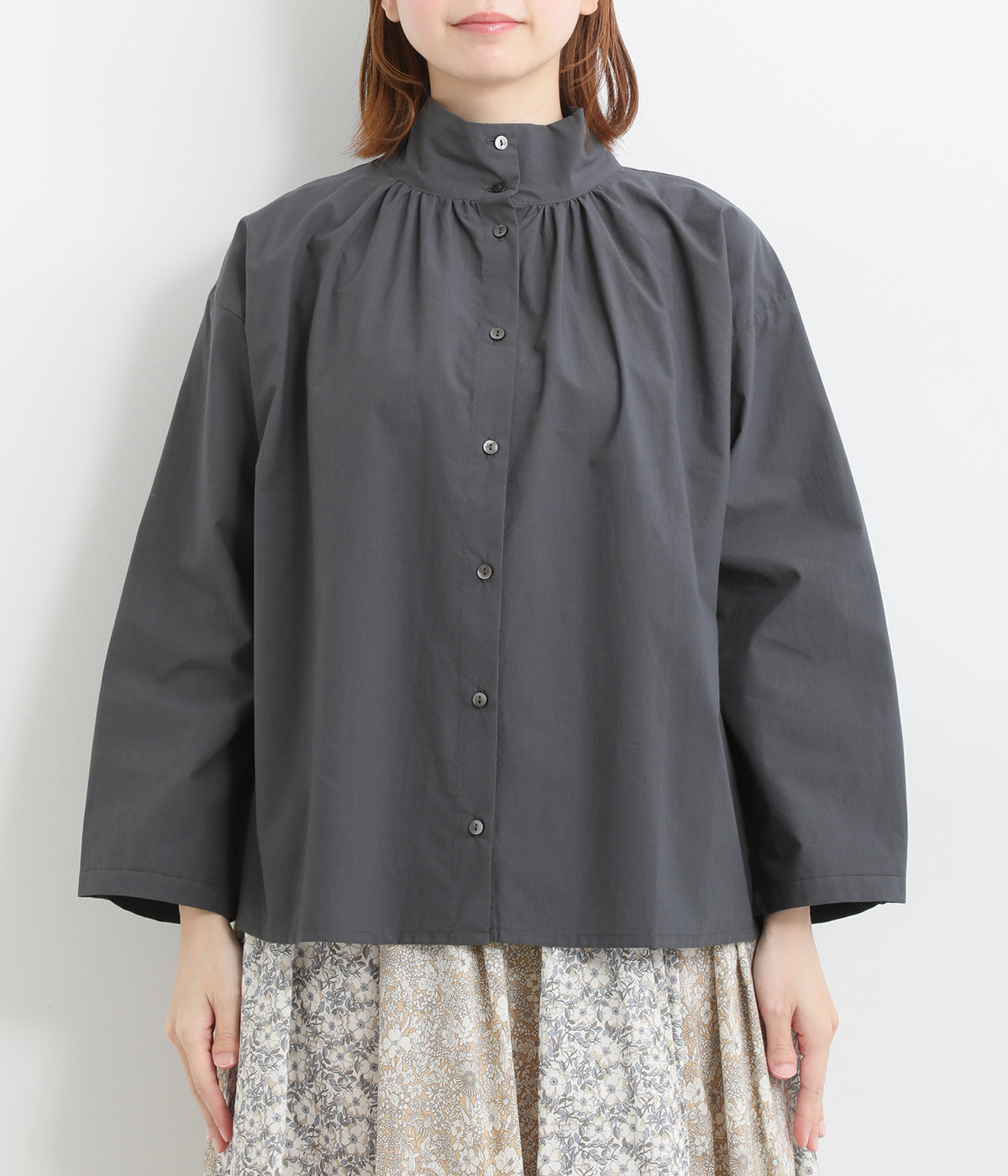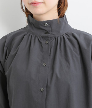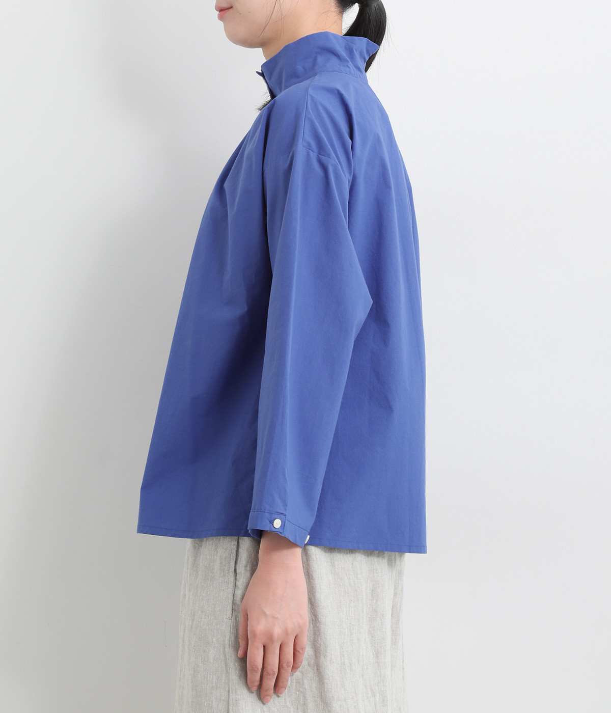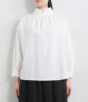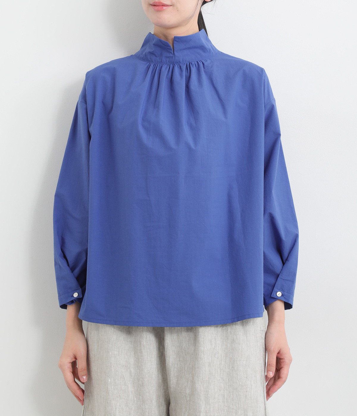 羽織りにしたり後ろボタンにしたりと着まわし力の高まる前後2way仕立てです。大人顔に見せてくれるハイネックは、折り返して襟のように見せても◎。たっぷりと広がった袖はボタンの留め位置でアレンジも楽しめます。