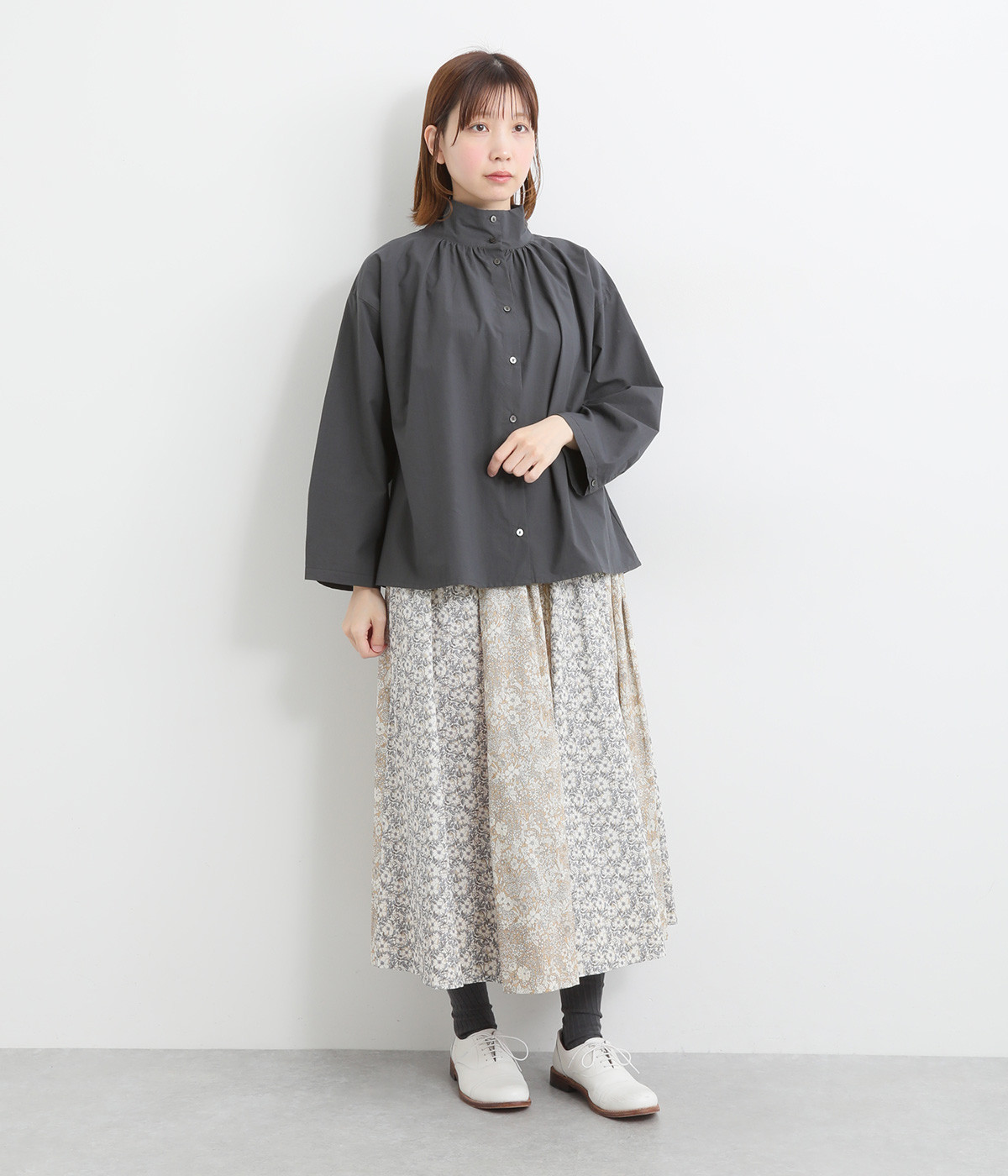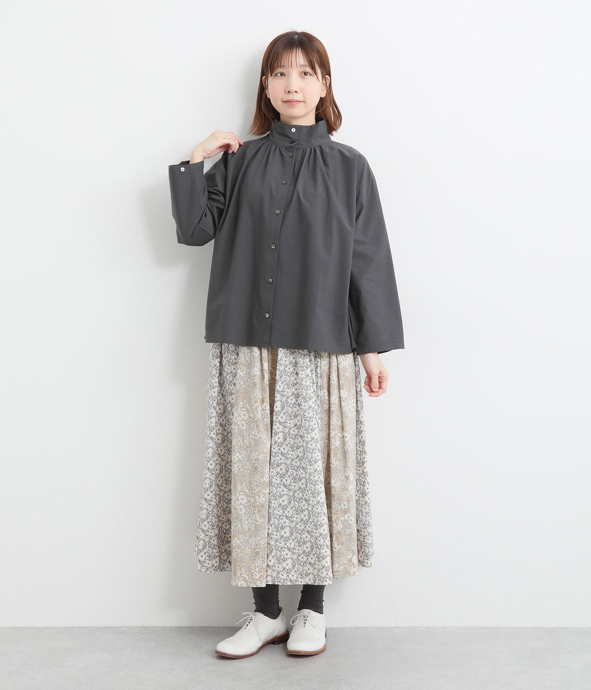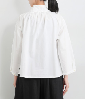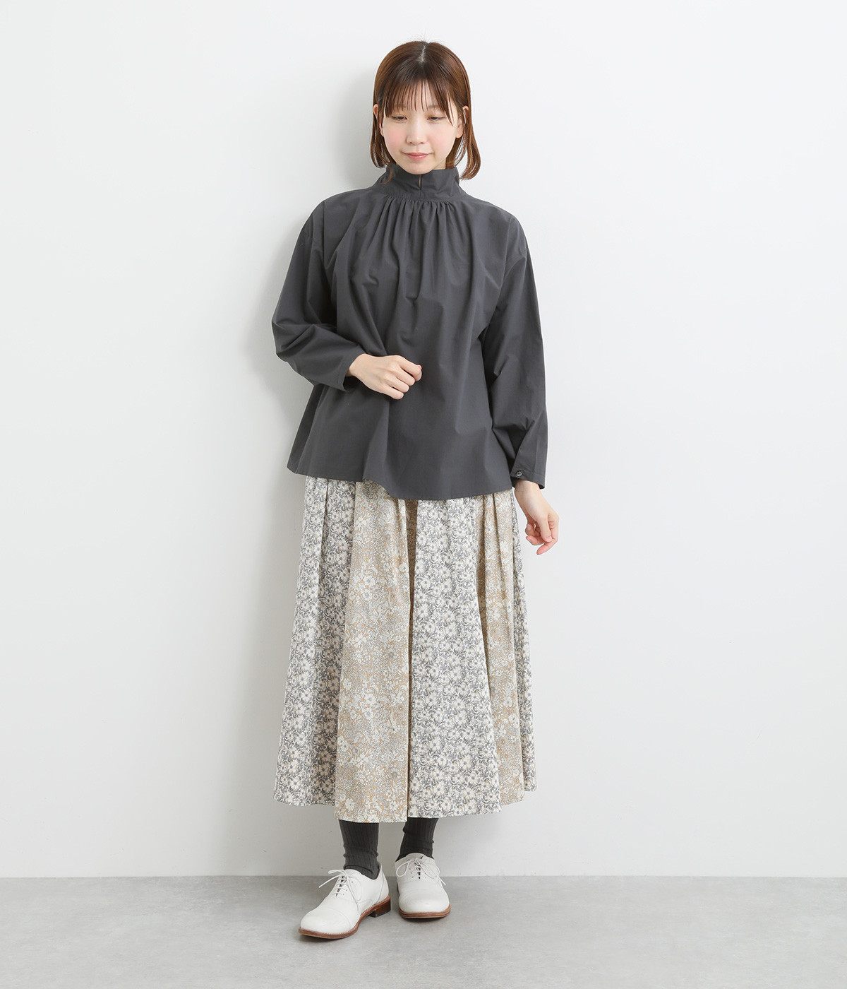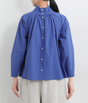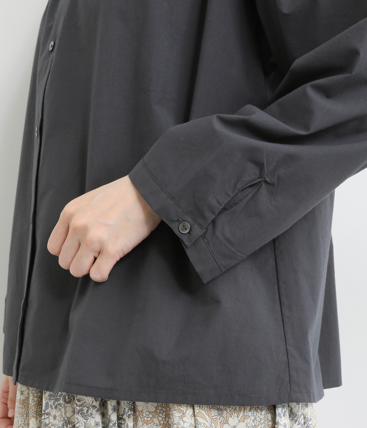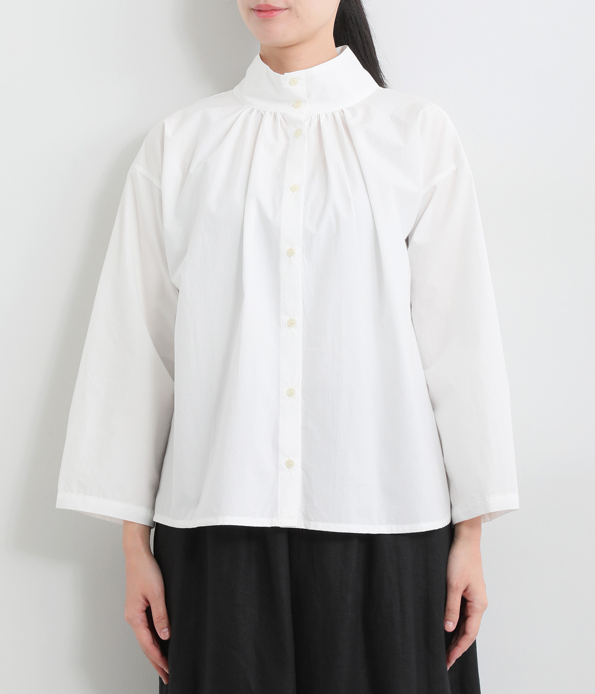 羽織りにしたり後ろボタンにしたりと着まわし力の高まる前後2way仕立てです。大人顔に見せてくれるハイネックは、折り返して襟のように見せても◎。たっぷりと広がった袖はボタンの留め位置でアレンジも楽しめます。