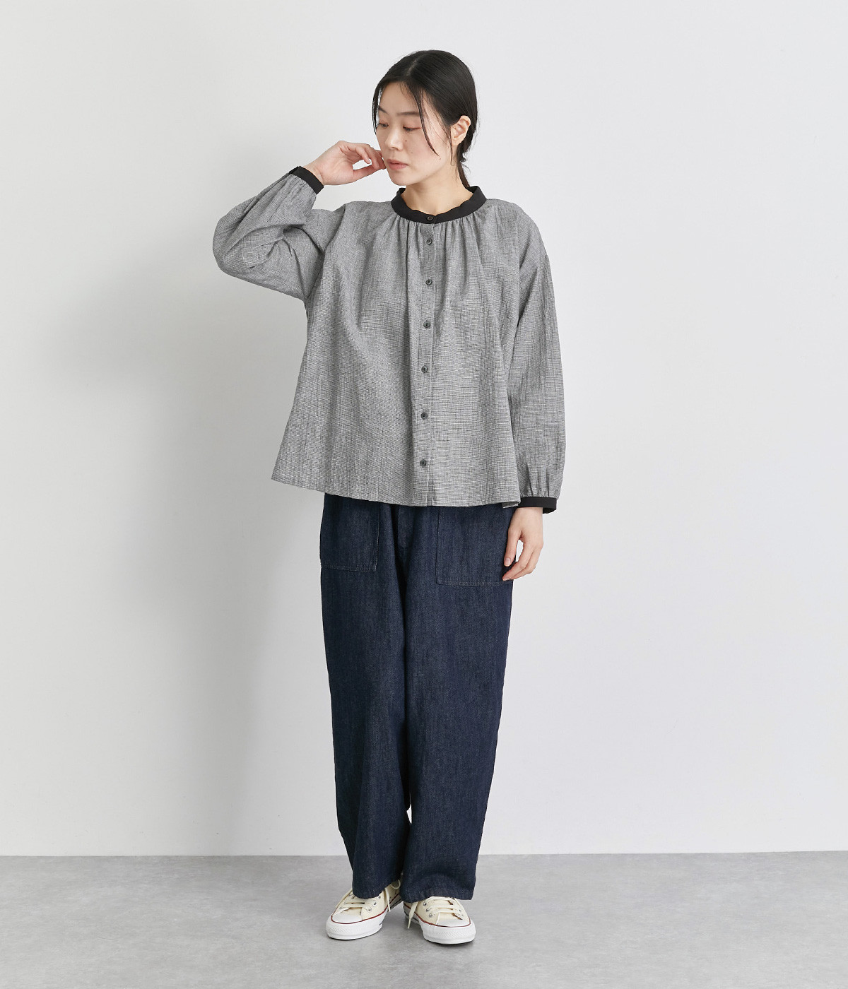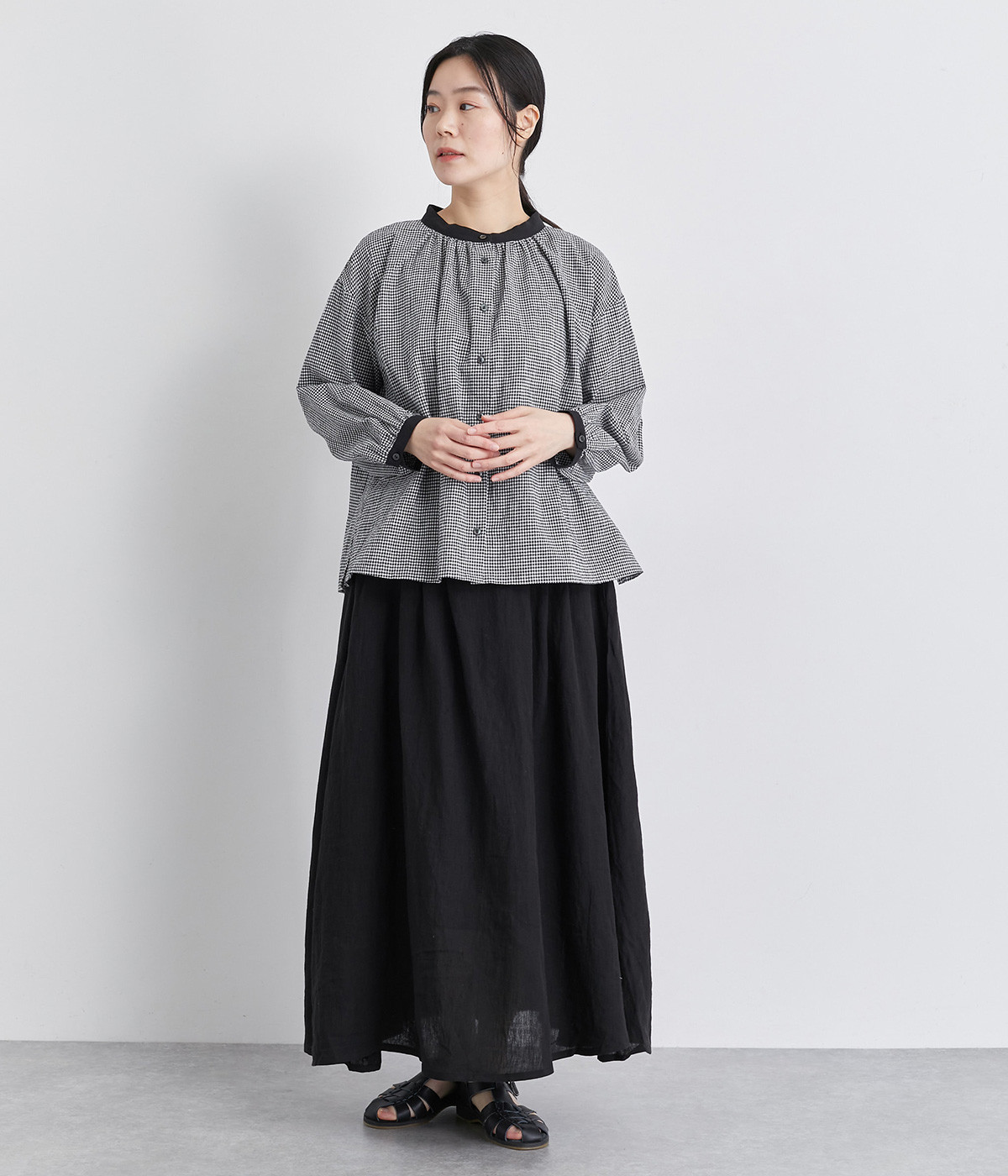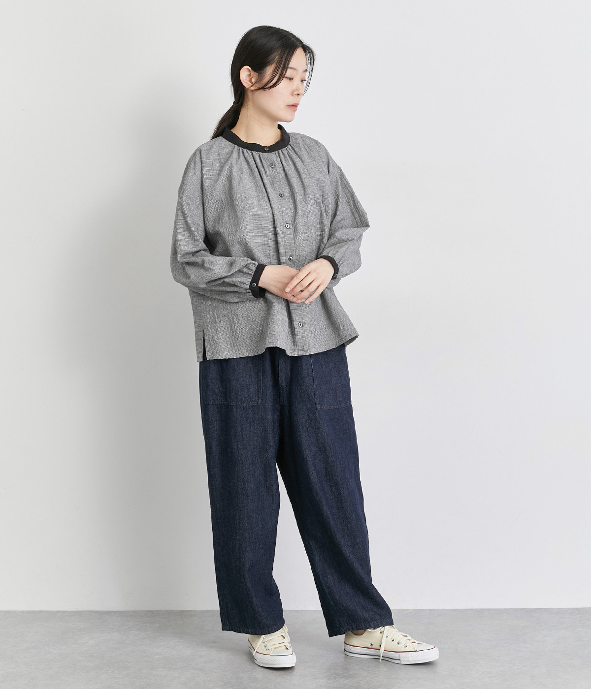 強撚糸のコットンリネン素材で仕立てた、ロングシーズン着まわせるブラウスです。ナチュラル素材ならではの風合いが豊かで、ほどよくふくらみもあり心地よい着用感も魅力のひとつ。