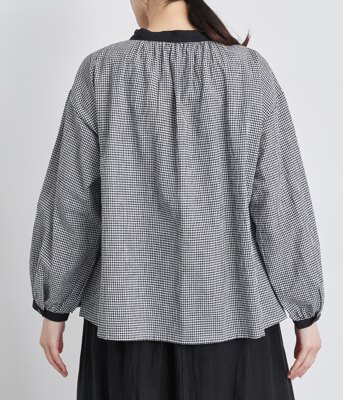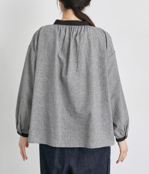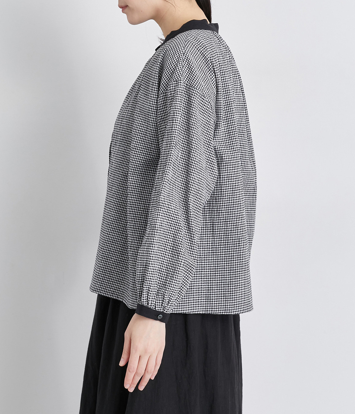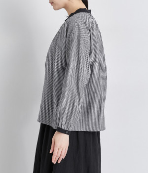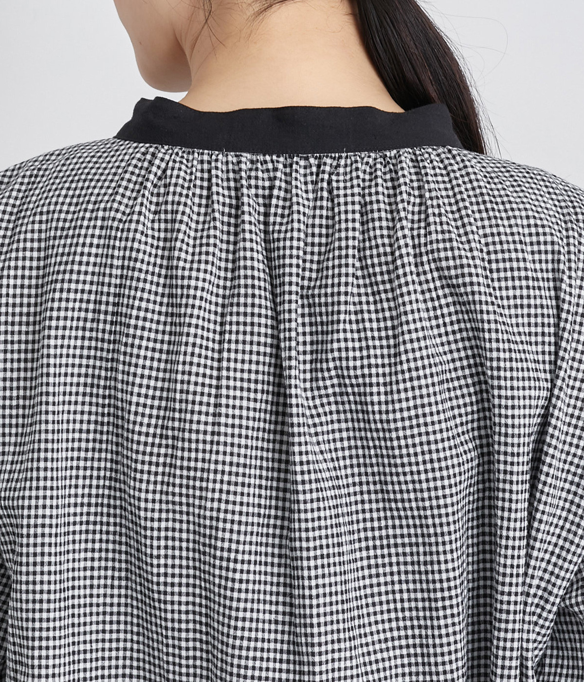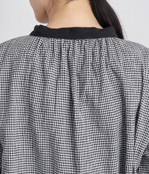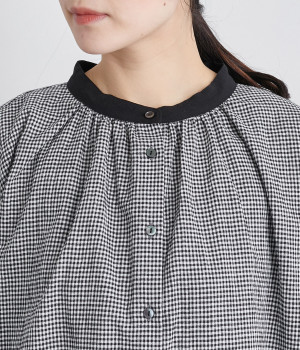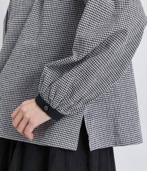 着こなしのポイントになるチェック柄に、ブラック無地のバイカラーでメリハリをつけました。襟ぐりにギャザーを寄せてゆったりと着られ、サイドスリットで適度な抜け感も◎。ほのかにきらめくボタンのコントラストもきいています。