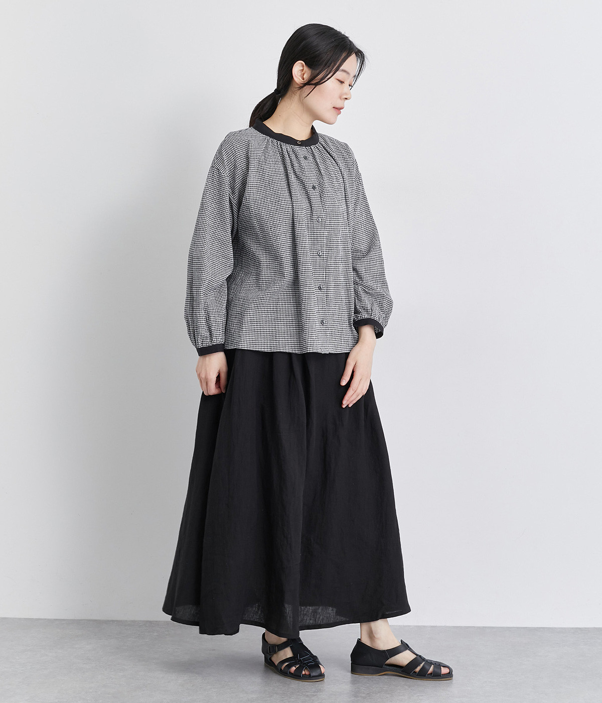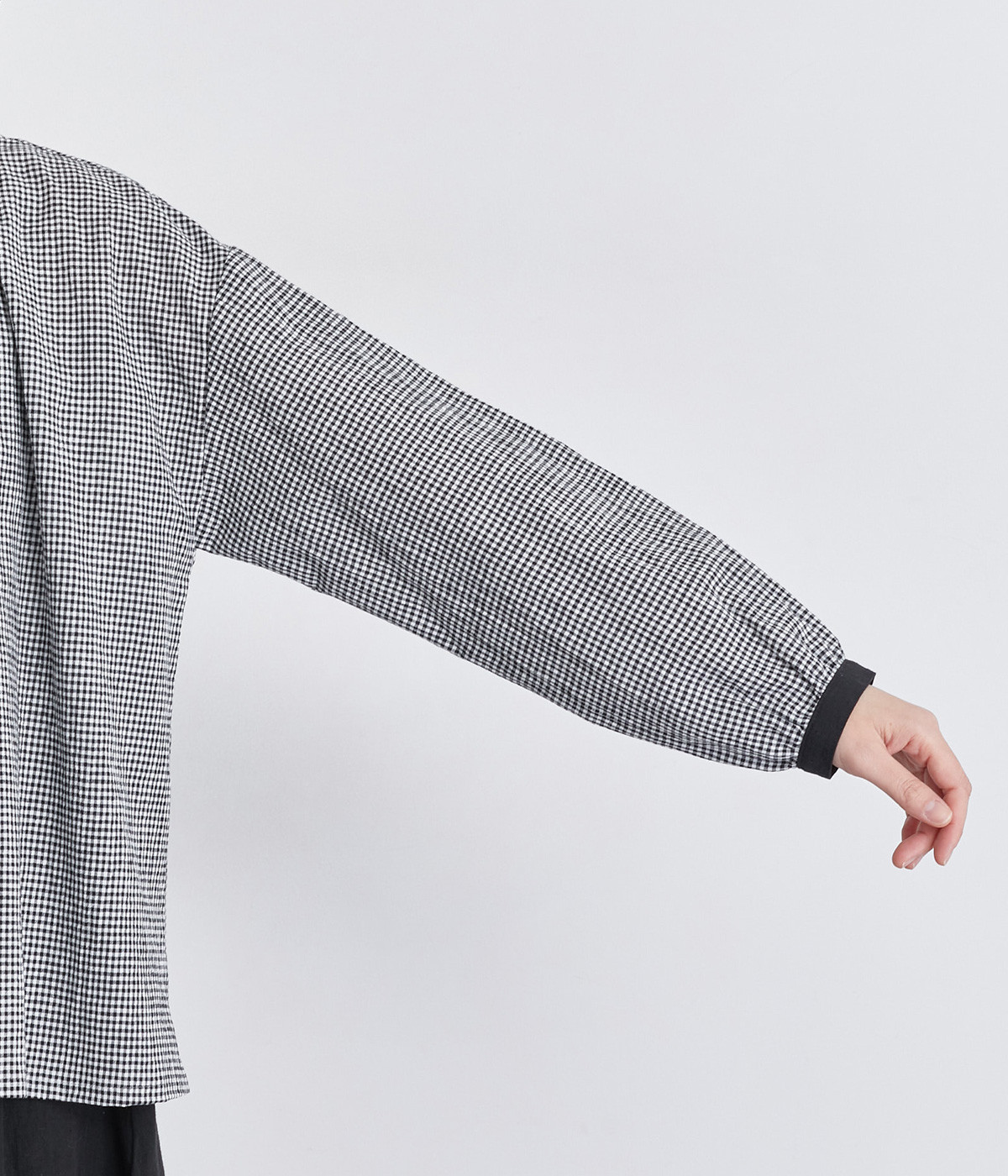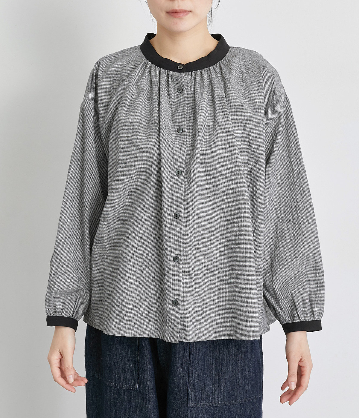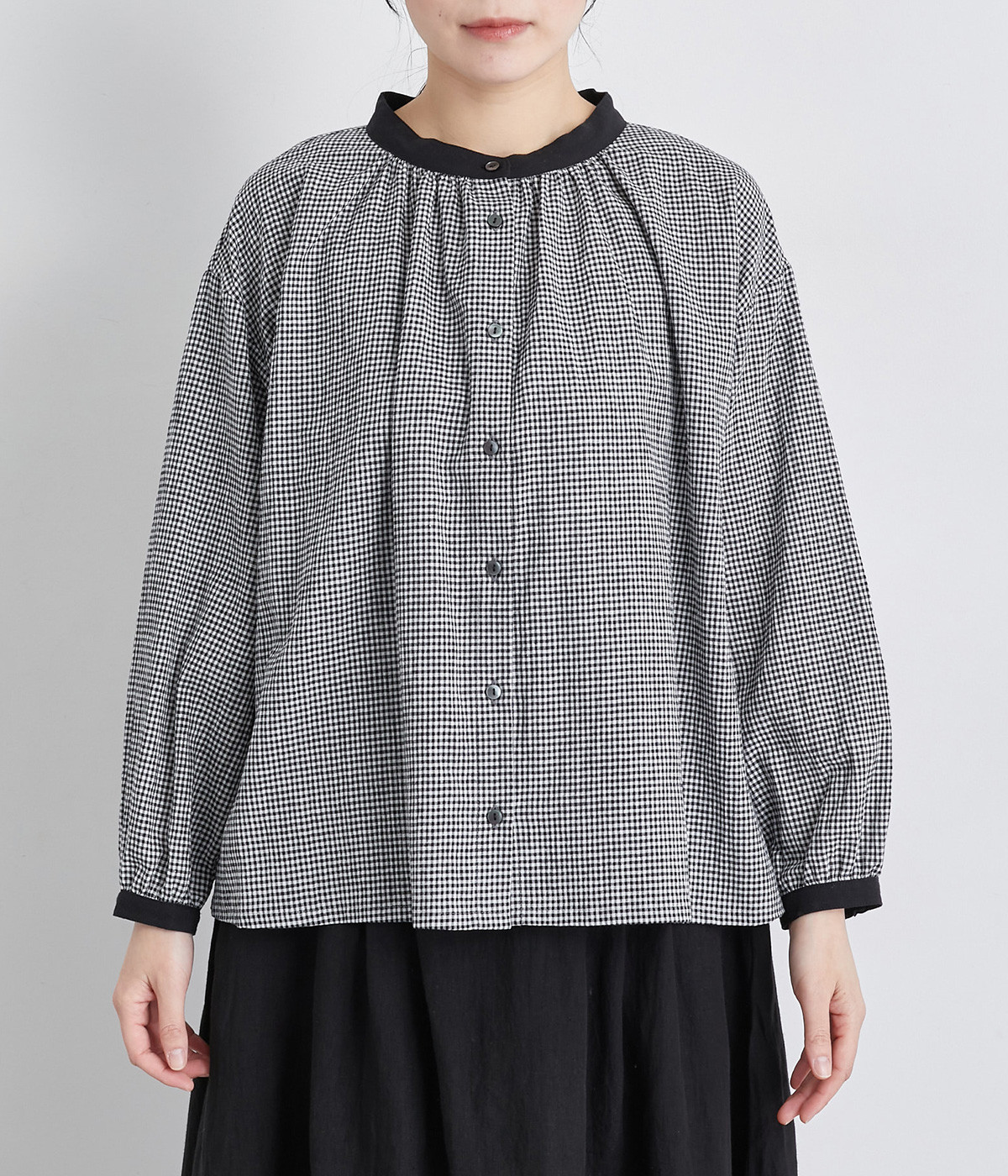 着こなしのポイントになるチェック柄に、ブラック無地のバイカラーでメリハリをつけました。襟ぐりにギャザーを寄せてゆったりと着られ、サイドスリットで適度な抜け感も◎。ほのかにきらめくボタンのコントラストもきいています。