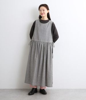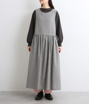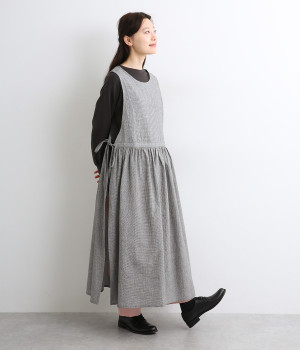 いつもの着こなしに重ねる、横を結ぶタイプのエプロンワンピース。サイドが大きく抜けているので、コーディネートが軽やかにまとまります。ウエストの切り替えには細やかなギャザーをたっぷりとほどこし、ふんわりとしたシルエットを作り出します。