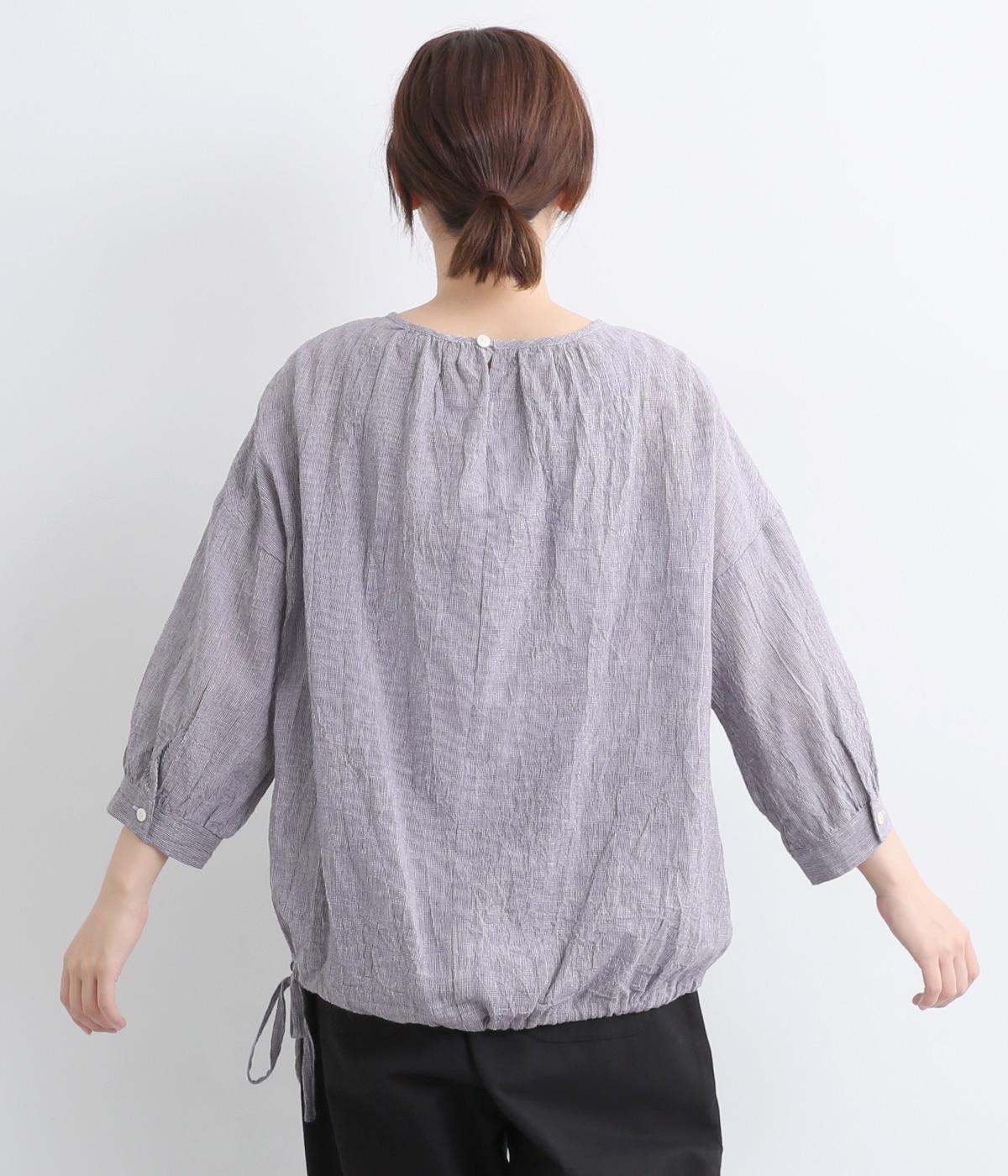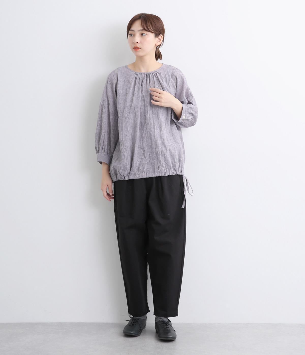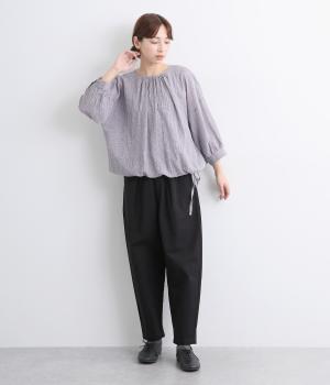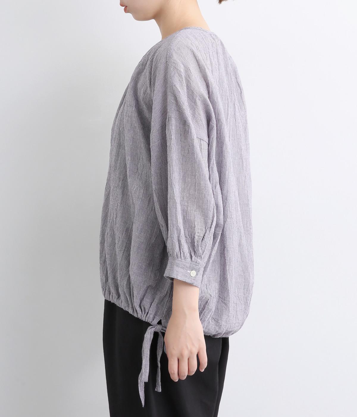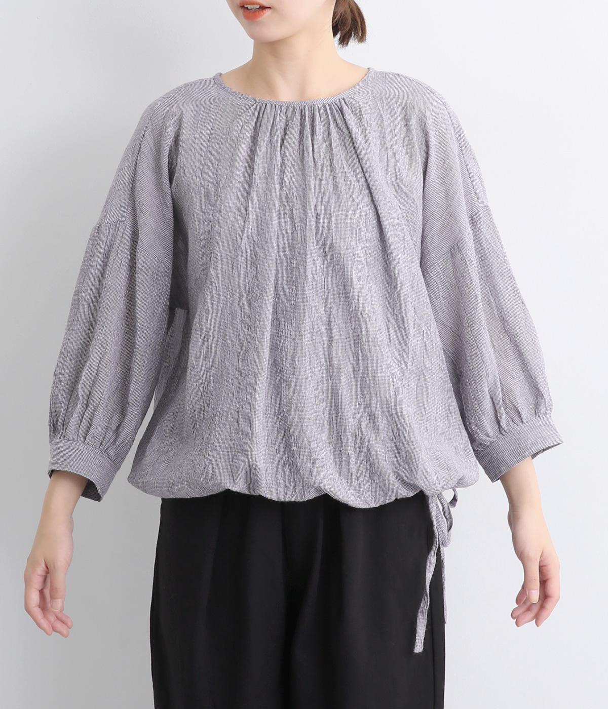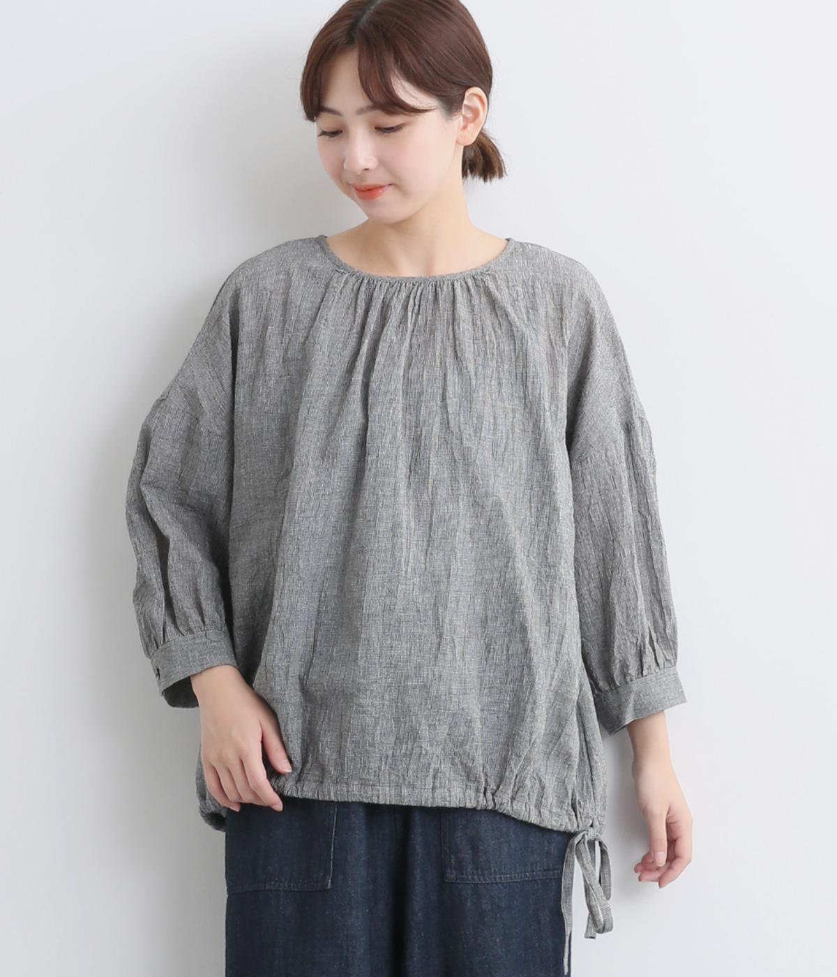 襟ぐりや袖口にギャザーを寄せてふわりとガーリーテイストなシルエットに仕立てました。裾はサイドのリボンを結ぶことでアレンジもたのしめます。手元がすっきり見える7分袖で適度に抜け感を加えてバランス良く着こなせます。