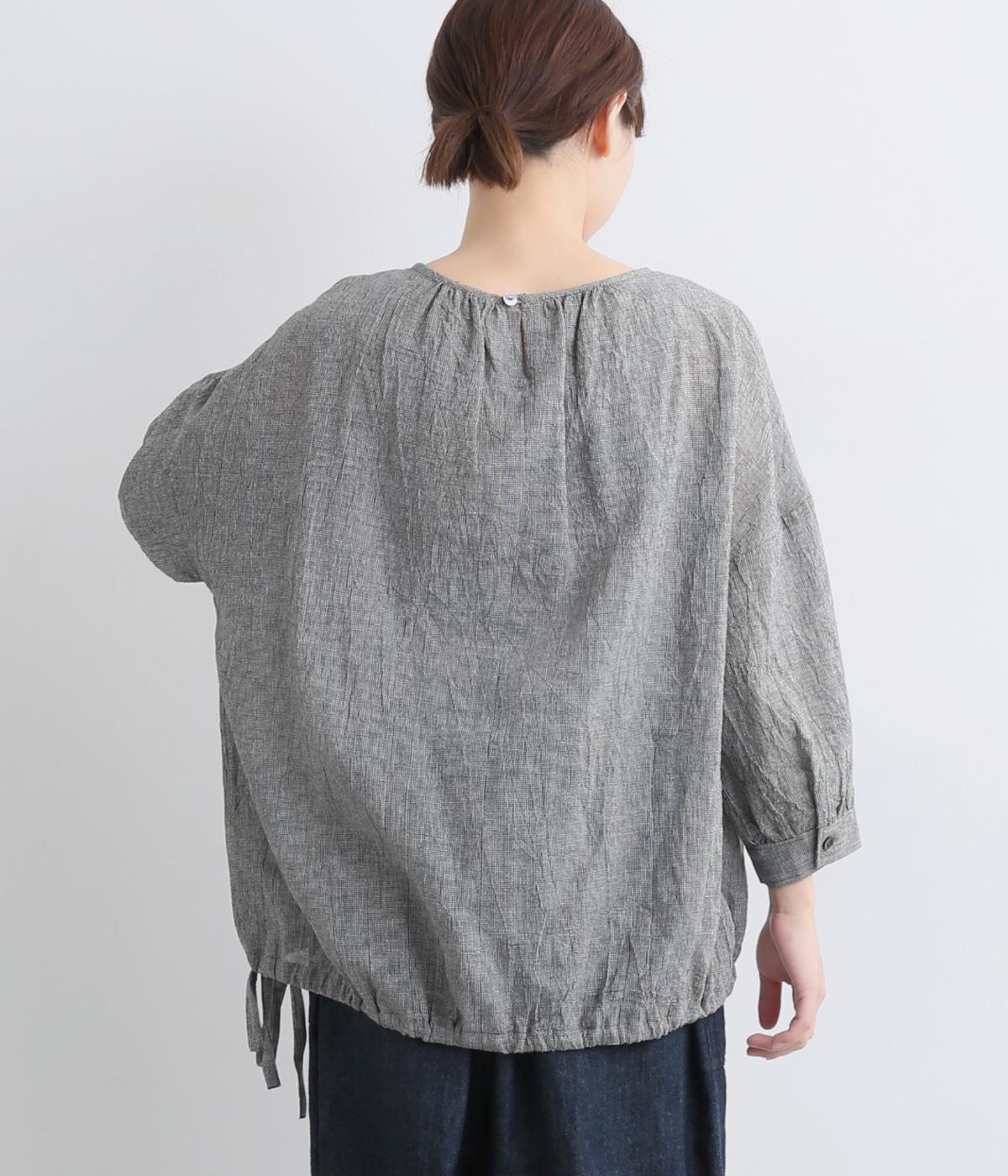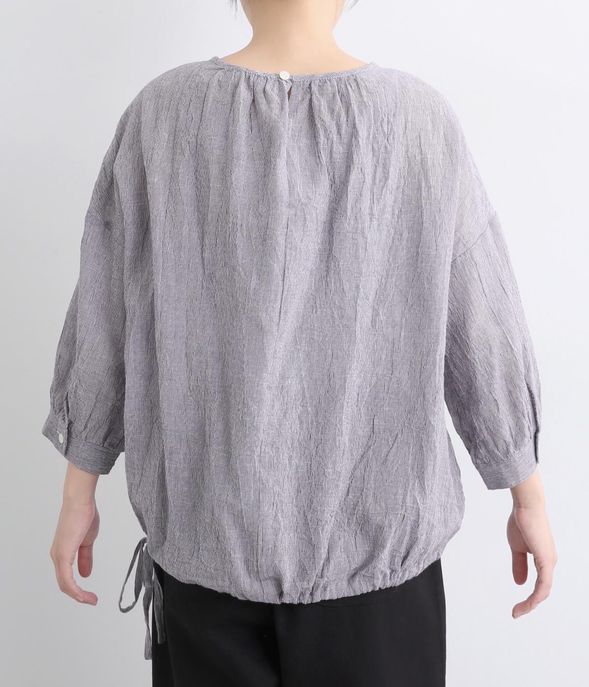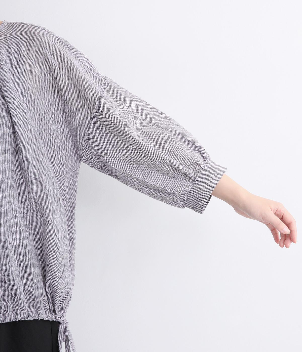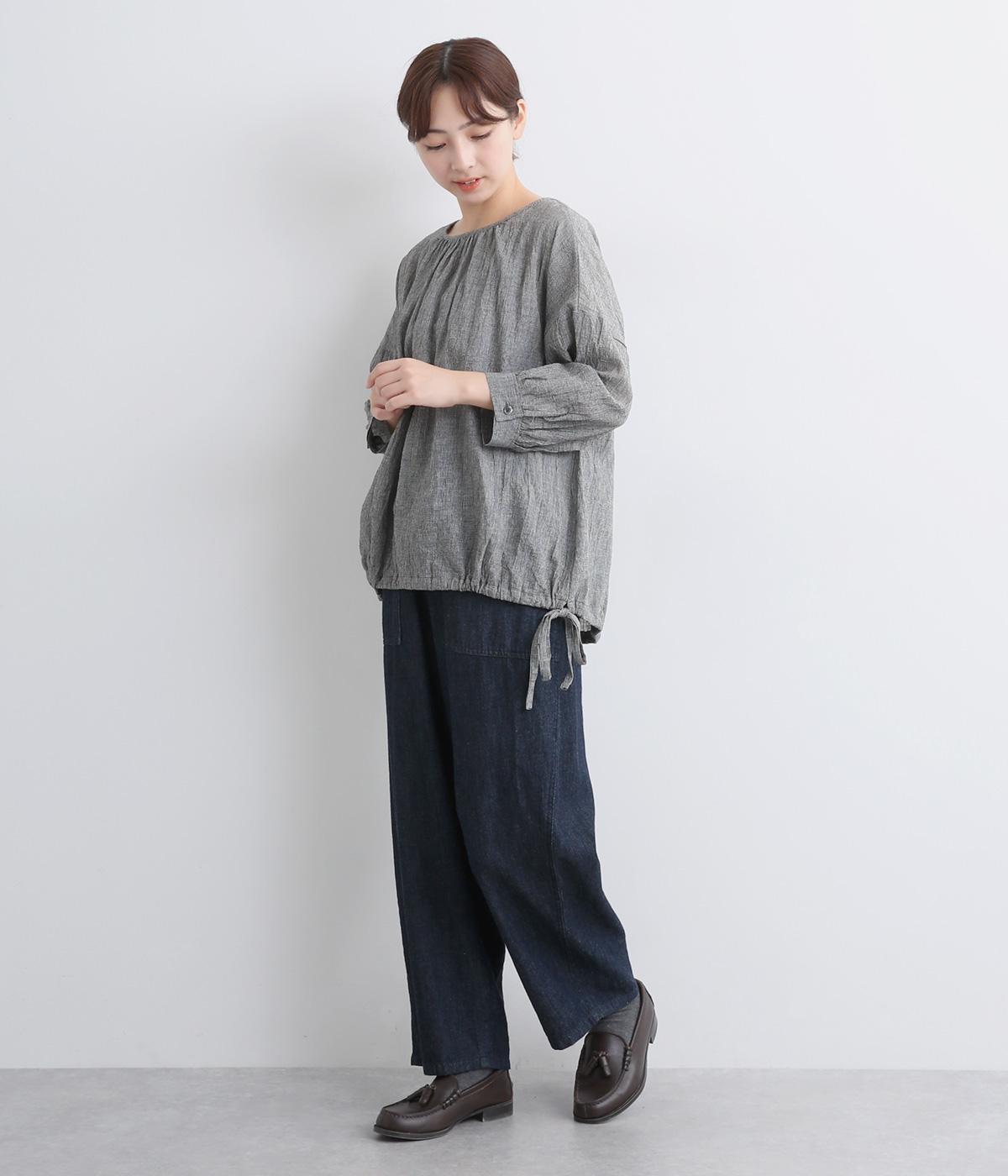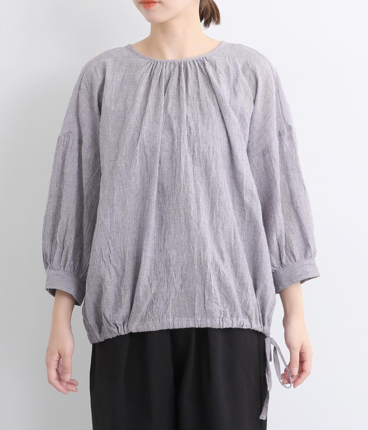 襟ぐりや袖口にギャザーを寄せてふわりとガーリーテイストなシルエットに仕立てました。裾はサイドのリボンを結ぶことでアレンジもたのしめます。手元がすっきり見える7分袖で適度に抜け感を加えてバランス良く着こなせます。