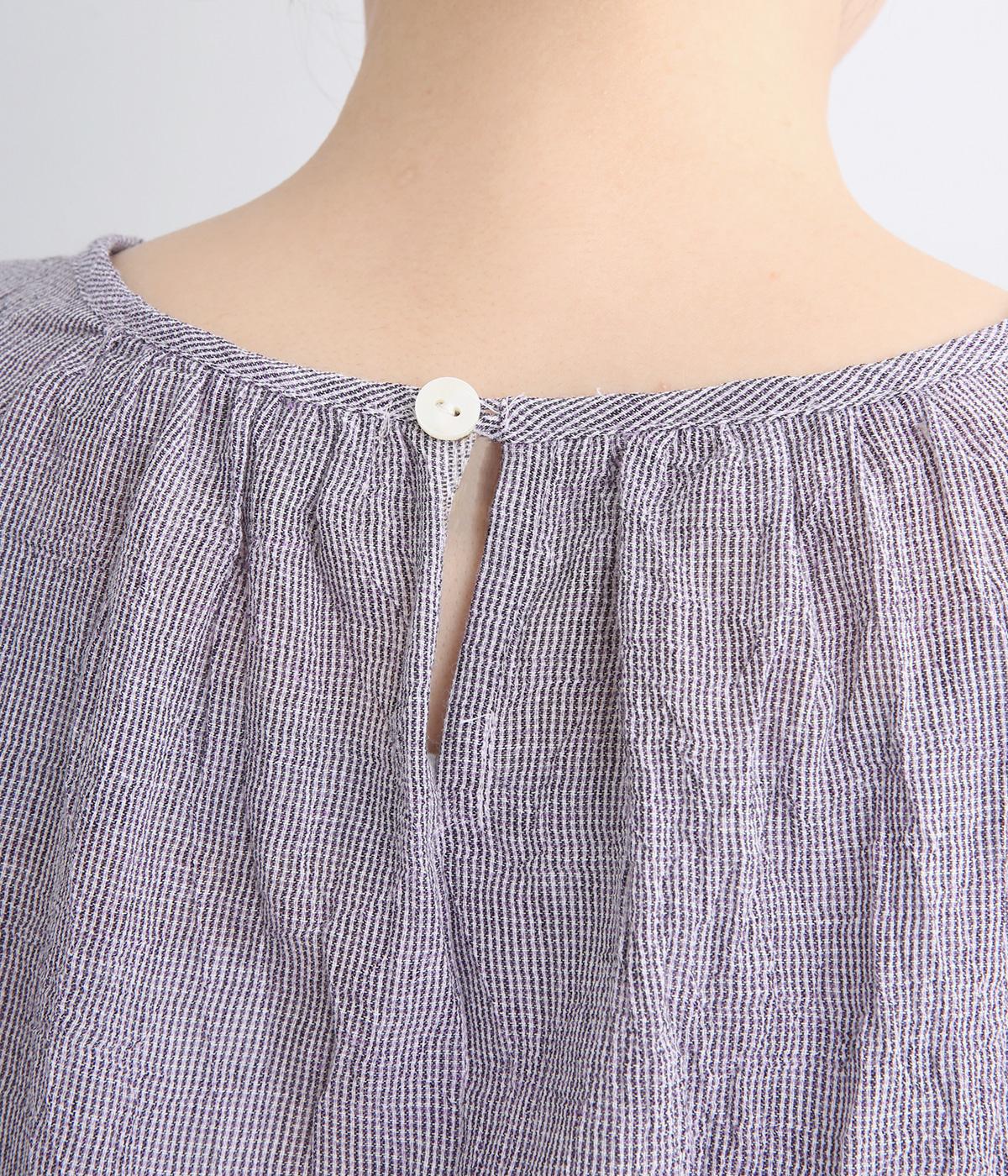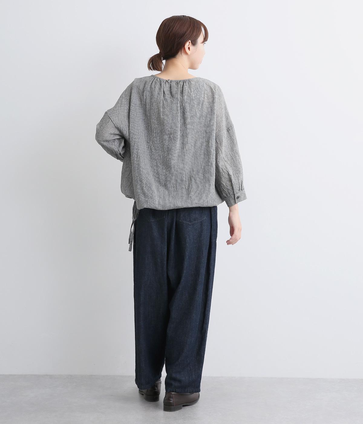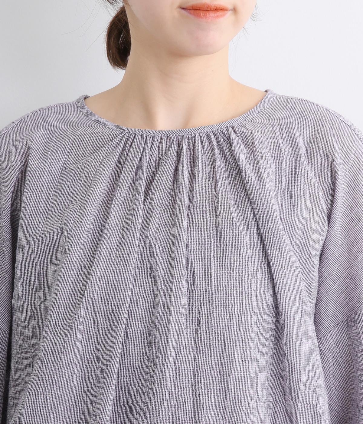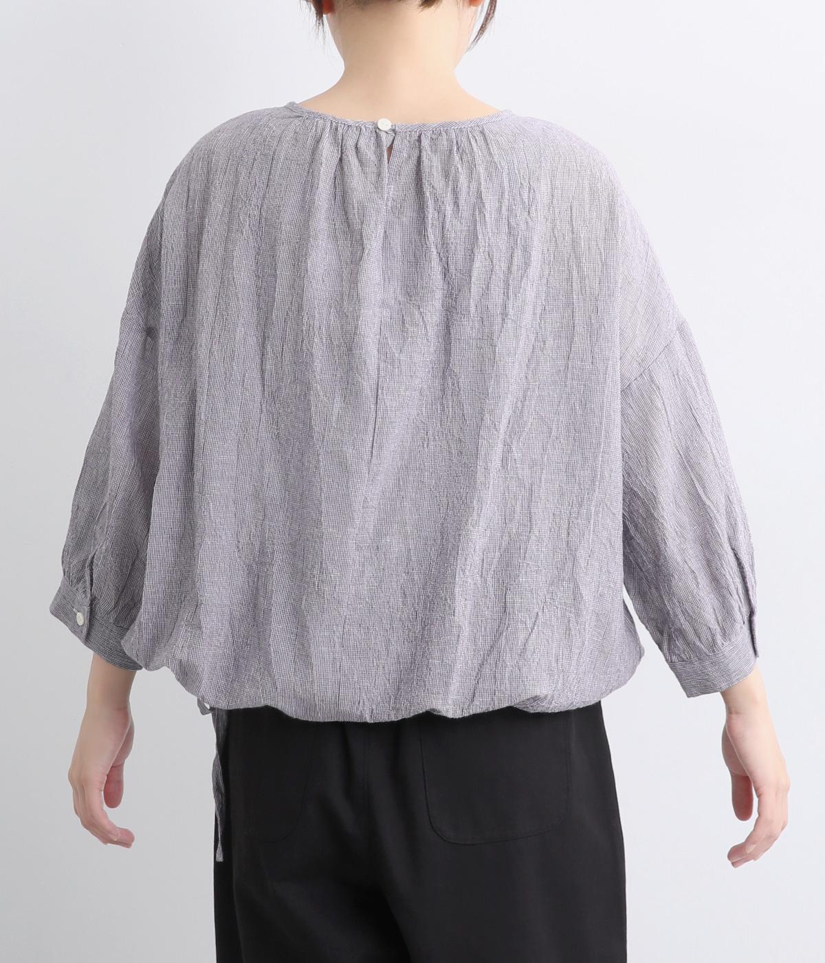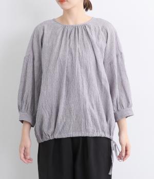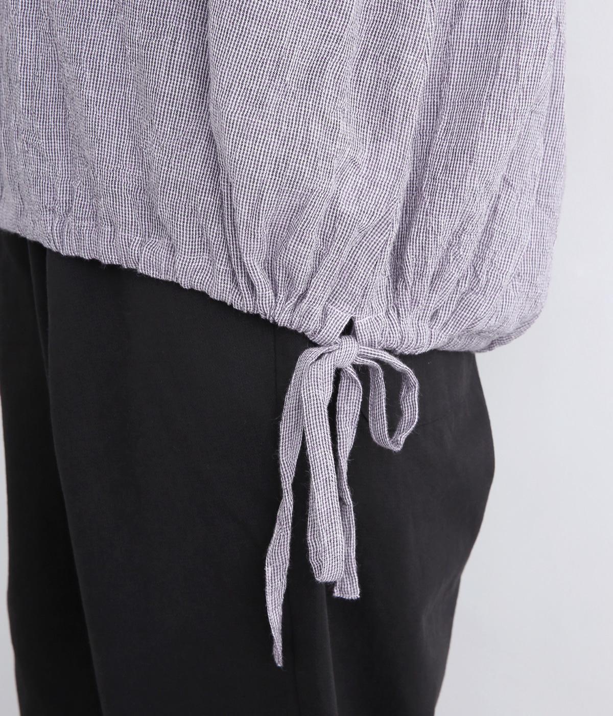 襟ぐりや袖口にギャザーを寄せてふわりとガーリーテイストなシルエットに仕立てました。裾はサイドのリボンを結ぶことでアレンジもたのしめます。手元がすっきり見える7分袖で適度に抜け感を加えてバランス良く着こなせます。