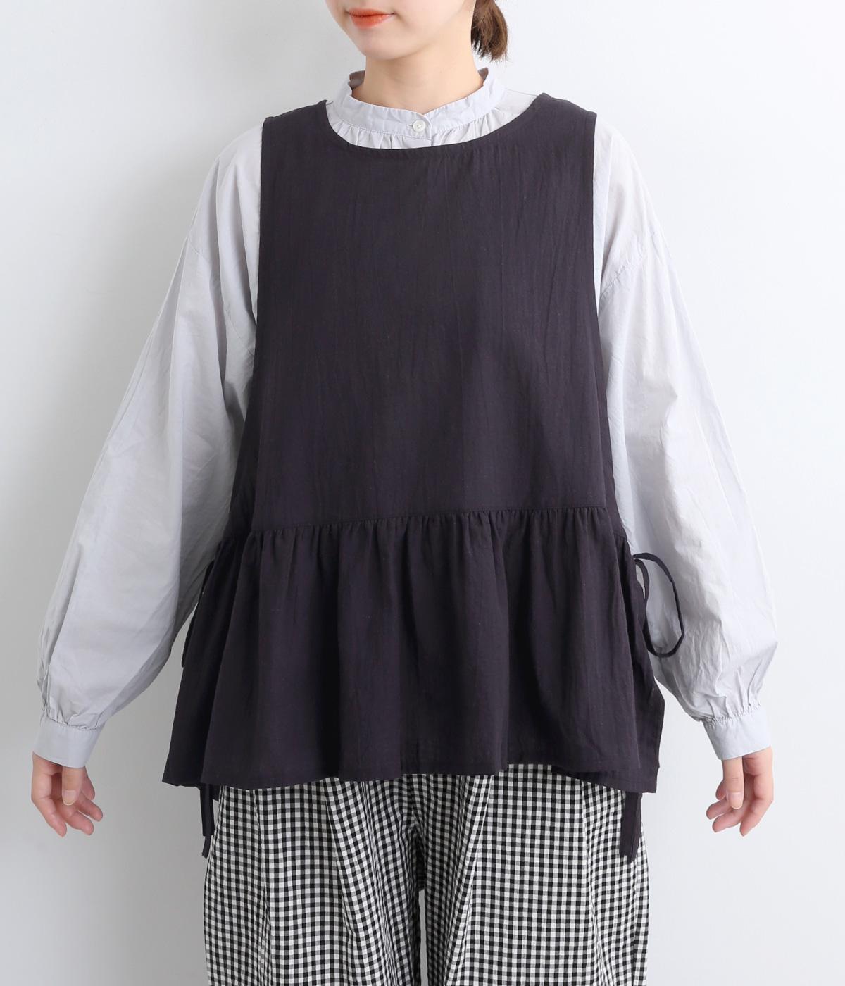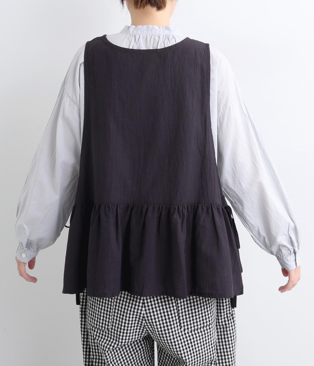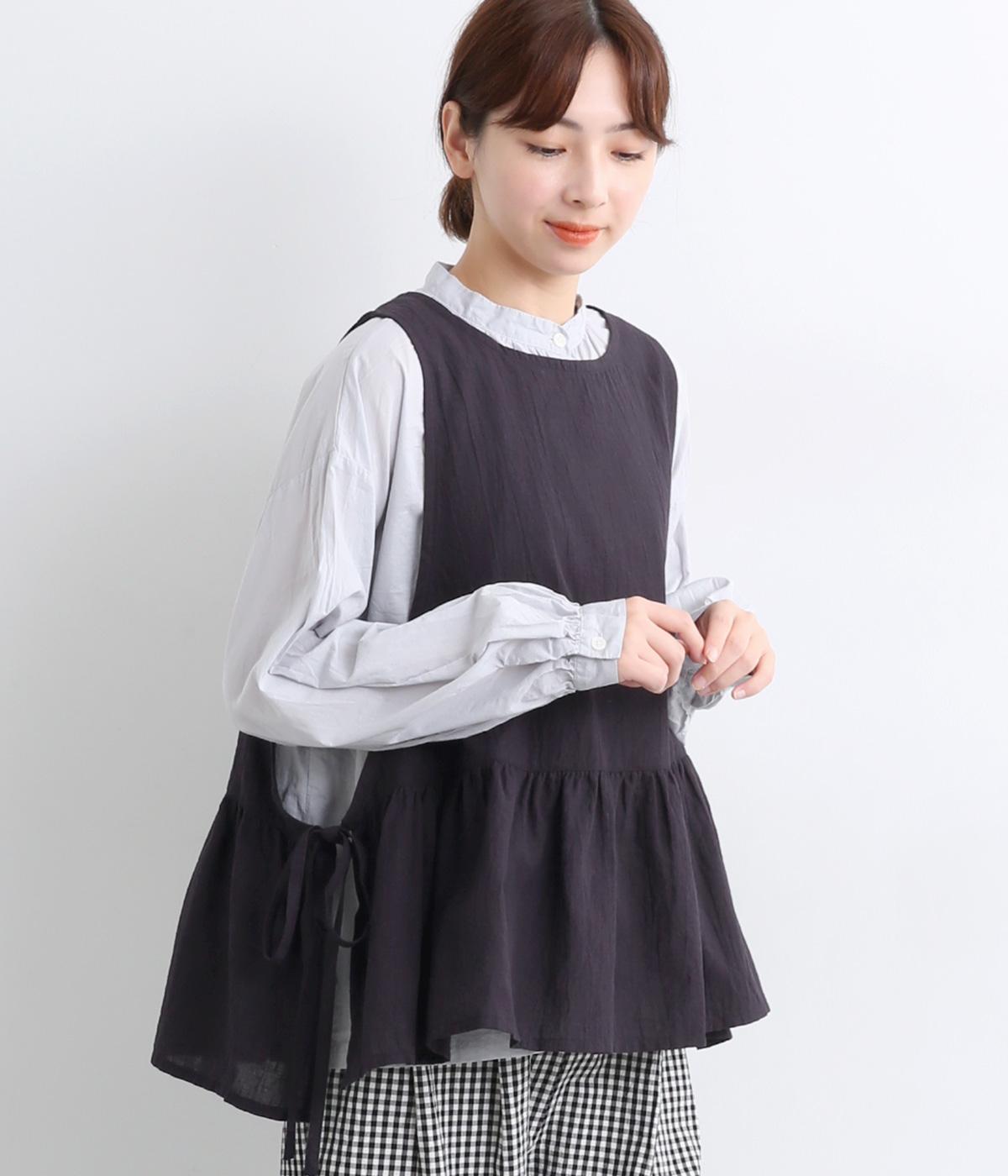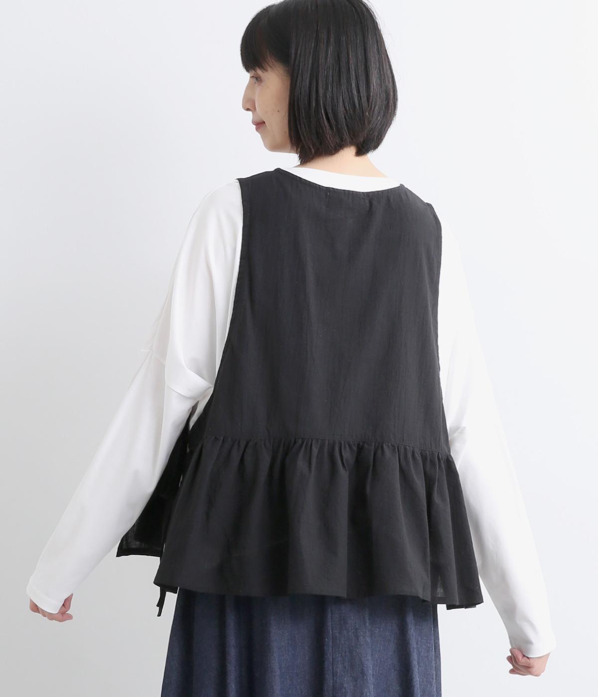 サイドリボンにギャザーのフレア感でフェミニンテイストなデザインのベスト。ナチュラル素材で甘すぎることなく、デイリースタイルに取り入れやすく仕上がっています。アームホールが広いのでドルマンシルエットなどさまざまなアイテムと好相性。