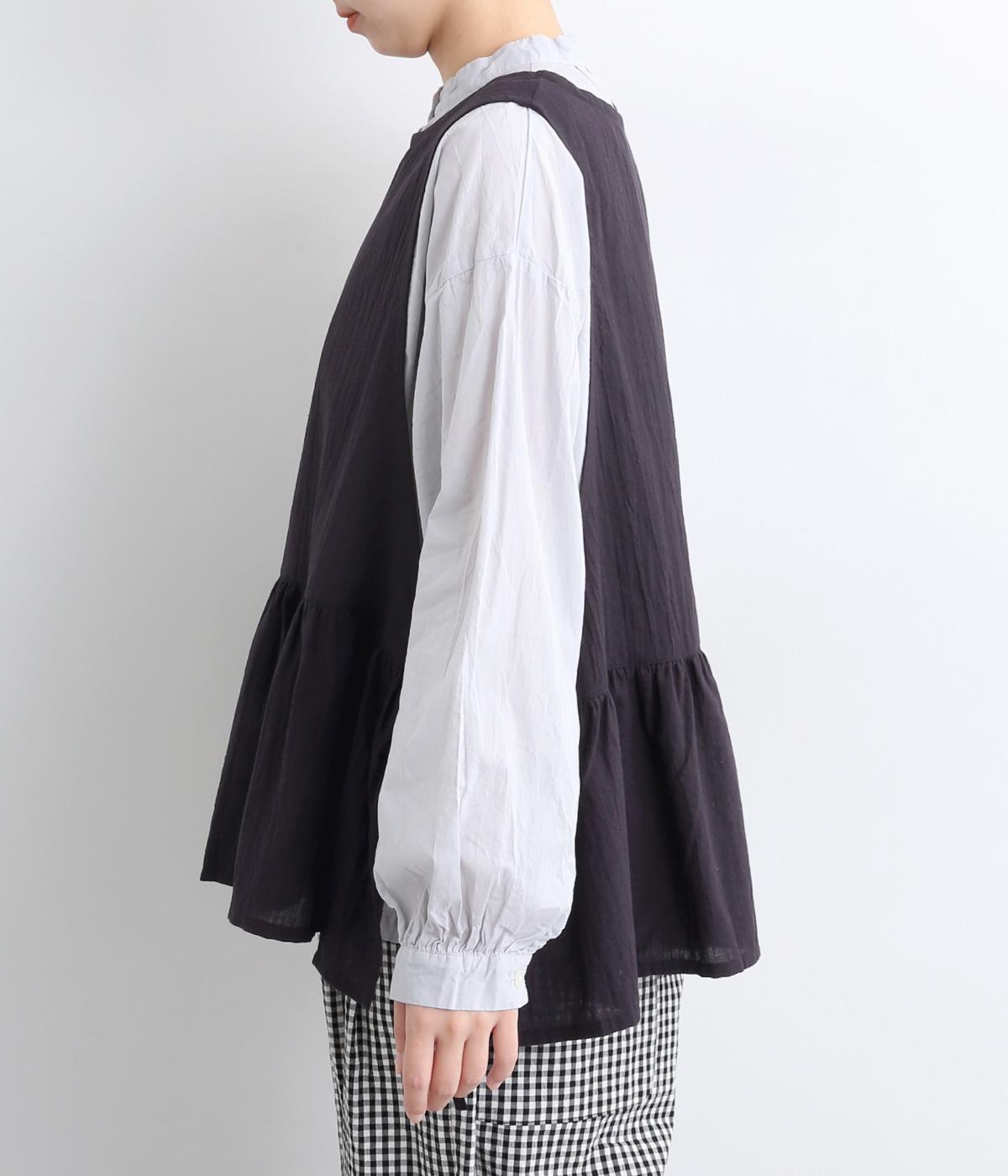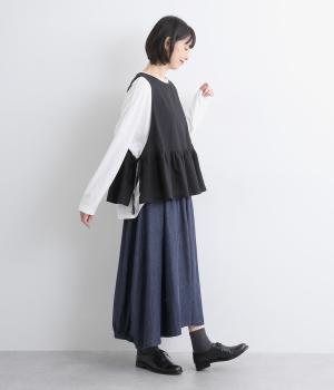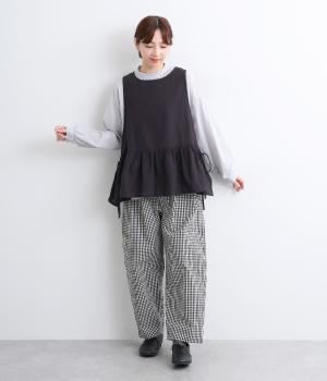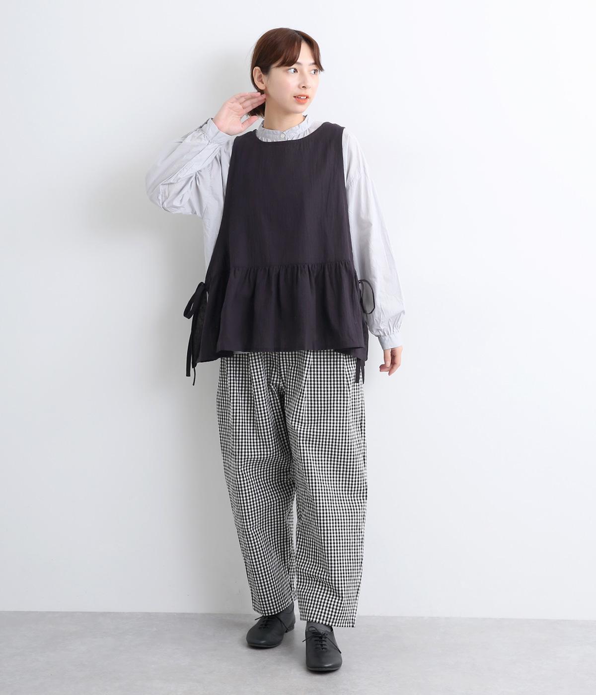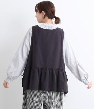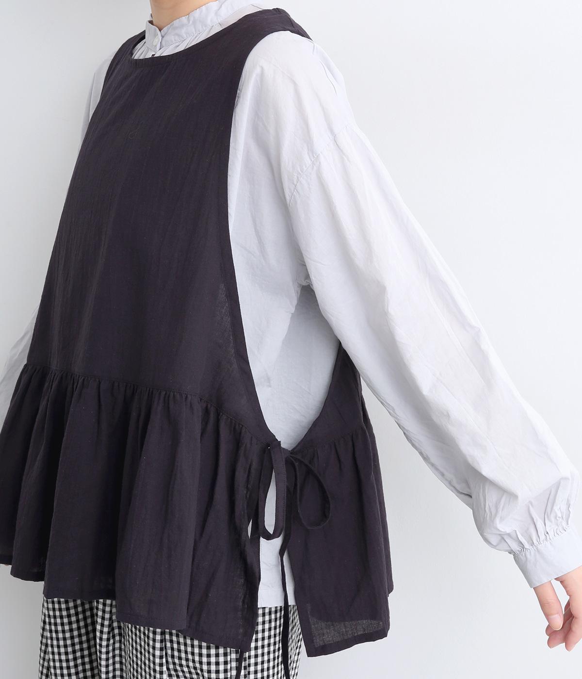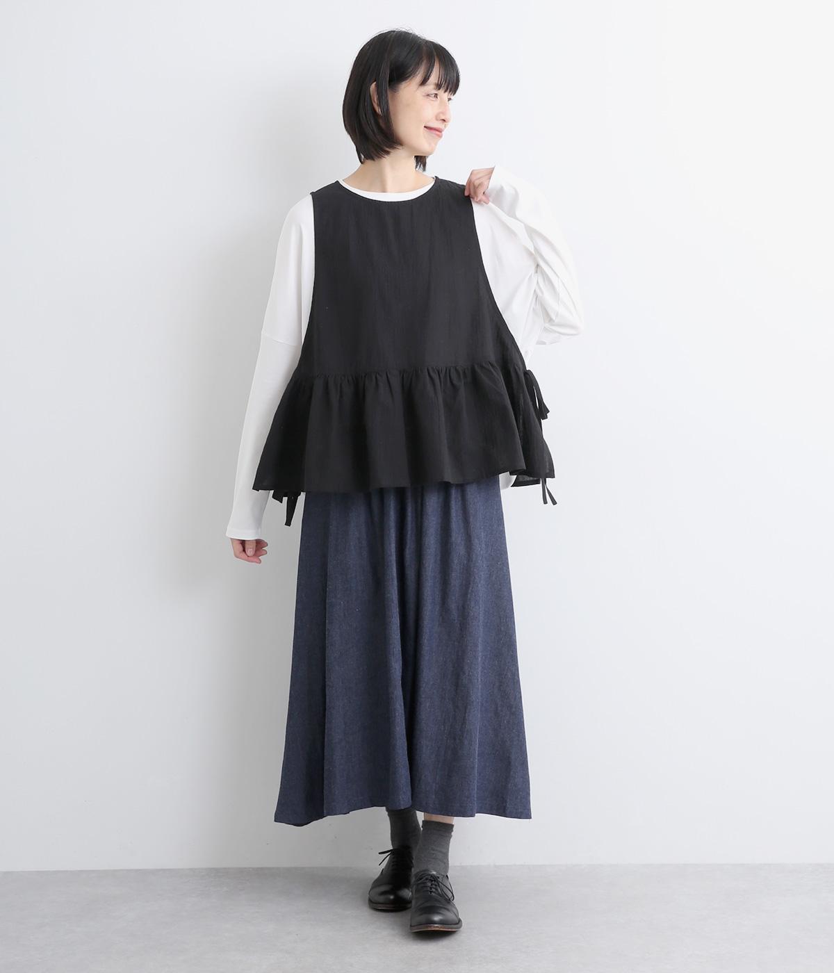 サイドリボンにギャザーのフレア感でフェミニンテイストなデザインのベスト。ナチュラル素材で甘すぎることなく、デイリースタイルに取り入れやすく仕上がっています。アームホールが広いのでドルマンシルエットなどさまざまなアイテムと好相性。