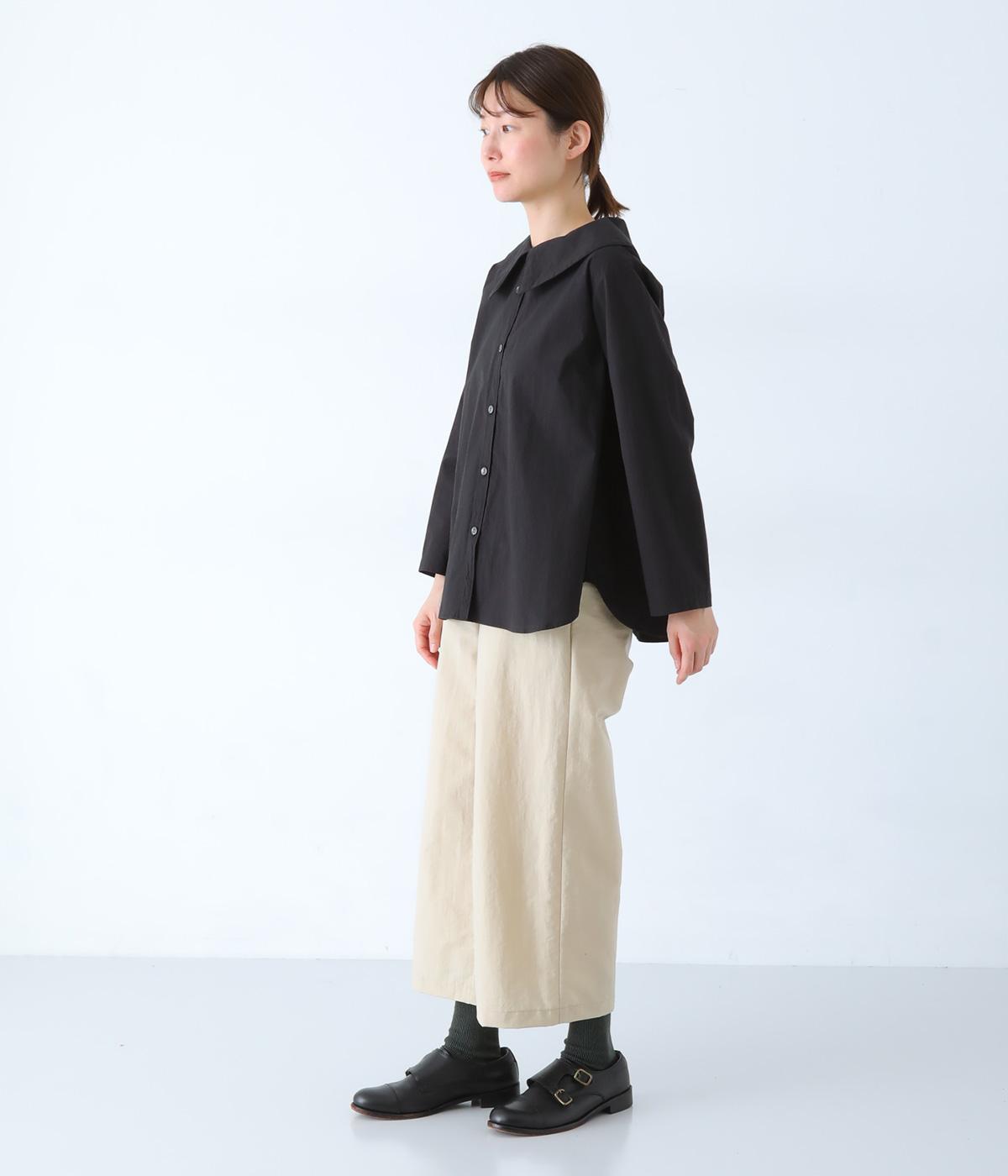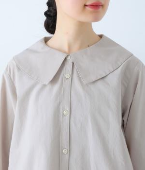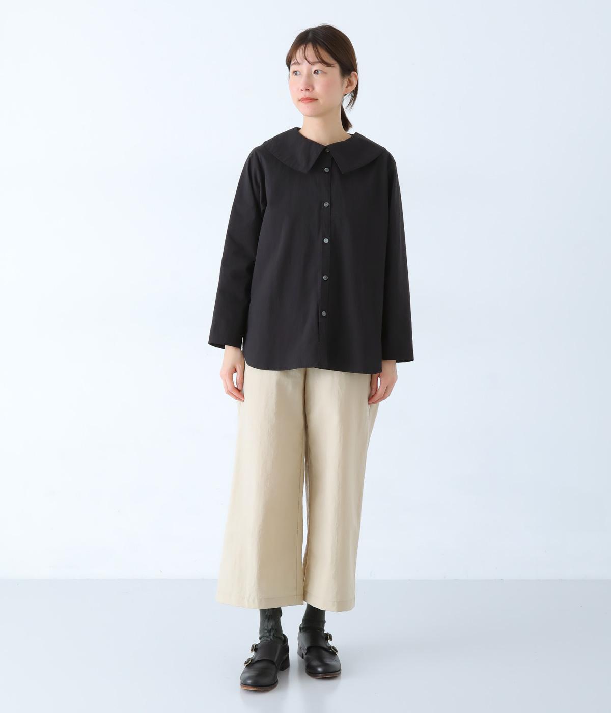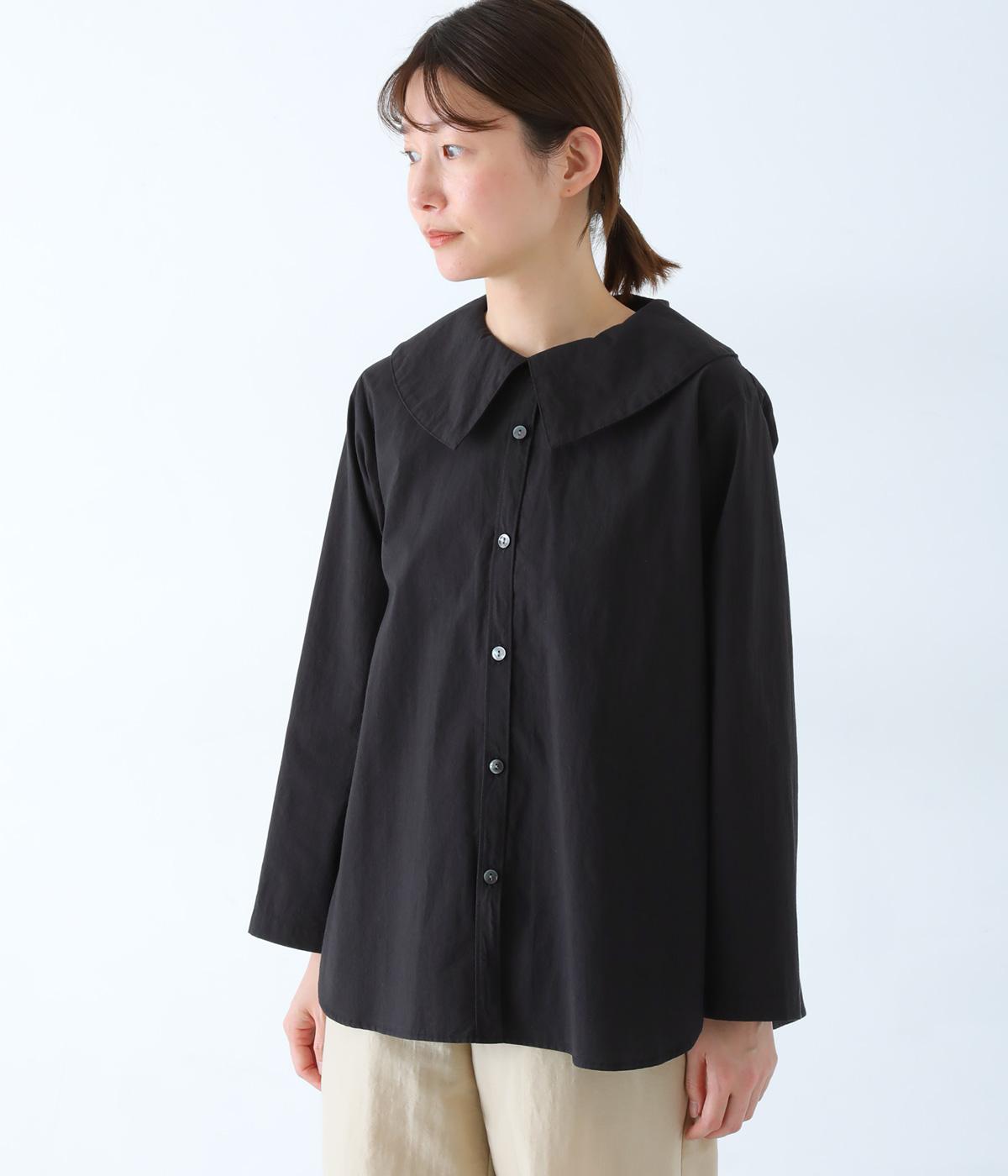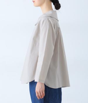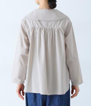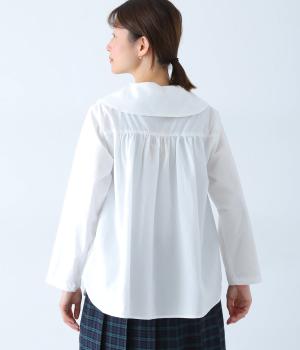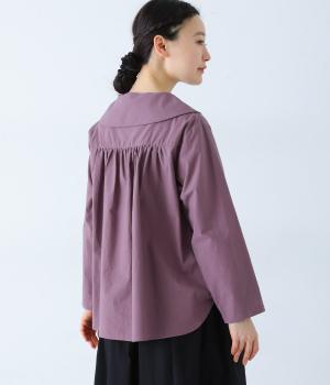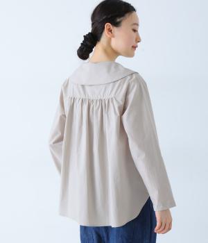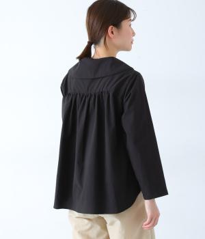 大きな襟が顔まわりを華やかに見せてくれるブラウスです。裾のサイドスリットと背面のギャザーがアクセントに。シンプルながらも、上品な印象を与えてくれる一枚です。