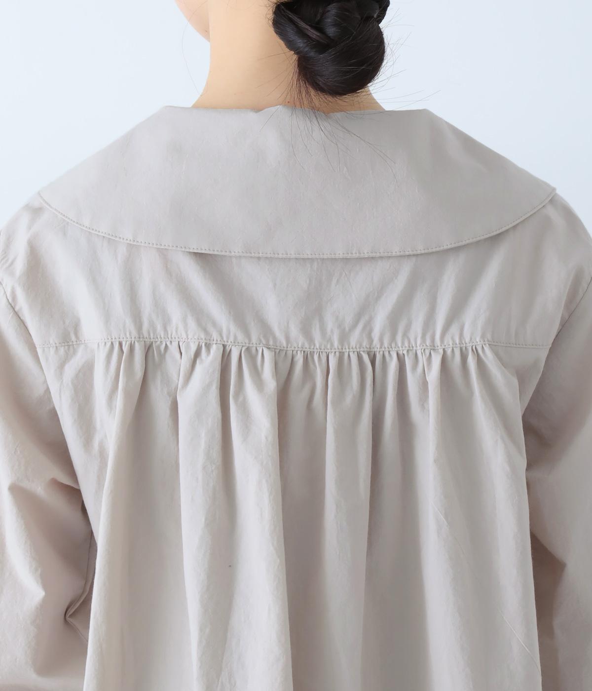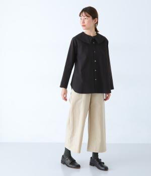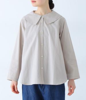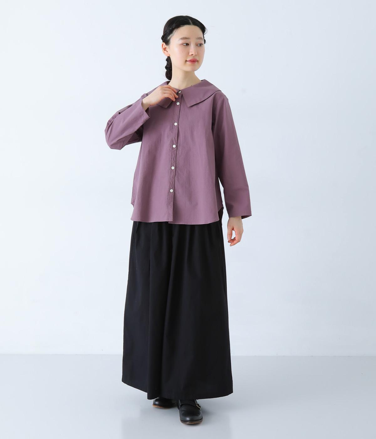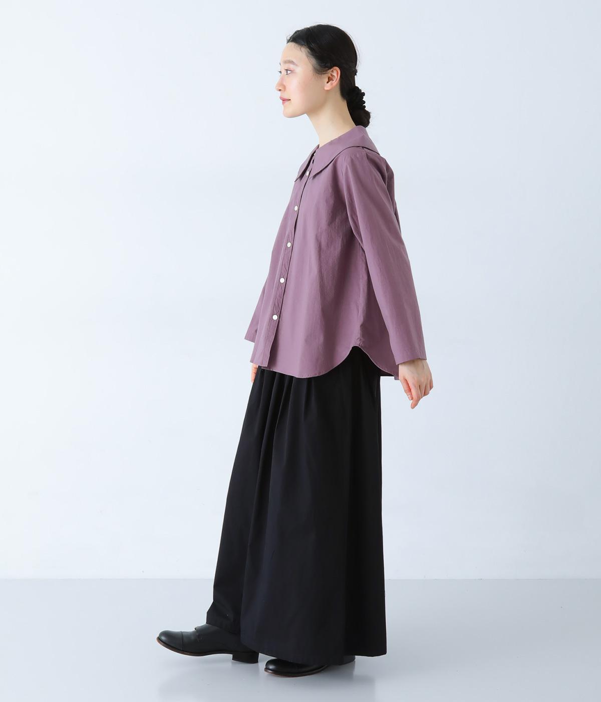 大きな襟が顔まわりを華やかに見せてくれるブラウスです。裾のサイドスリットと背面のギャザーがアクセントに。シンプルながらも、上品な印象を与えてくれる一枚です。