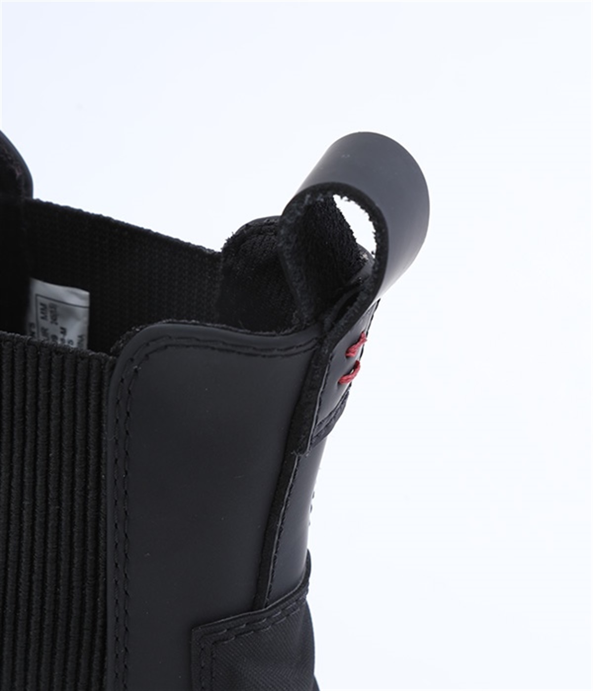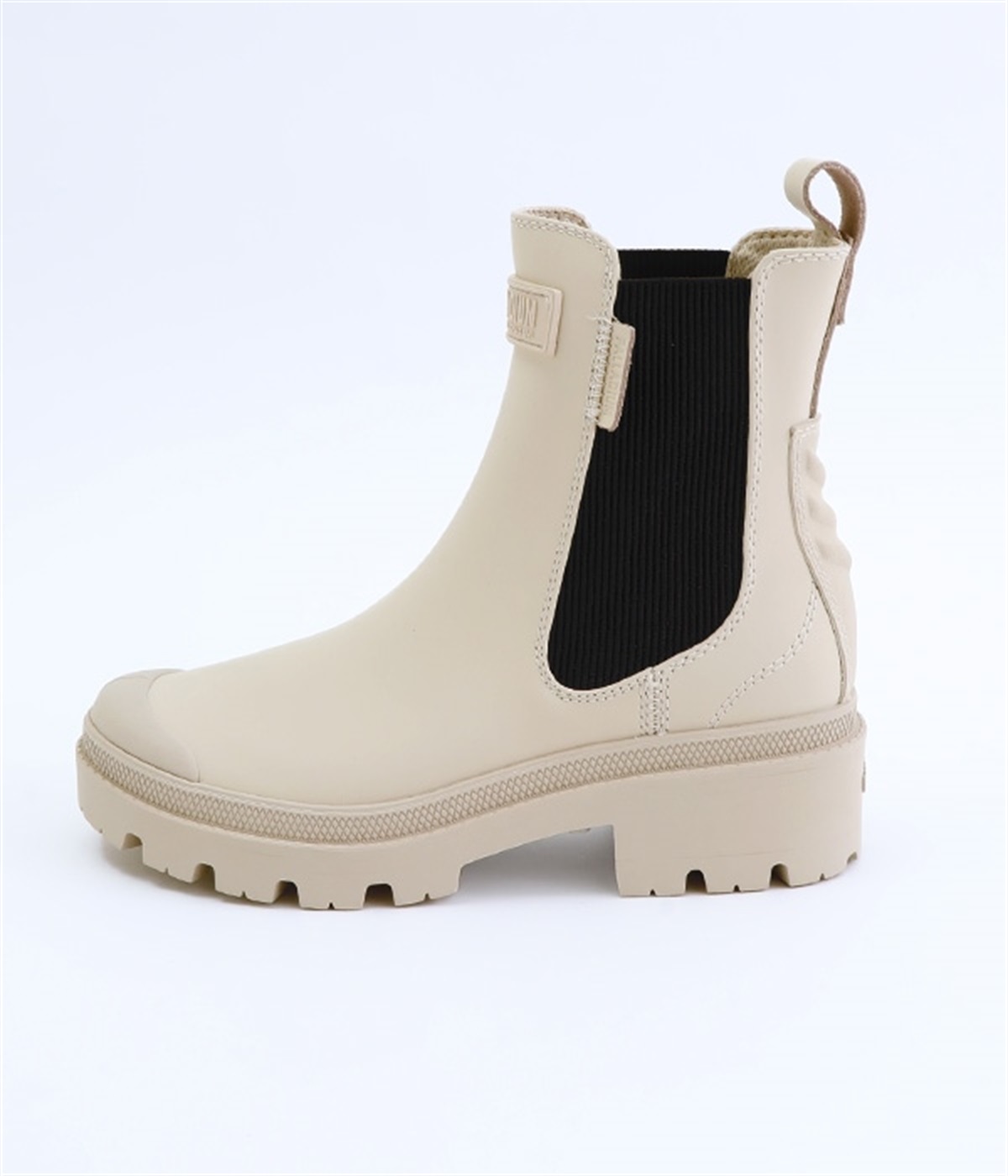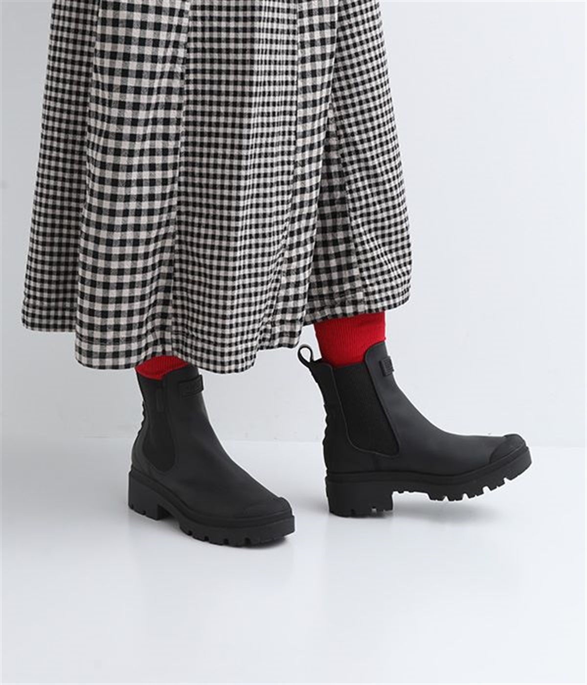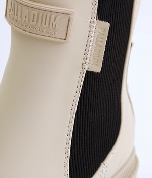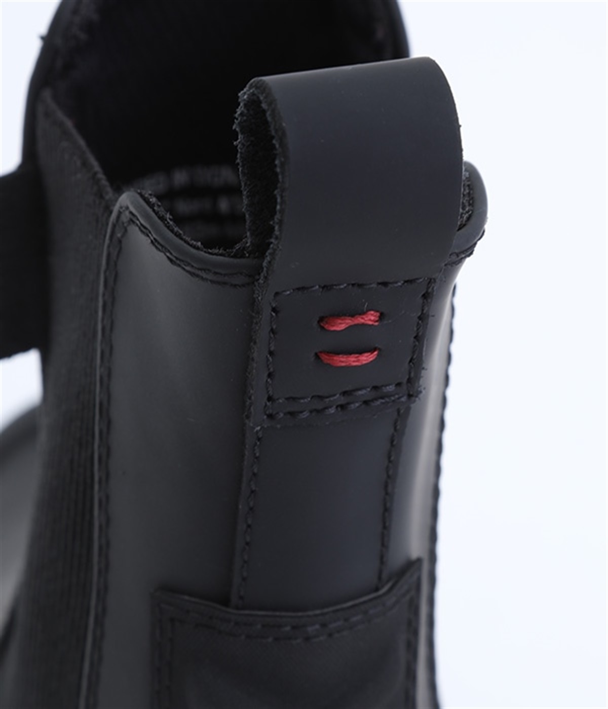 1947年にフランスで誕生した老舗ブーツブランド「パラディウム」のアイコンモデルをアップデートしたブーツです。側面にゴムを入れたフィット感のあるチェルシーブーツは、きれいめで滑らかな合皮素材のアッパーを採用し、かかとはほんのりミリタリーなエッセンスをプラスしました。ポイントになる赤のステッチングや、アウトソールのゴツゴツと立体的なフォルムが、他とはひと味違う雰囲気のある足元を演出してくれます。