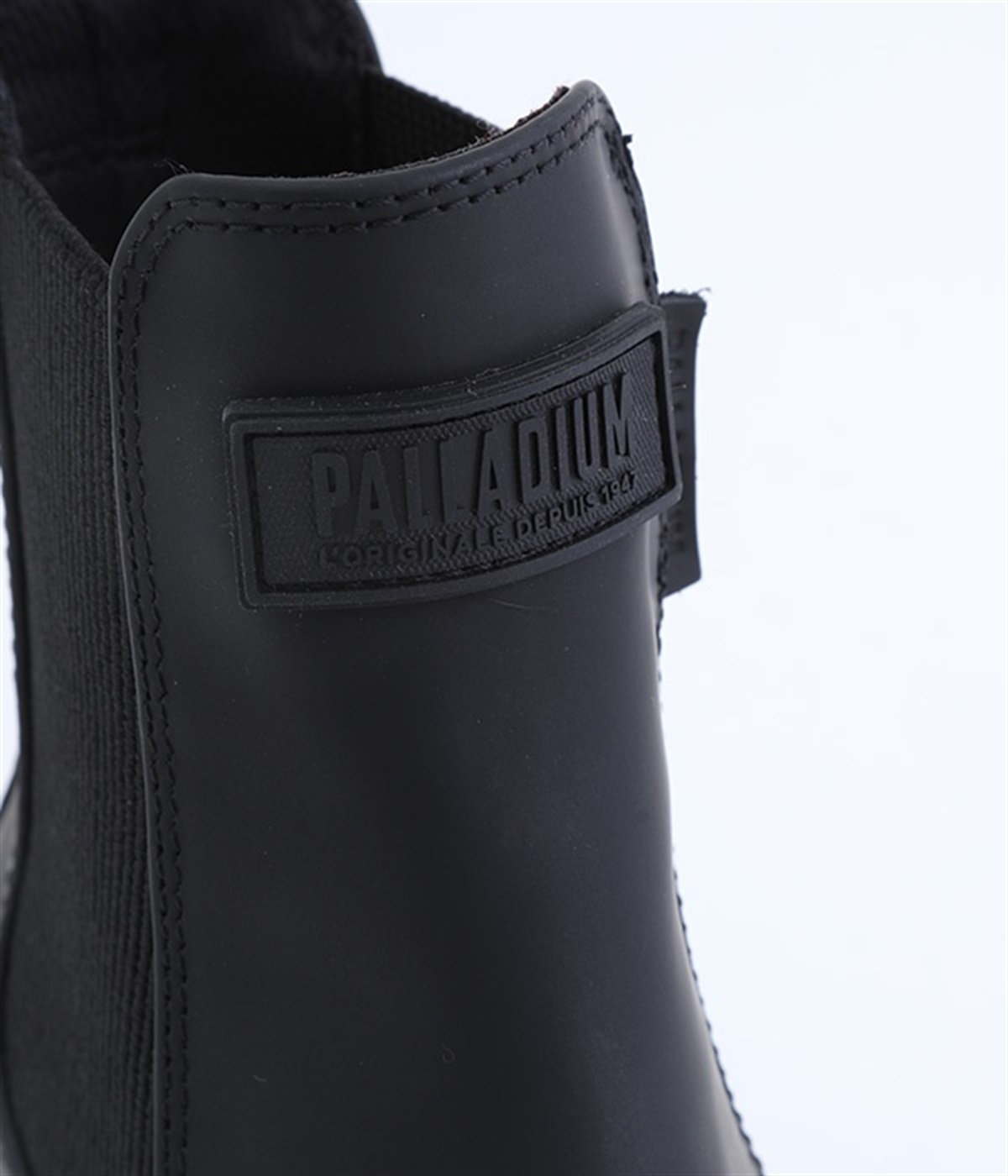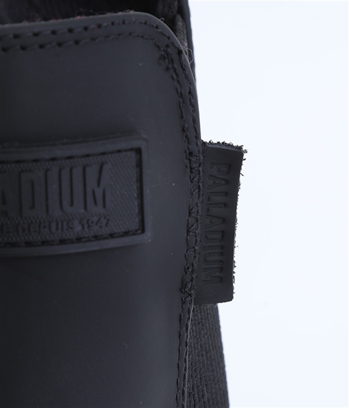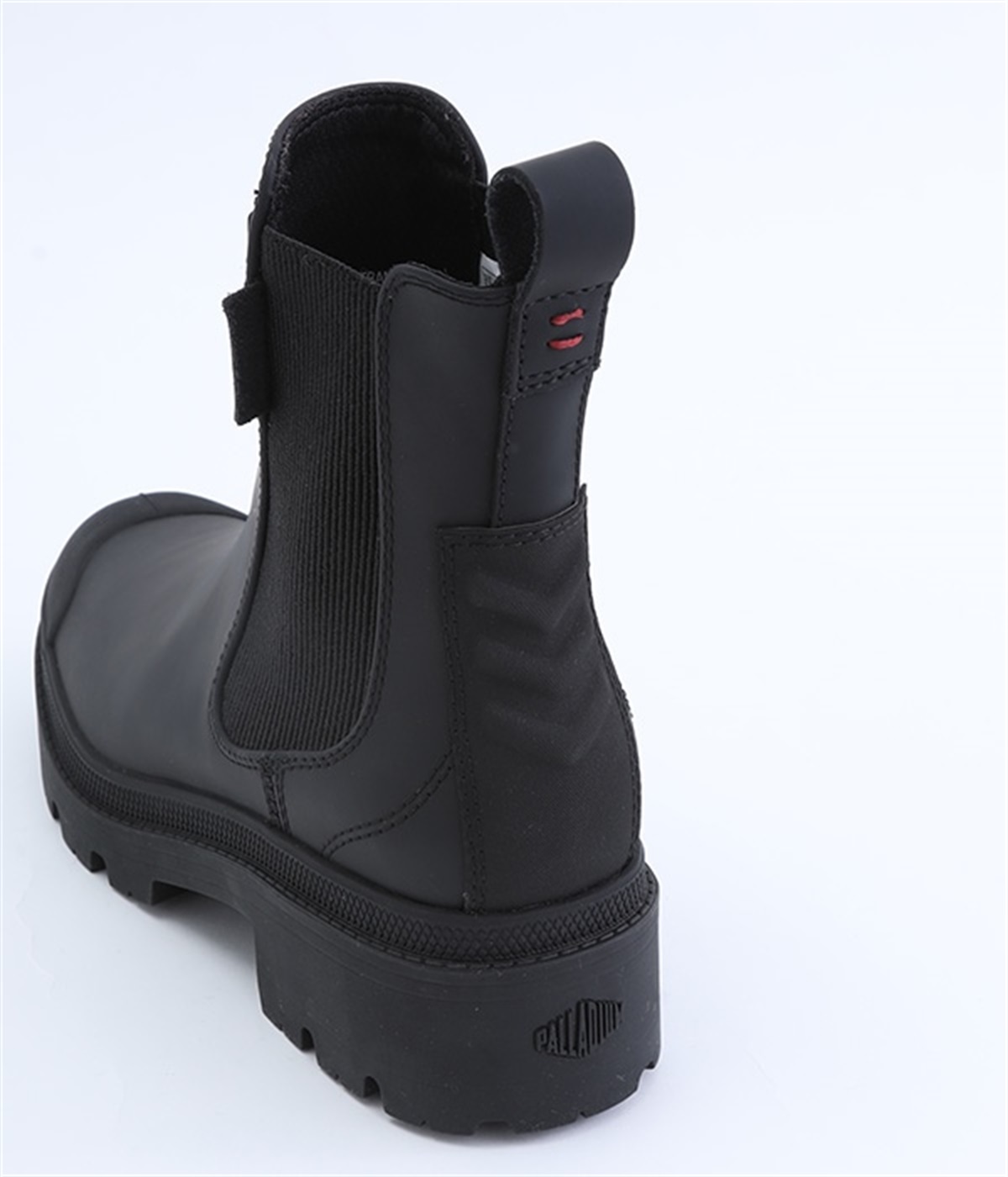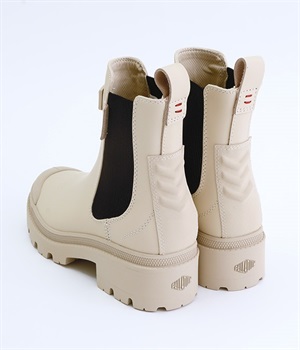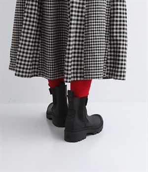 1947年にフランスで誕生した老舗ブーツブランド「パラディウム」のアイコンモデルをアップデートしたブーツです。側面にゴムを入れたフィット感のあるチェルシーブーツは、きれいめで滑らかな合皮素材のアッパーを採用し、かかとはほんのりミリタリーなエッセンスをプラスしました。ポイントになる赤のステッチングや、アウトソールのゴツゴツと立体的なフォルムが、他とはひと味違う雰囲気のある足元を演出してくれます。