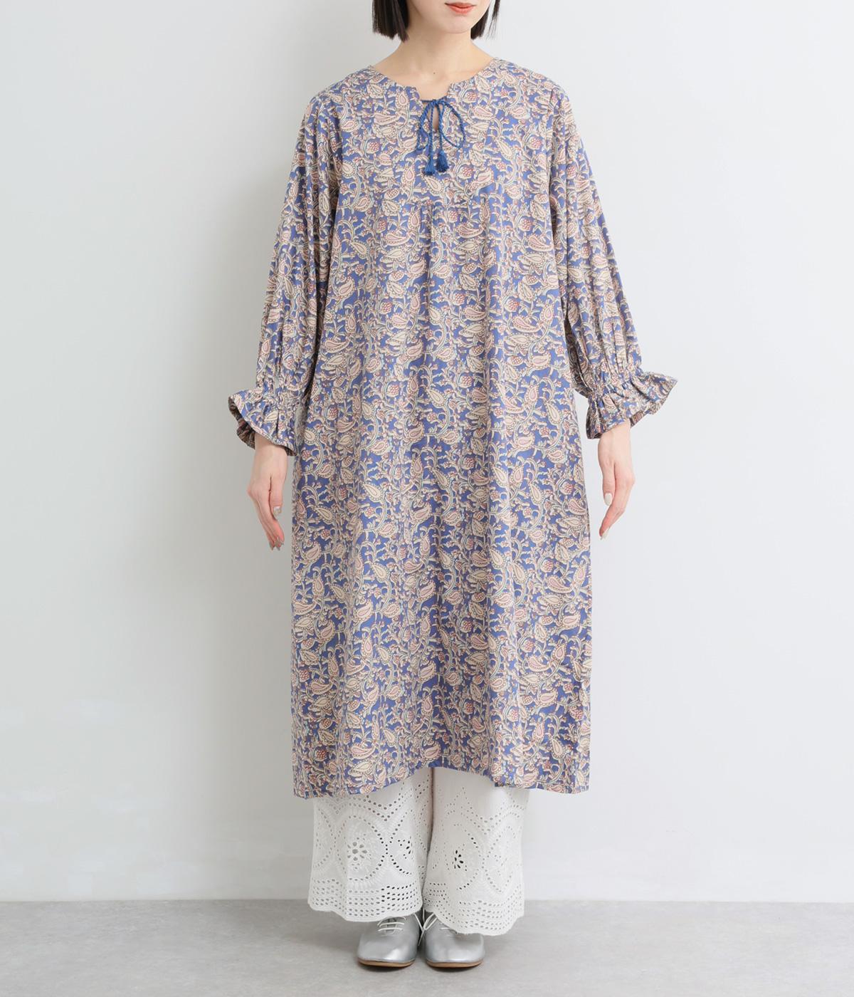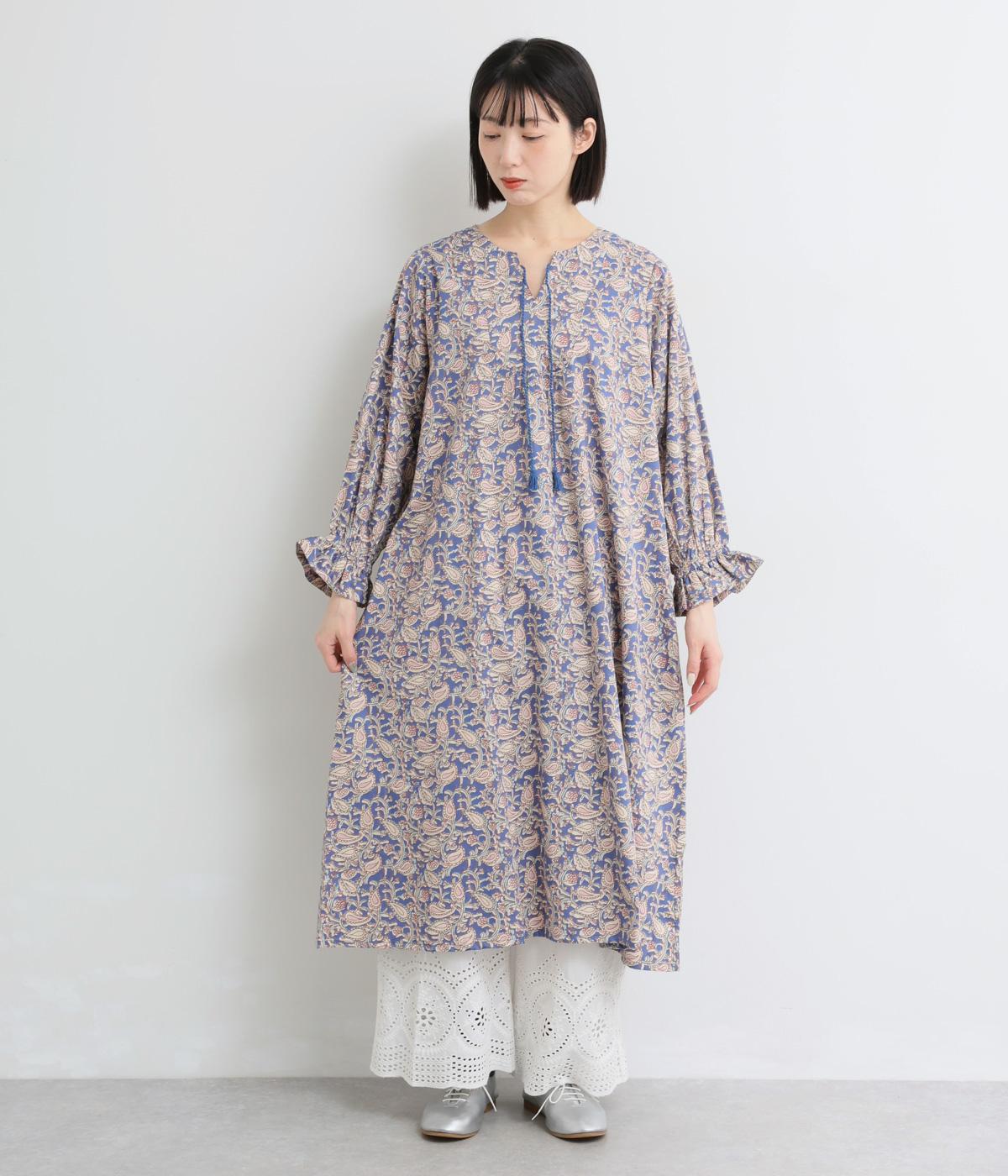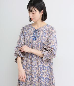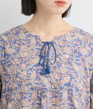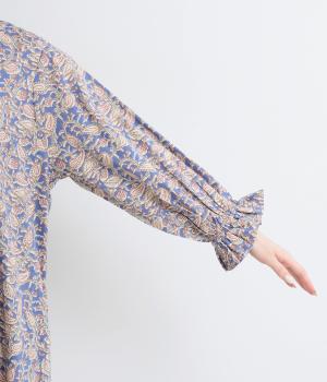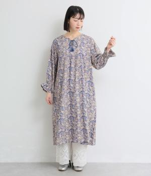 カフスのフリルが華やかさを演出するボリュームワンピースに、さわやかなペイズリー柄をのせました。すっきりとした首まわりが抜け感を生み、バランスよく仕上げています。ネックラインのタッセル付き紐は、そのまま垂らしても、蝶々結びにしても自由に楽しめます。