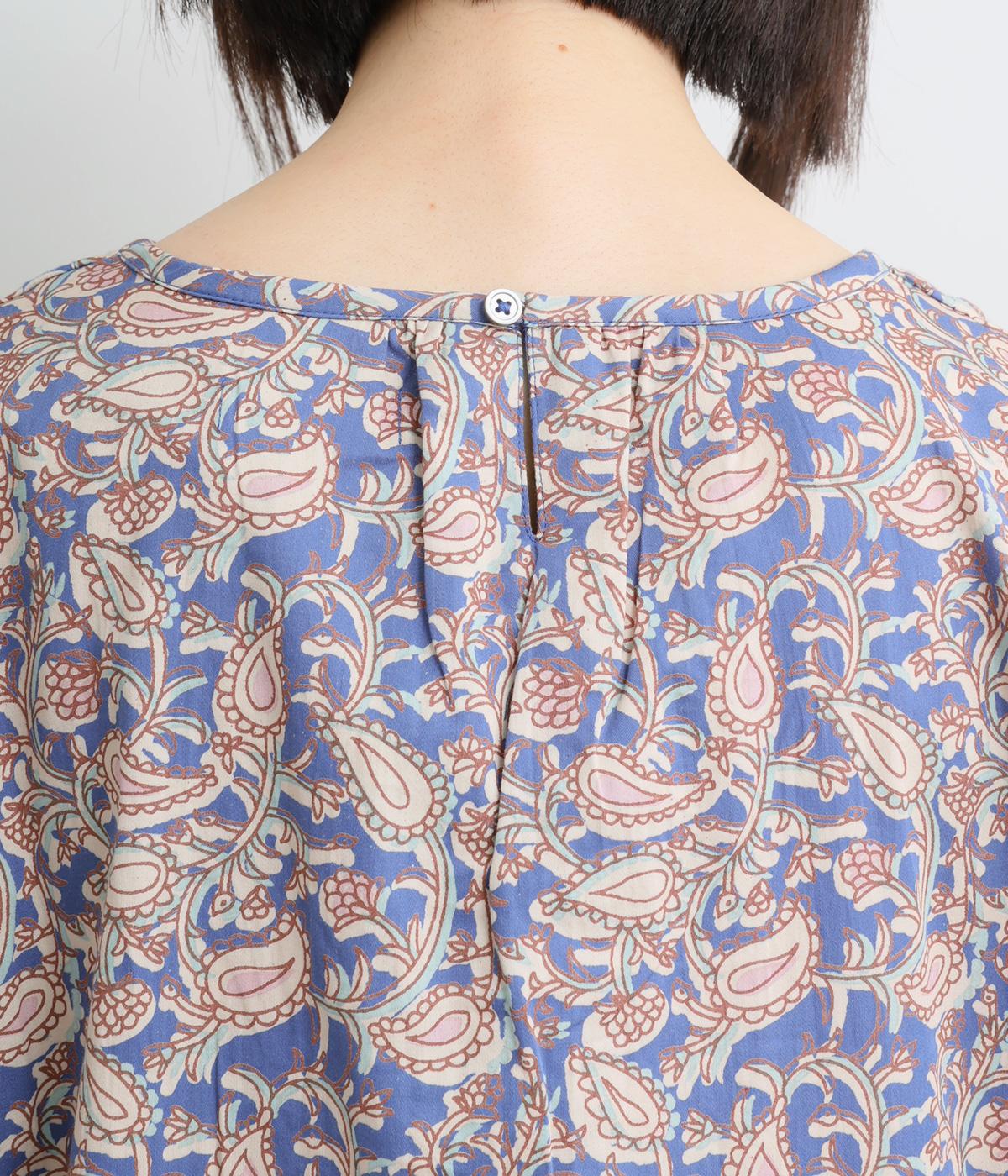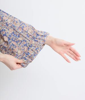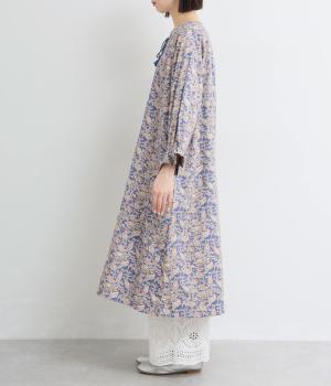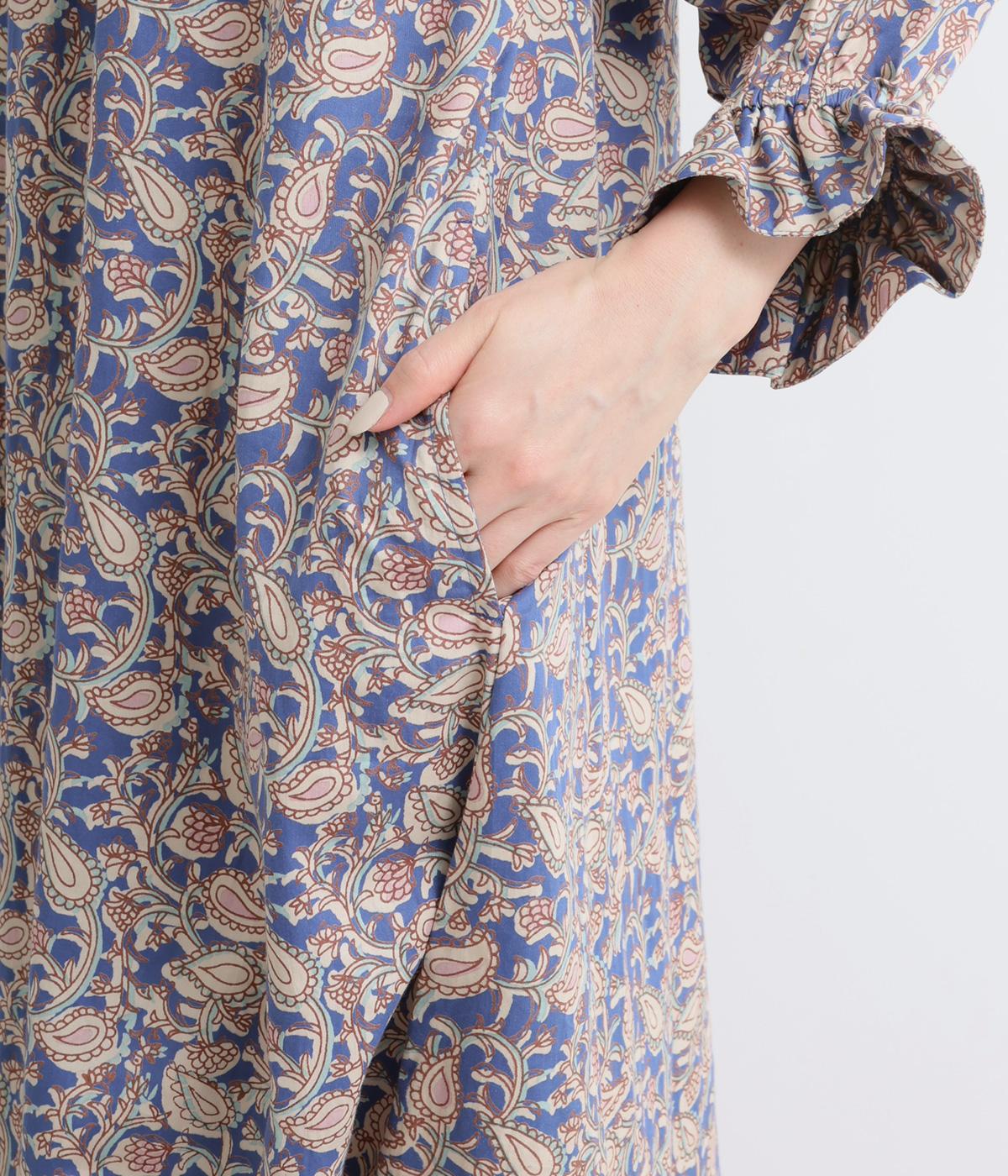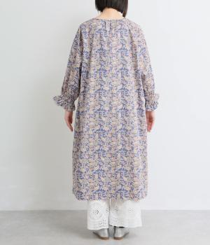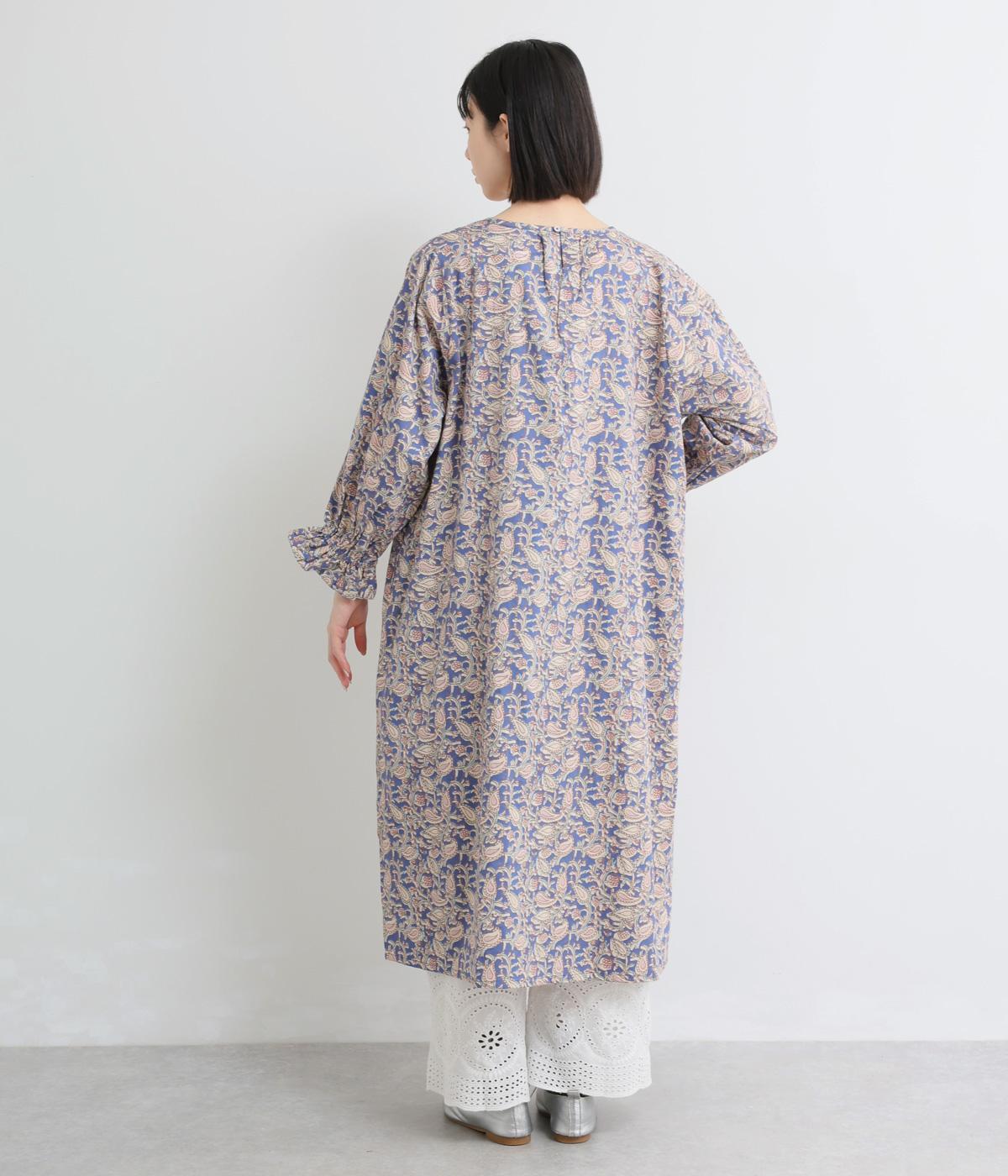 カフスのフリルが華やかさを演出するボリュームワンピースに、さわやかなペイズリー柄をのせました。すっきりとした首まわりが抜け感を生み、バランスよく仕上げています。ネックラインのタッセル付き紐は、そのまま垂らしても、蝶々結びにしても自由に楽しめます。