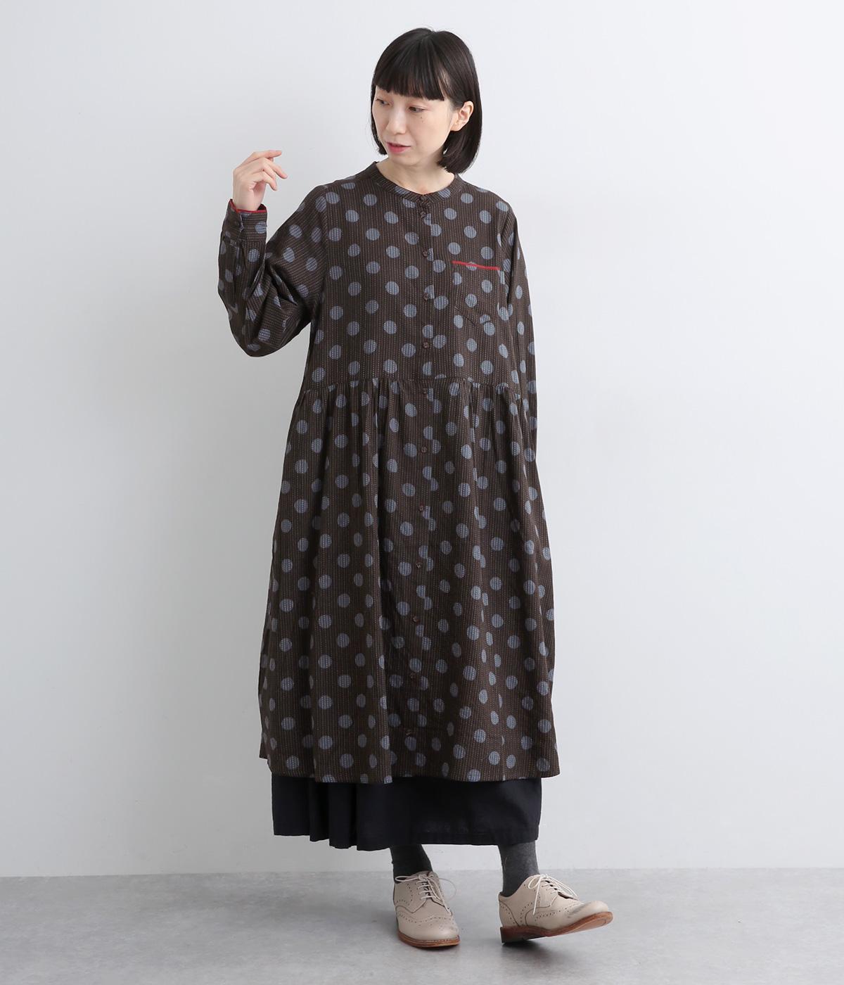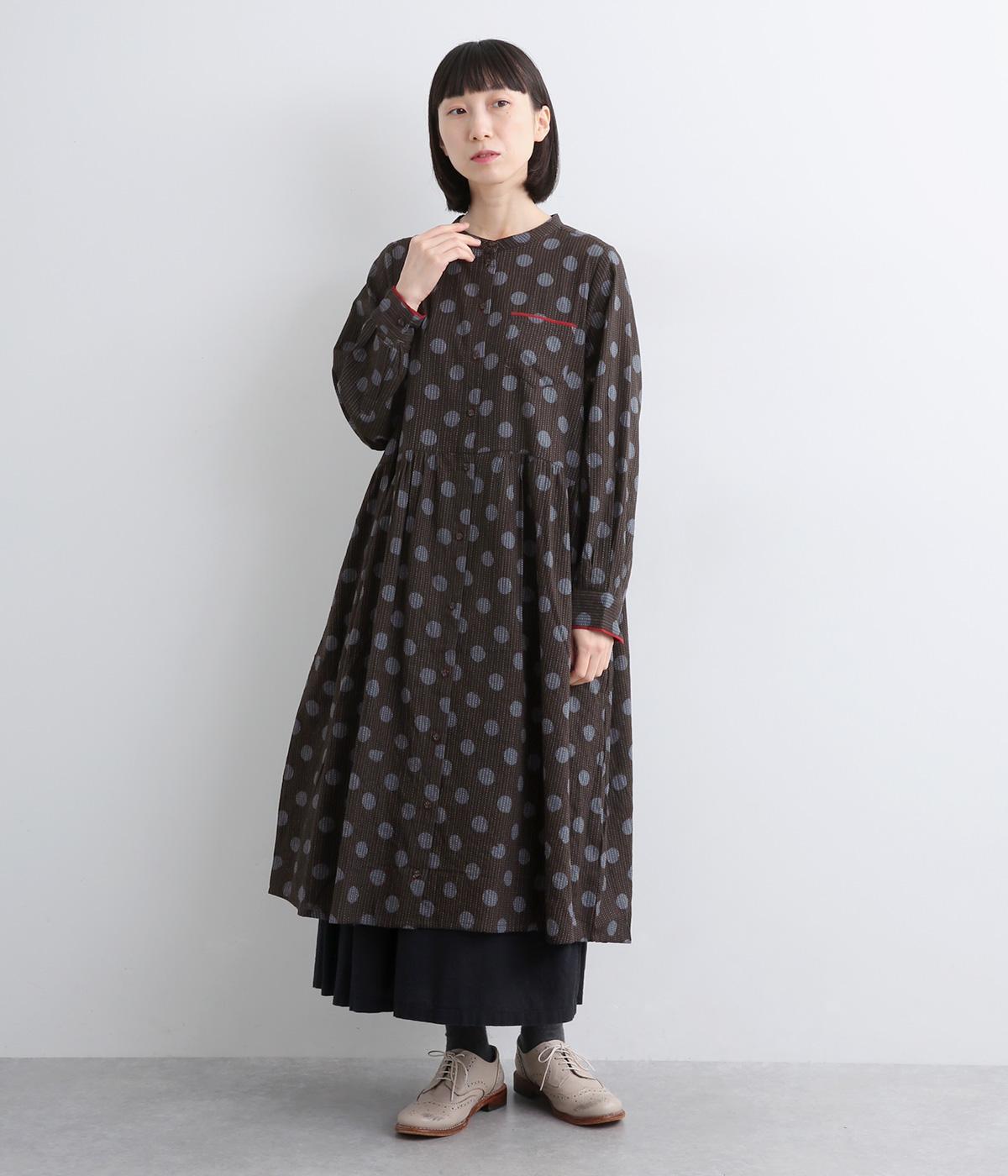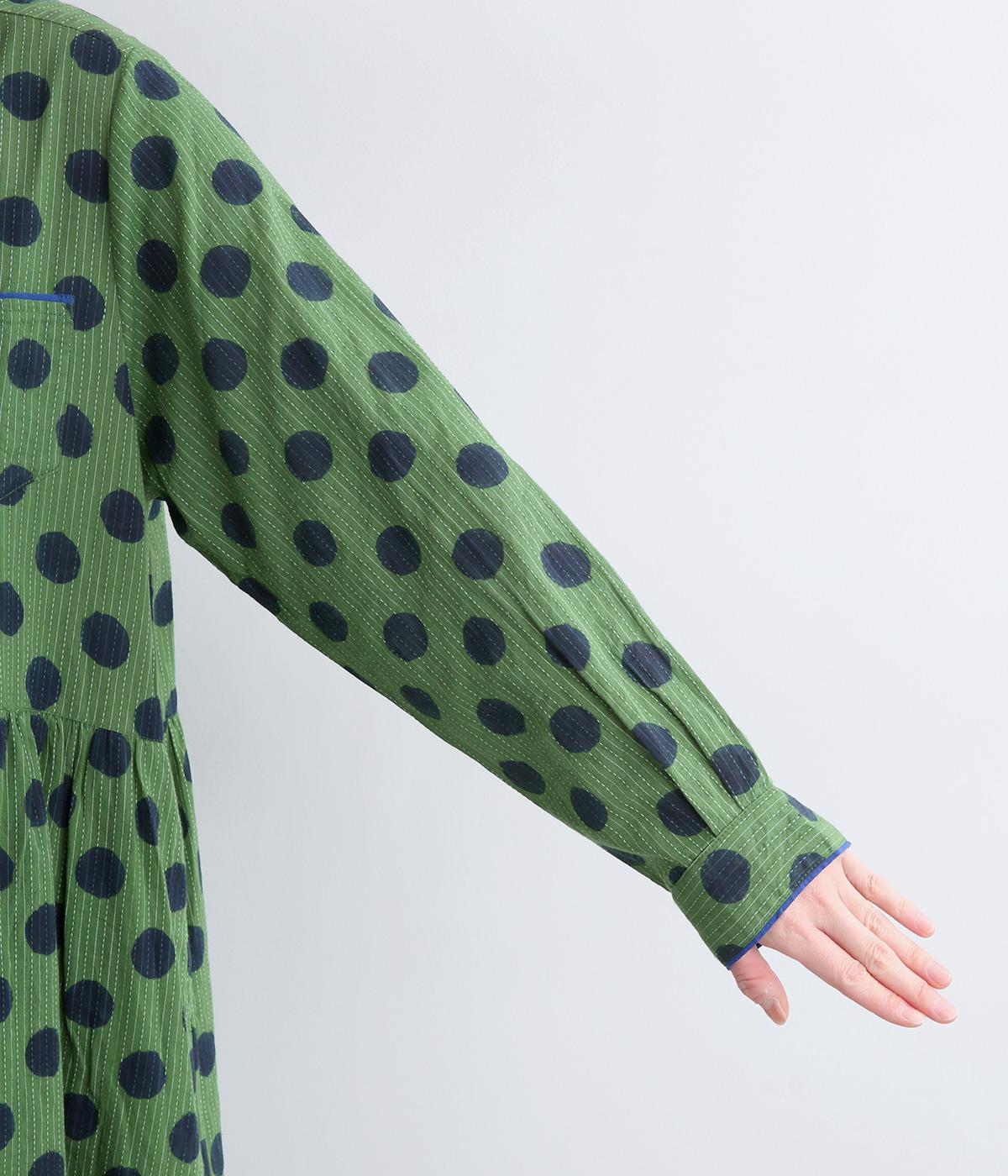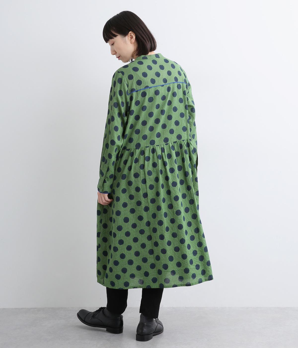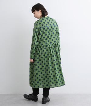 ステッチ×ドット柄のワンピースです。ベース生地にはステッチが入っており、柄に奥行きのある表情を加えています。ポケット口やカフスは配色の無地をアクセントにして、細部のディテールにもこだわったデザインに仕立てました。