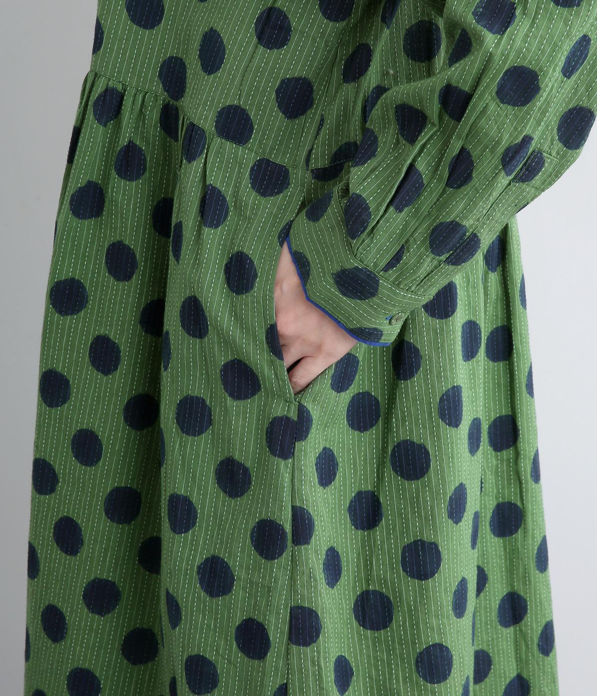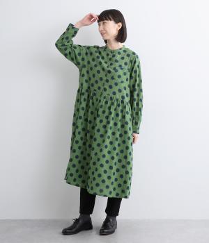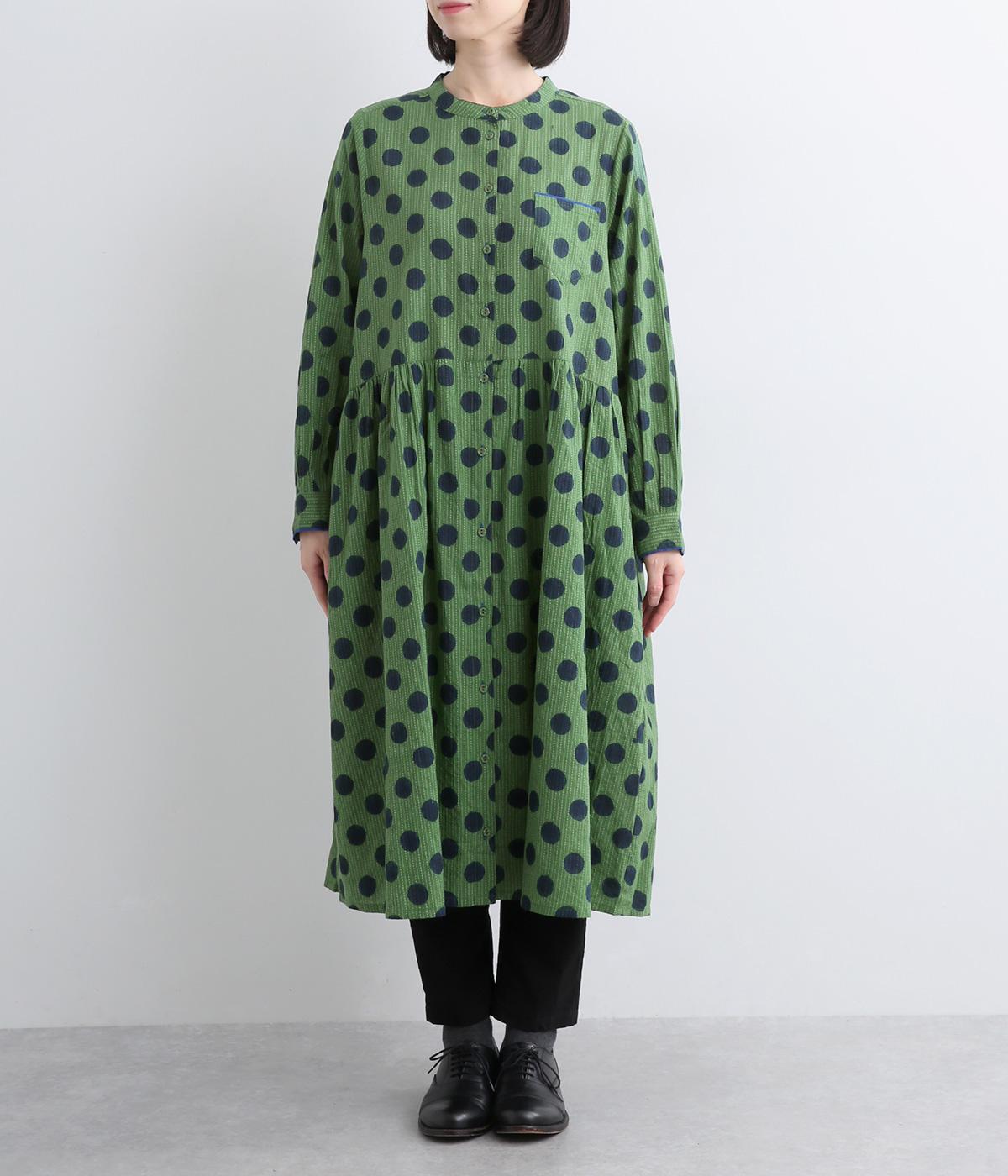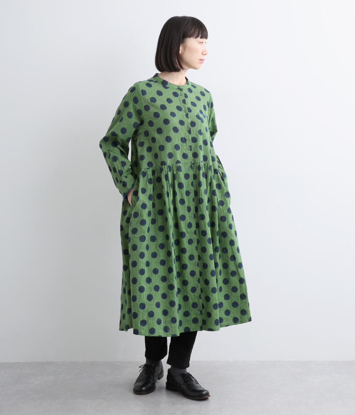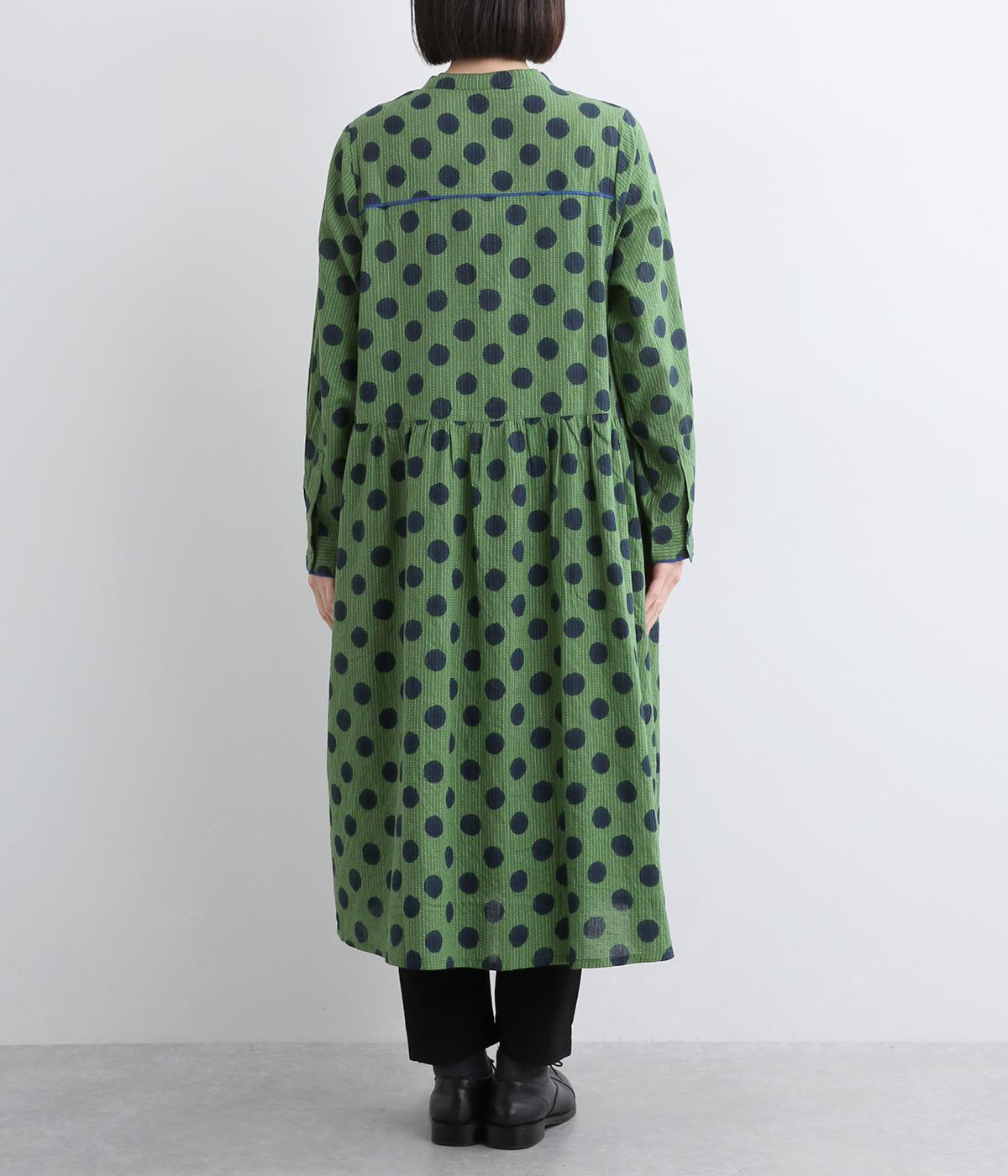 ステッチ×ドット柄のワンピースです。ベース生地にはステッチが入っており、柄に奥行きのある表情を加えています。ポケット口やカフスは配色の無地をアクセントにして、細部のディテールにもこだわったデザインに仕立てました。