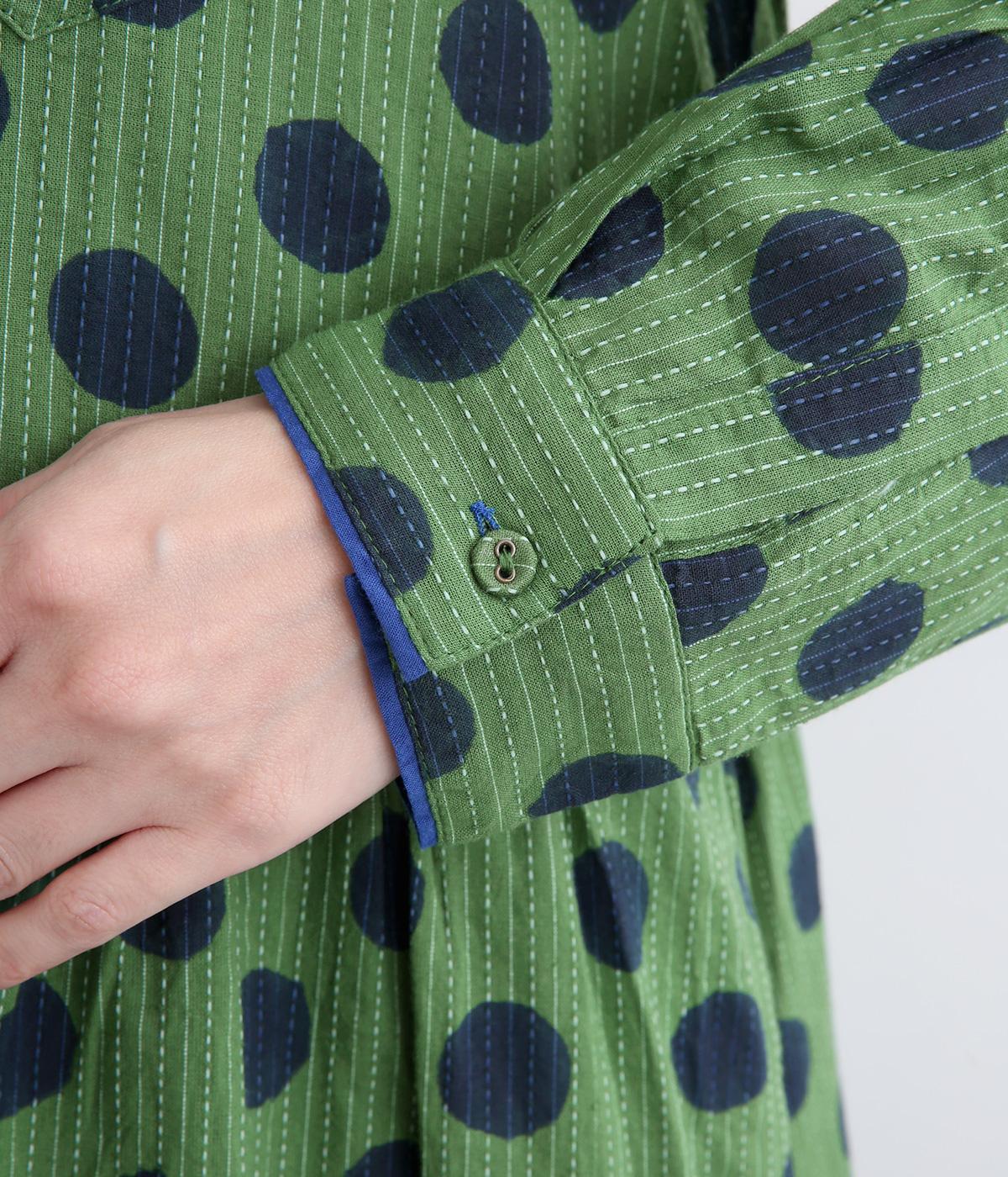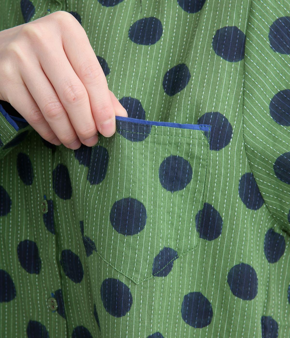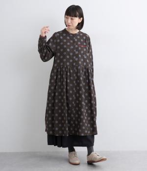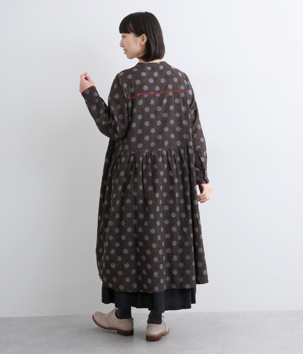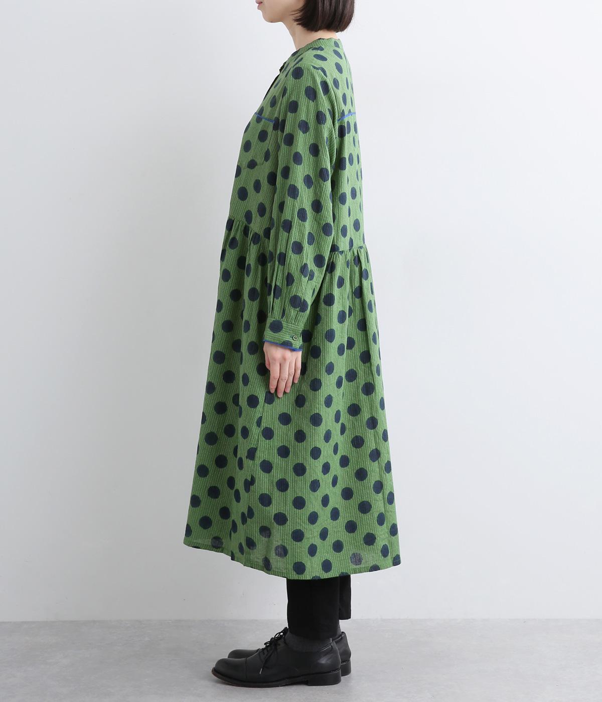 ステッチ×ドット柄のワンピースです。ベース生地にはステッチが入っており、柄に奥行きのある表情を加えています。ポケット口やカフスは配色の無地をアクセントにして、細部のディテールにもこだわったデザインに仕立てました。