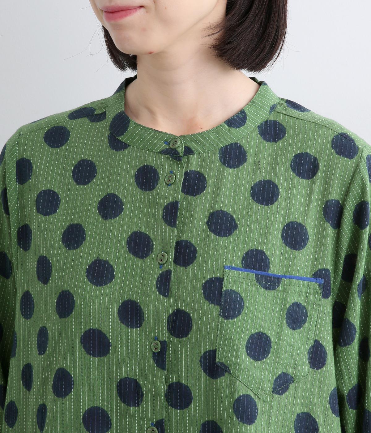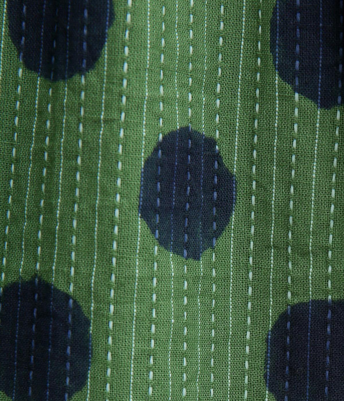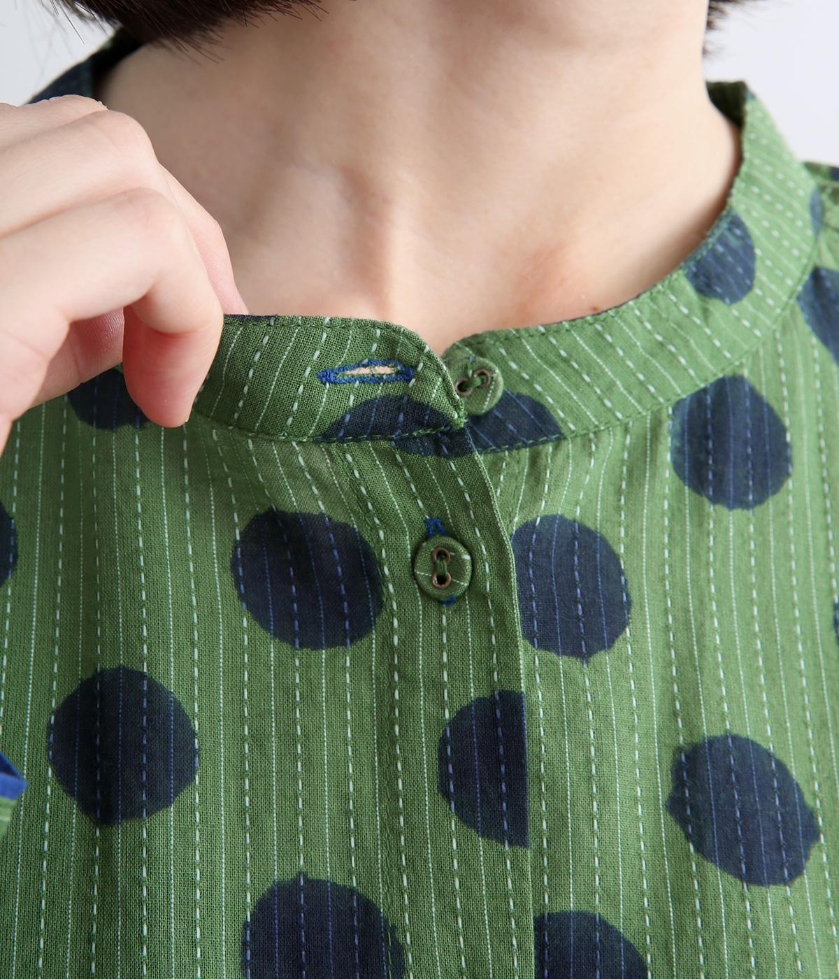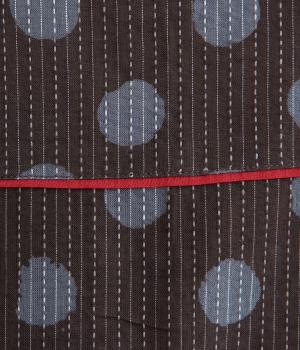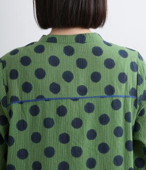 さらりとしたやさしい肌ざわりをもつ、インド綿を使用しています。バイカラーのドット柄は、一版一色ずつ押して柄を作っていく木版を用いたブロックプリントによるものです。