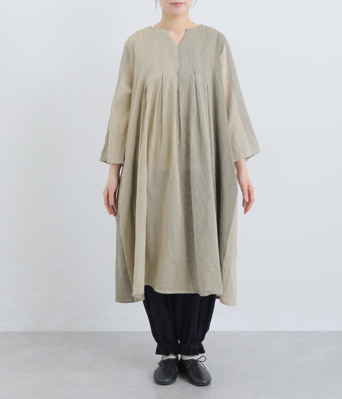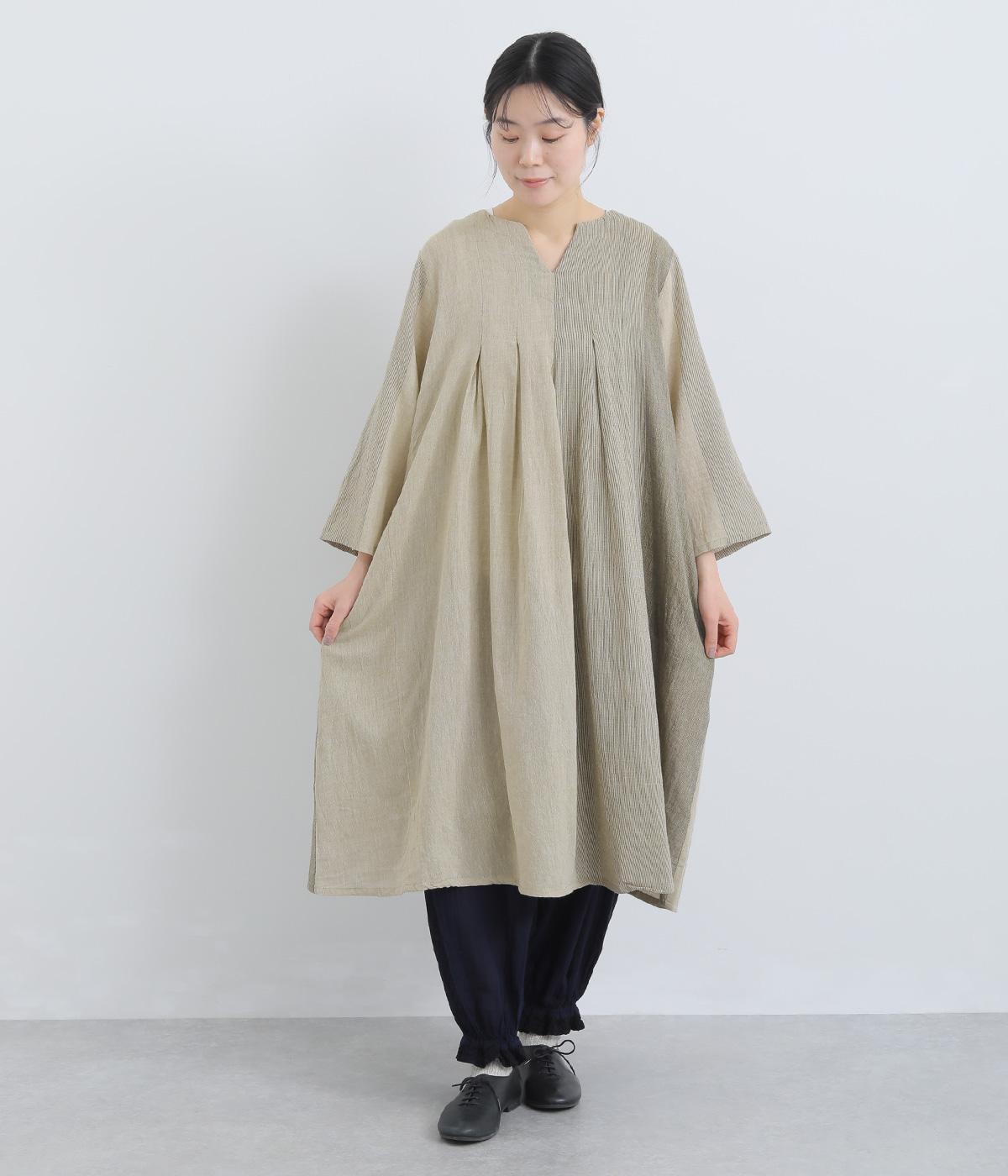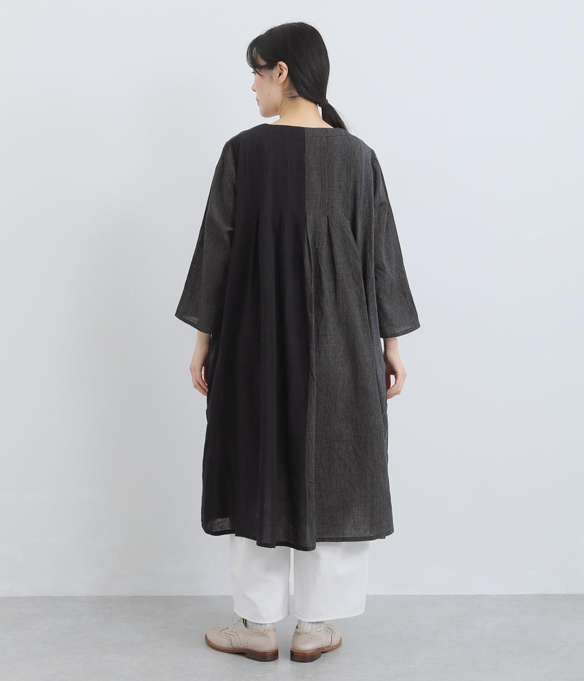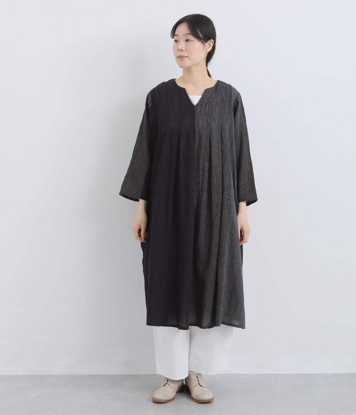 ストライプ柄と無地を切り替えて印象的に魅せたワンピース。胸ラインにタックを入れてフレア感を出し、体のラインを拾いにくいシルエットに仕立てました。ボトム合わせがたのしめる着丈に、襟ぐりの抜け感が大人な表情に。