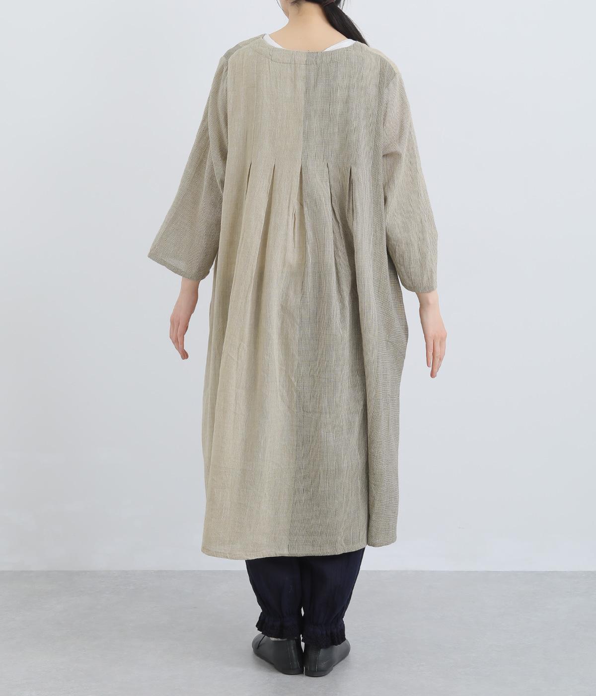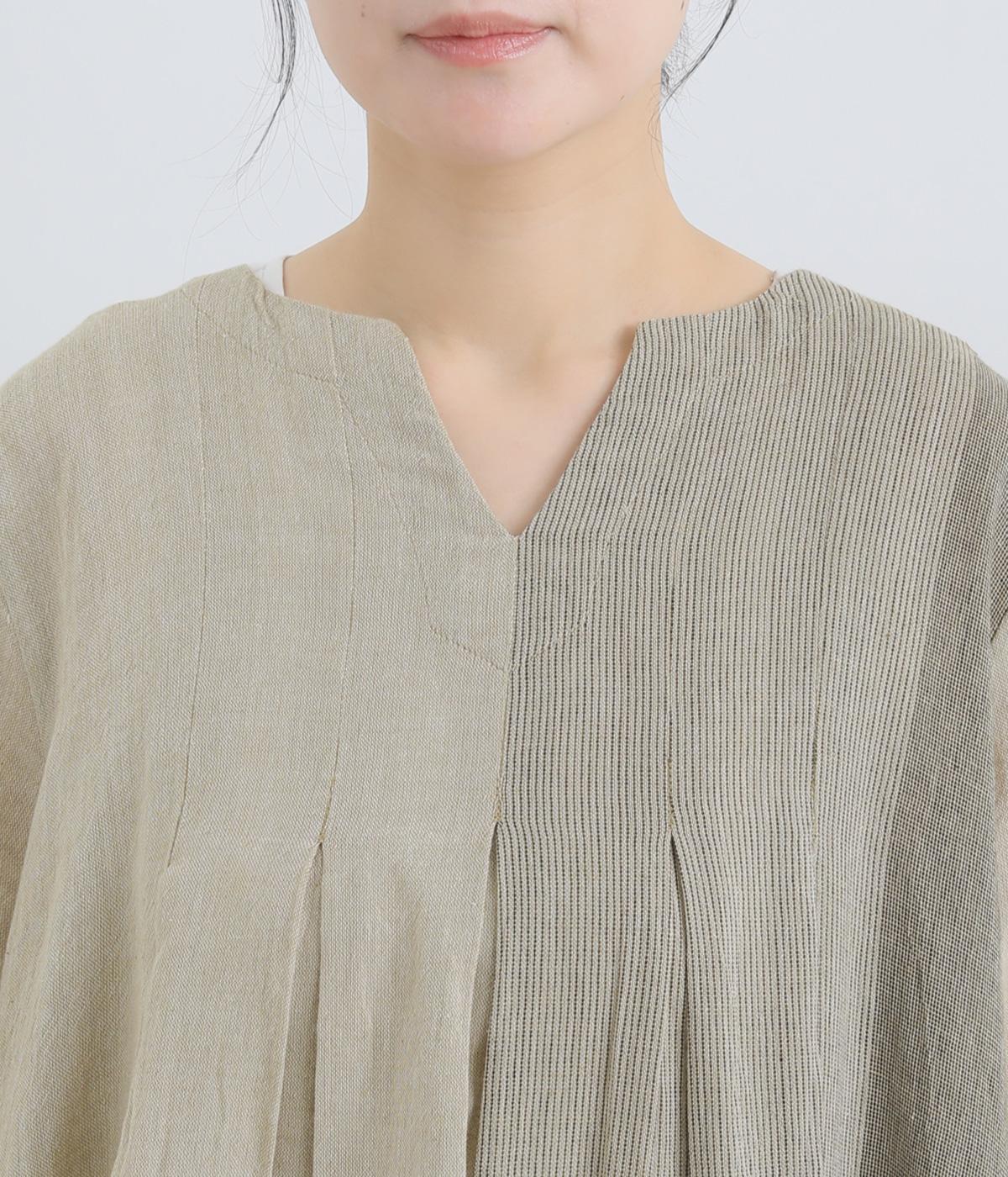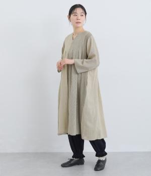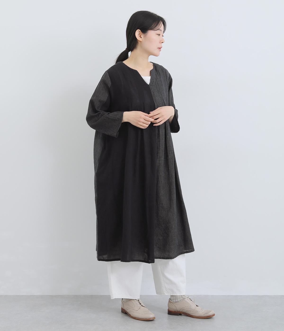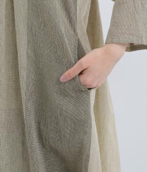 ストライプ柄と無地を切り替えて印象的に魅せたワンピース。胸ラインにタックを入れてフレア感を出し、体のラインを拾いにくいシルエットに仕立てました。ボトム合わせがたのしめる着丈に、襟ぐりの抜け感が大人な表情に。