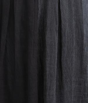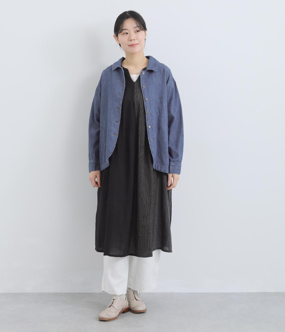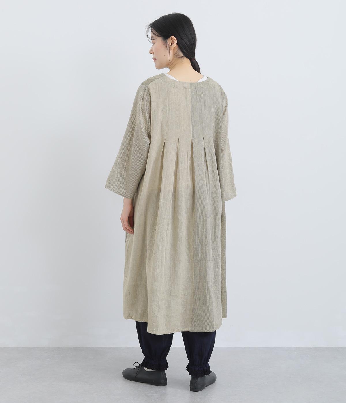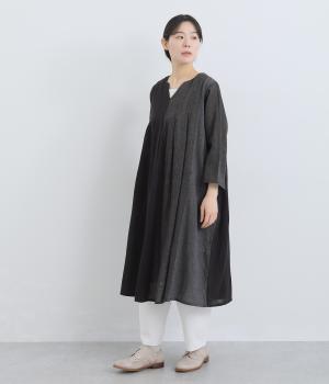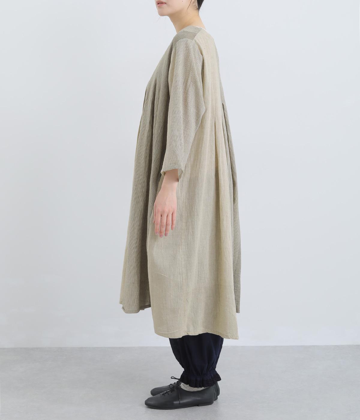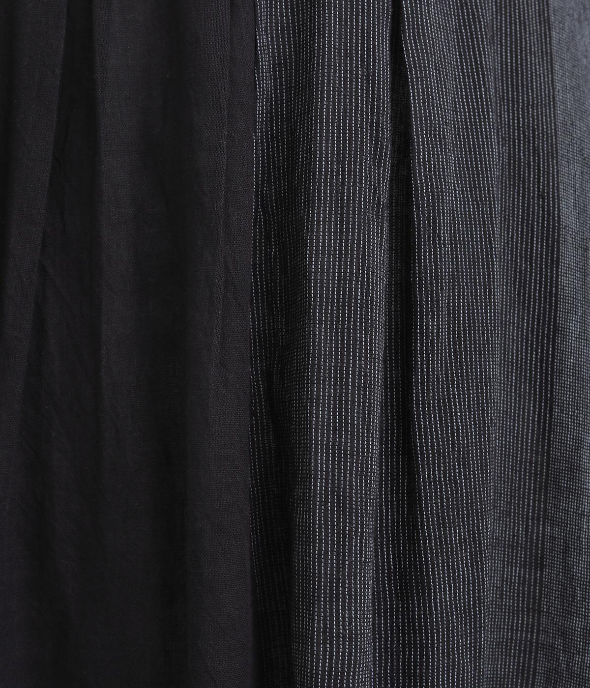 ストライプ柄と無地を切り替えて印象的に魅せたワンピース。胸ラインにタックを入れてフレア感を出し、体のラインを拾いにくいシルエットに仕立てました。ボトム合わせがたのしめる着丈に、襟ぐりの抜け感が大人な表情に。