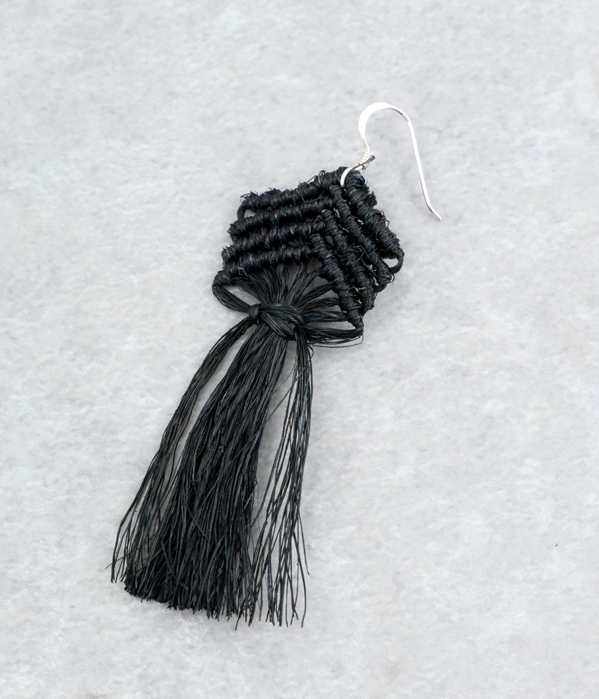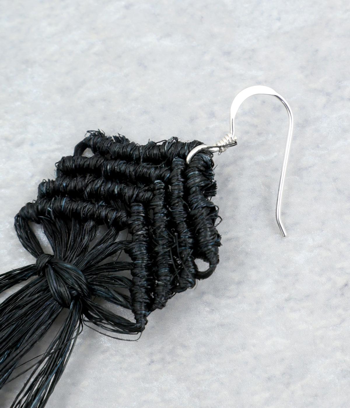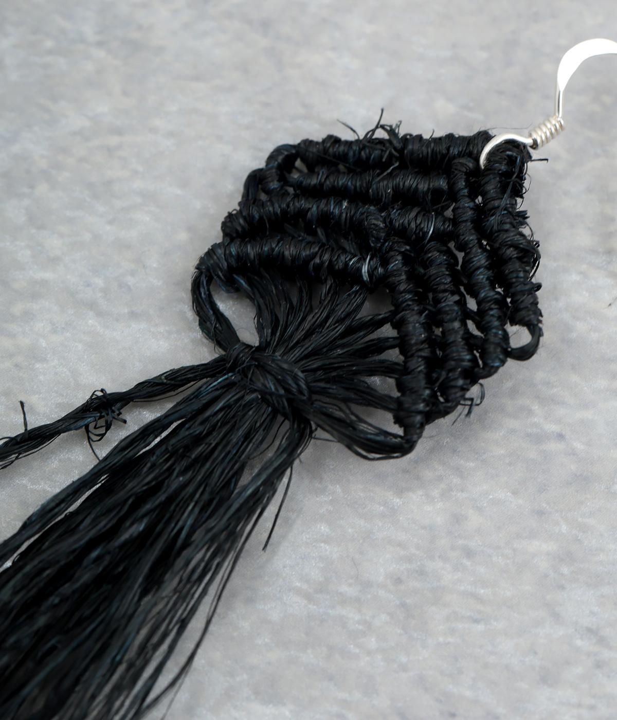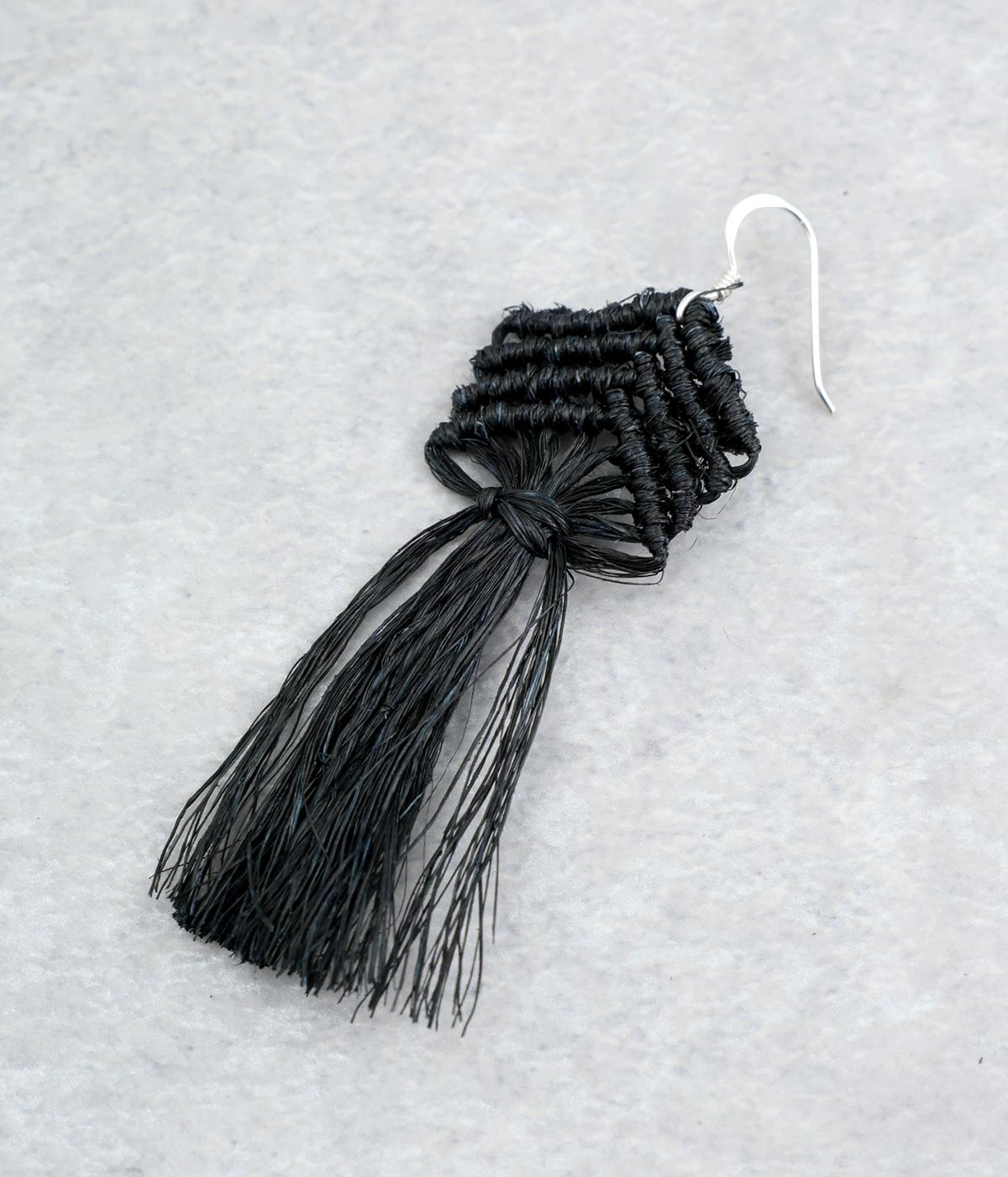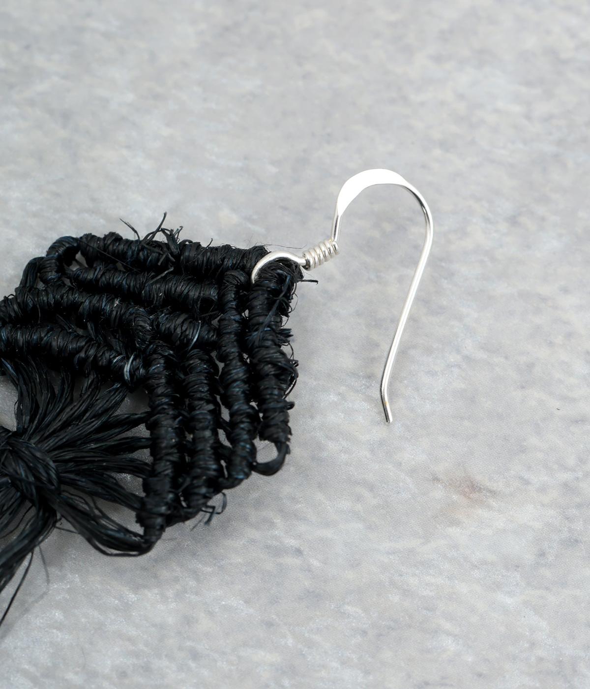 丁寧に編みこまれたモチーフにタッセルをつけ、まるで耳もとで魚が泳いでいるような涼やかな存在感を放つフックタイプのピアス。大ぶりながらもナチュラル素材なのでデイリーに取り入れやすく、アバカを黒に染めているのでシックな装いにもなじみます。