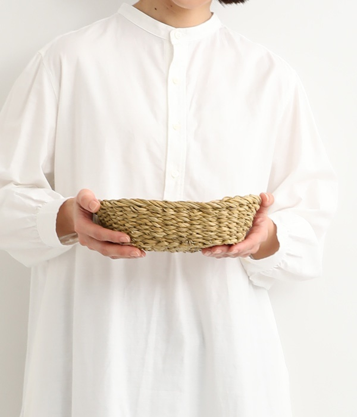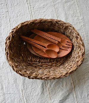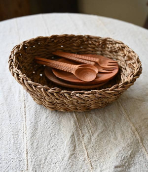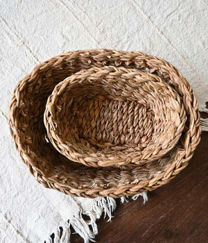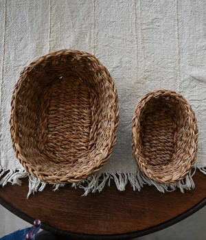 ホグラ(がまの葉)で一つ一つ手編みされた楕円上のバスケットです。そのまま飾るだけでもインテリアとしてサマになり、ハンカチやマスクなど普段使うものの収納が楽しくなるアイテムです。インテリア雑貨としてファブリック等の収納に使う他、キッチン雑貨としては食卓でパンを入れたり、フルーツを入れたりしても。ナチュラルな風合いのホグラバスケットがあるだけで、食卓が温かみのあるものになります。