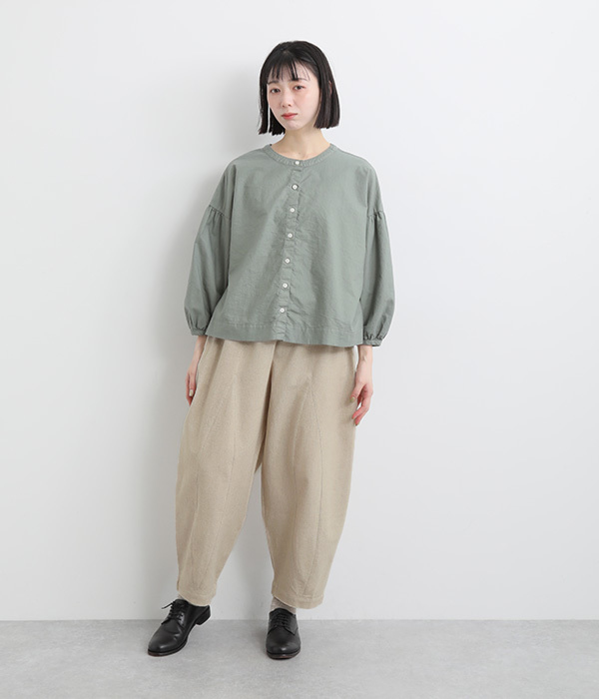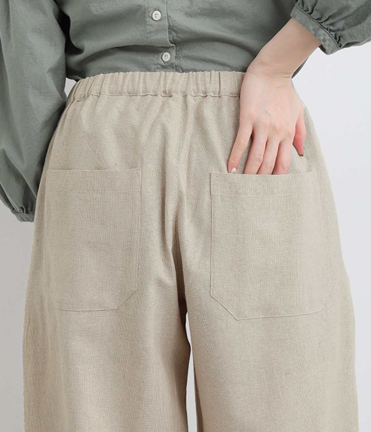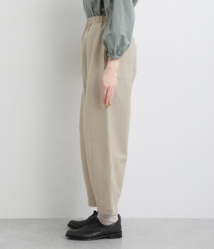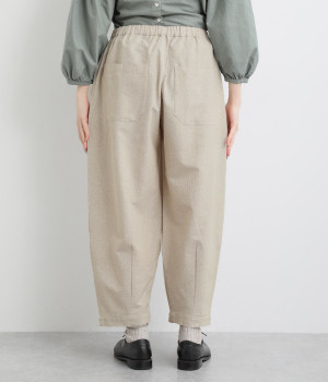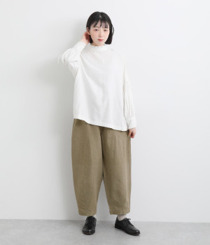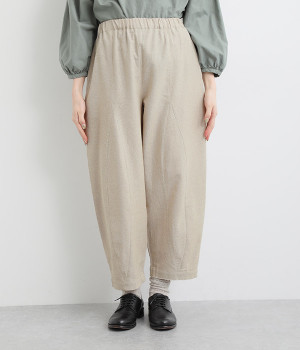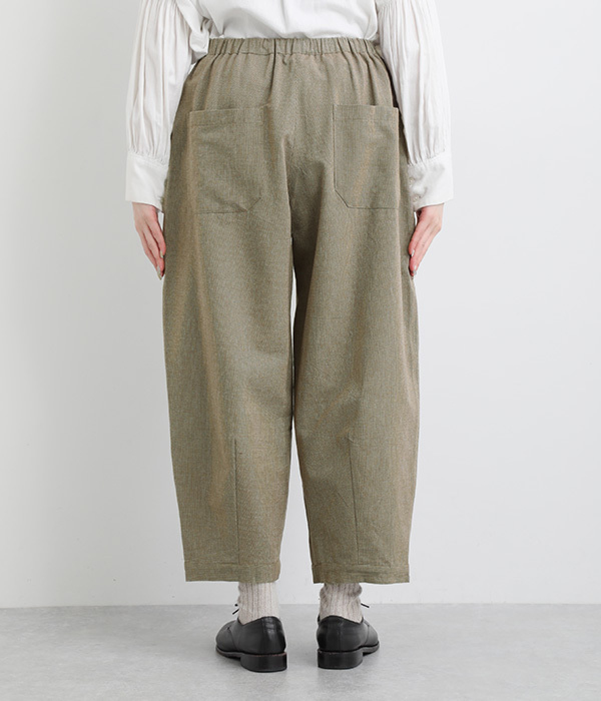 地球をイメージした楕円の切り替えパーツを入れた、ゆったりとしたコクーンシルエット。後ろの大きめパッチポケットもポイントに。裾は折り返しても裏面が見えないカフス仕様。ウエスト総ゴムに内紐を入れたイージータイプです。