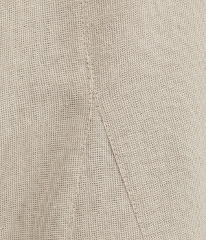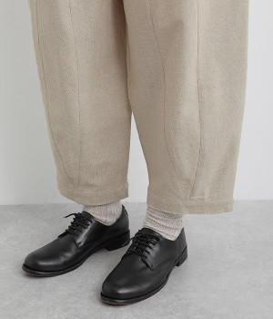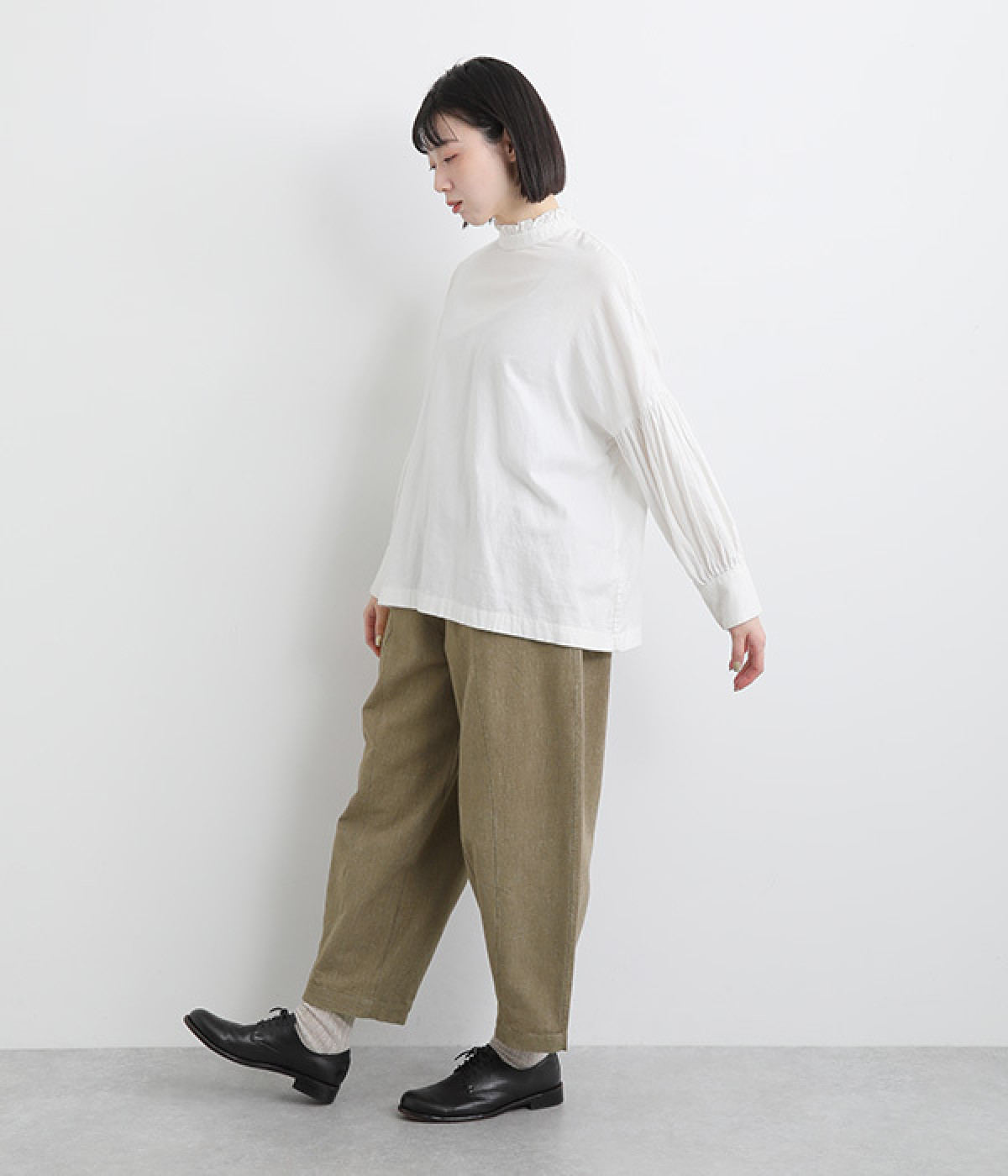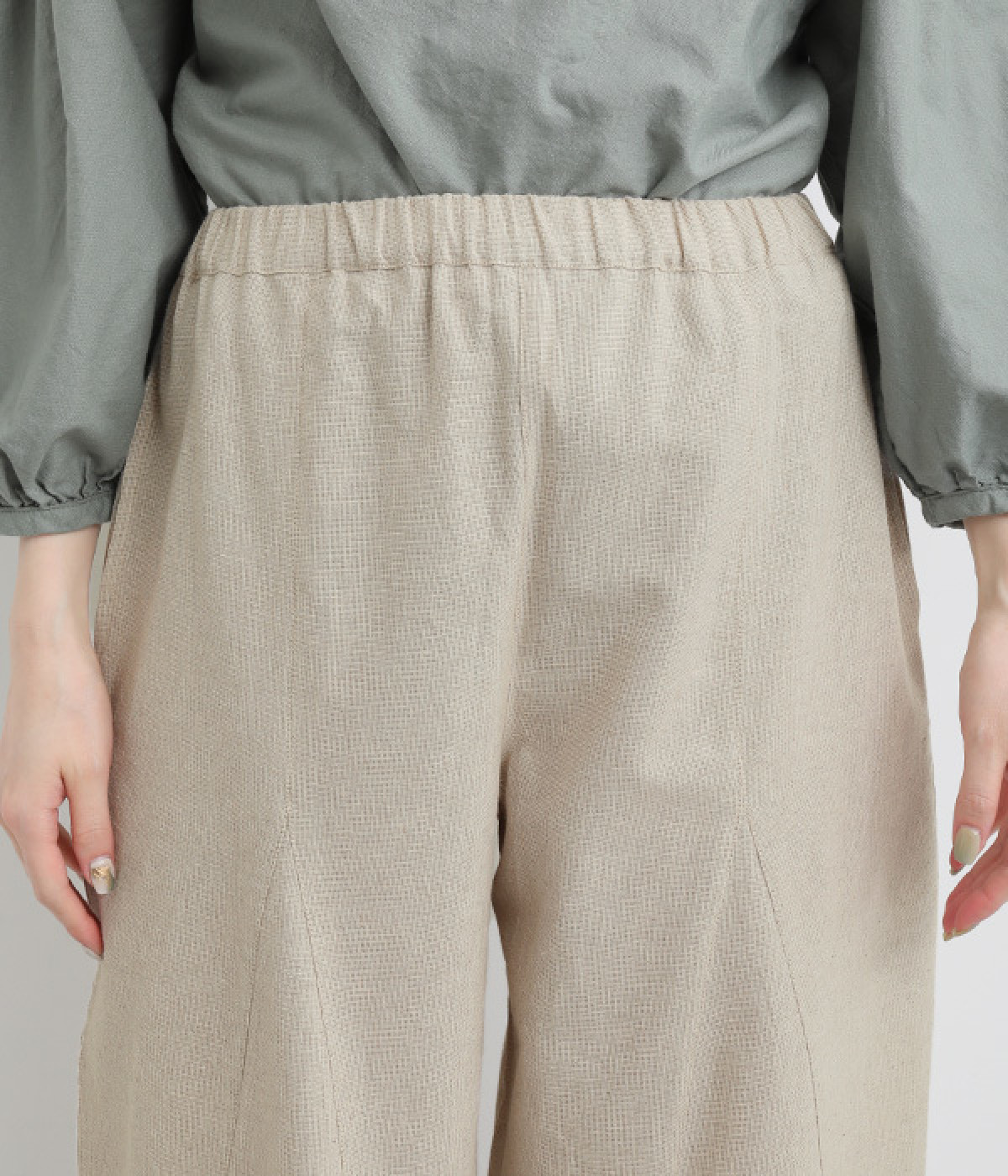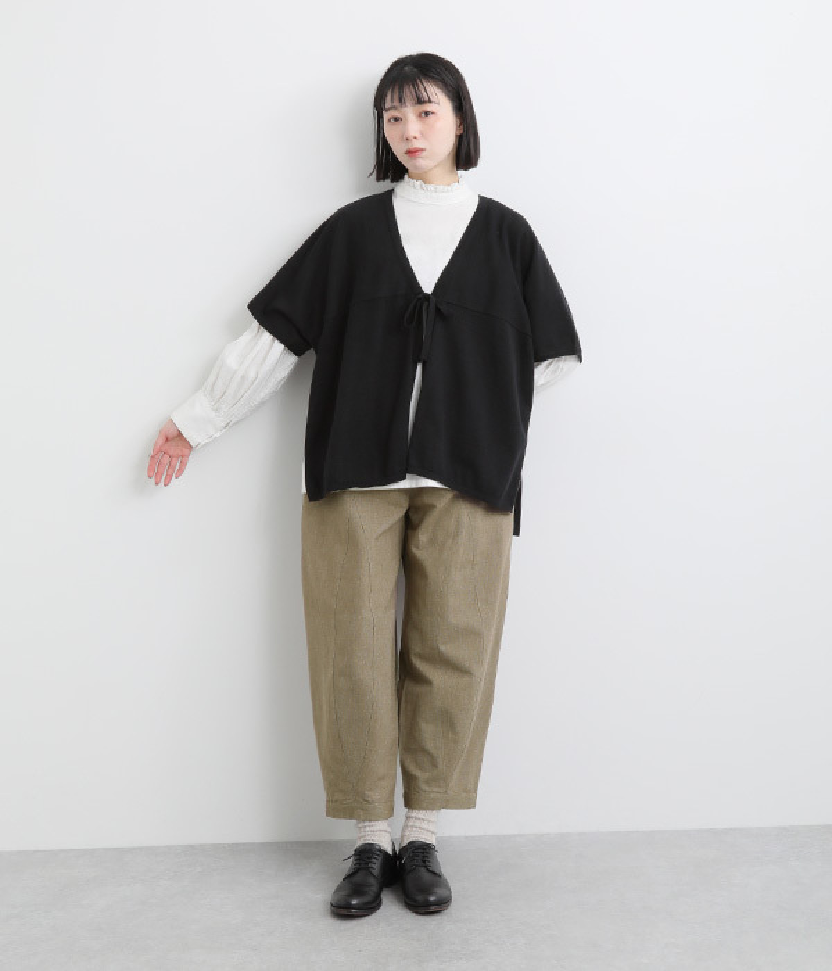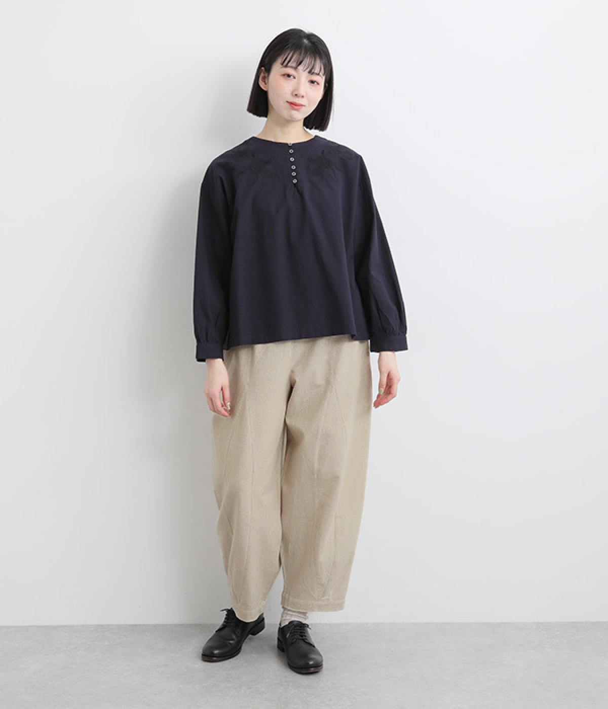 地球をイメージした楕円の切り替えパーツを入れた、ゆったりとしたコクーンシルエット。後ろの大きめパッチポケットもポイントに。裾は折り返しても裏面が見えないカフス仕様。ウエスト総ゴムに内紐を入れたイージータイプです。