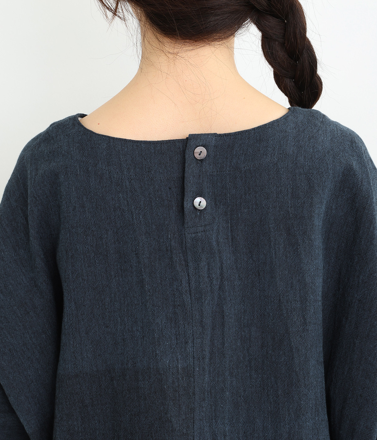 ワンポイントととして後ろ姿を彩る後ろ襟のシェルボタン