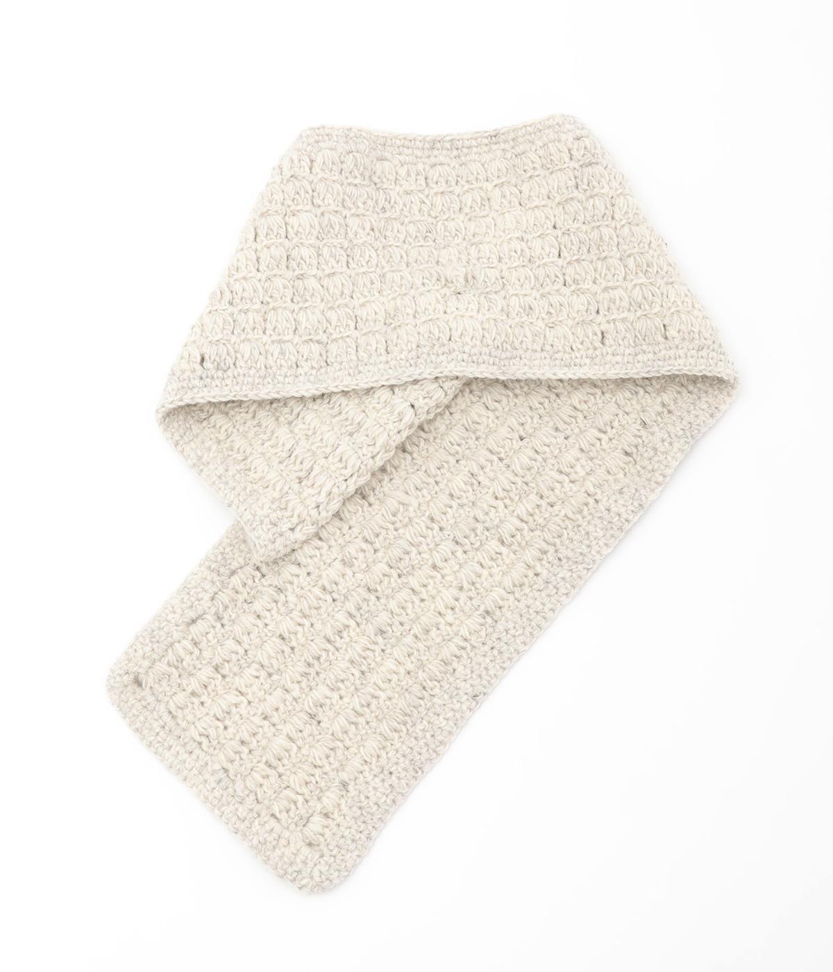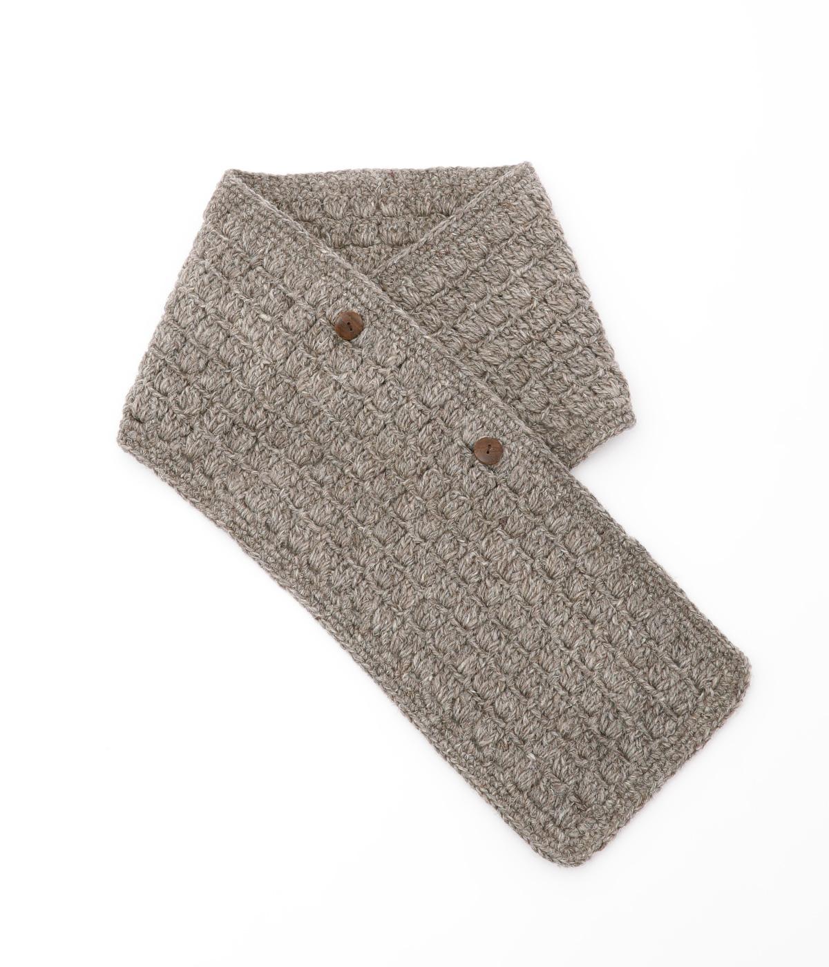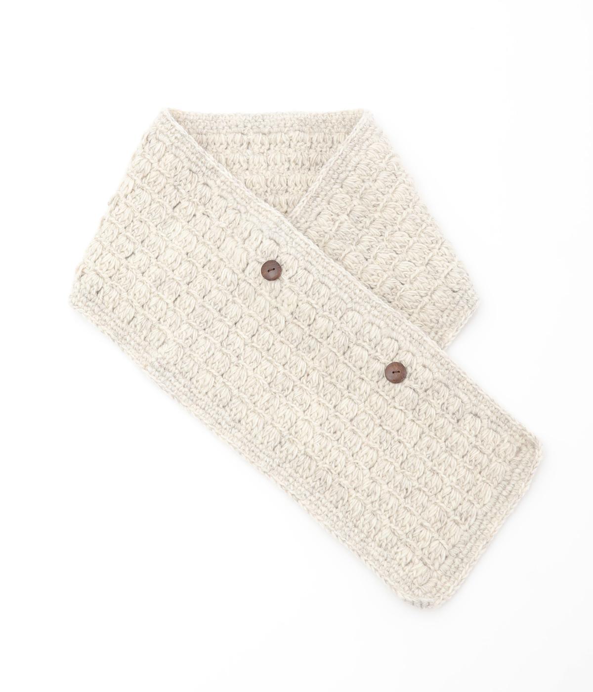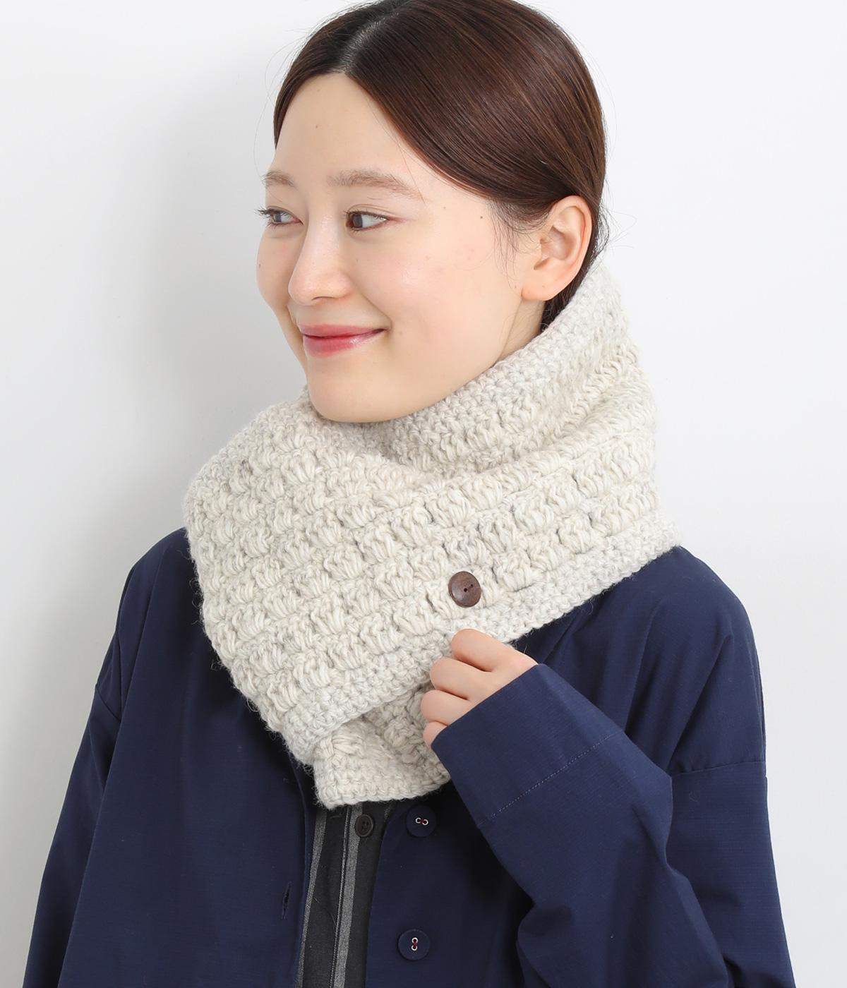 編み模様が顔まわりをやわらかく印象づけるマフラー。ボタンを好みの位置で留めることができ、その日の気分や着こなしに合わせてつけかたをアレンジできます。