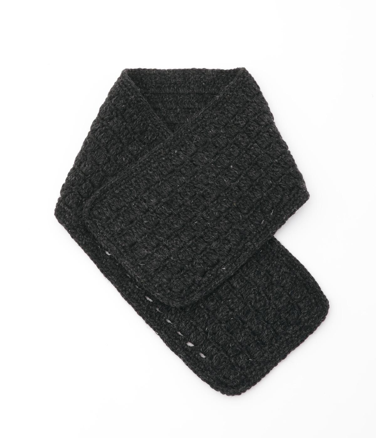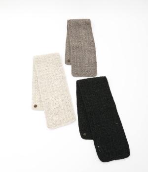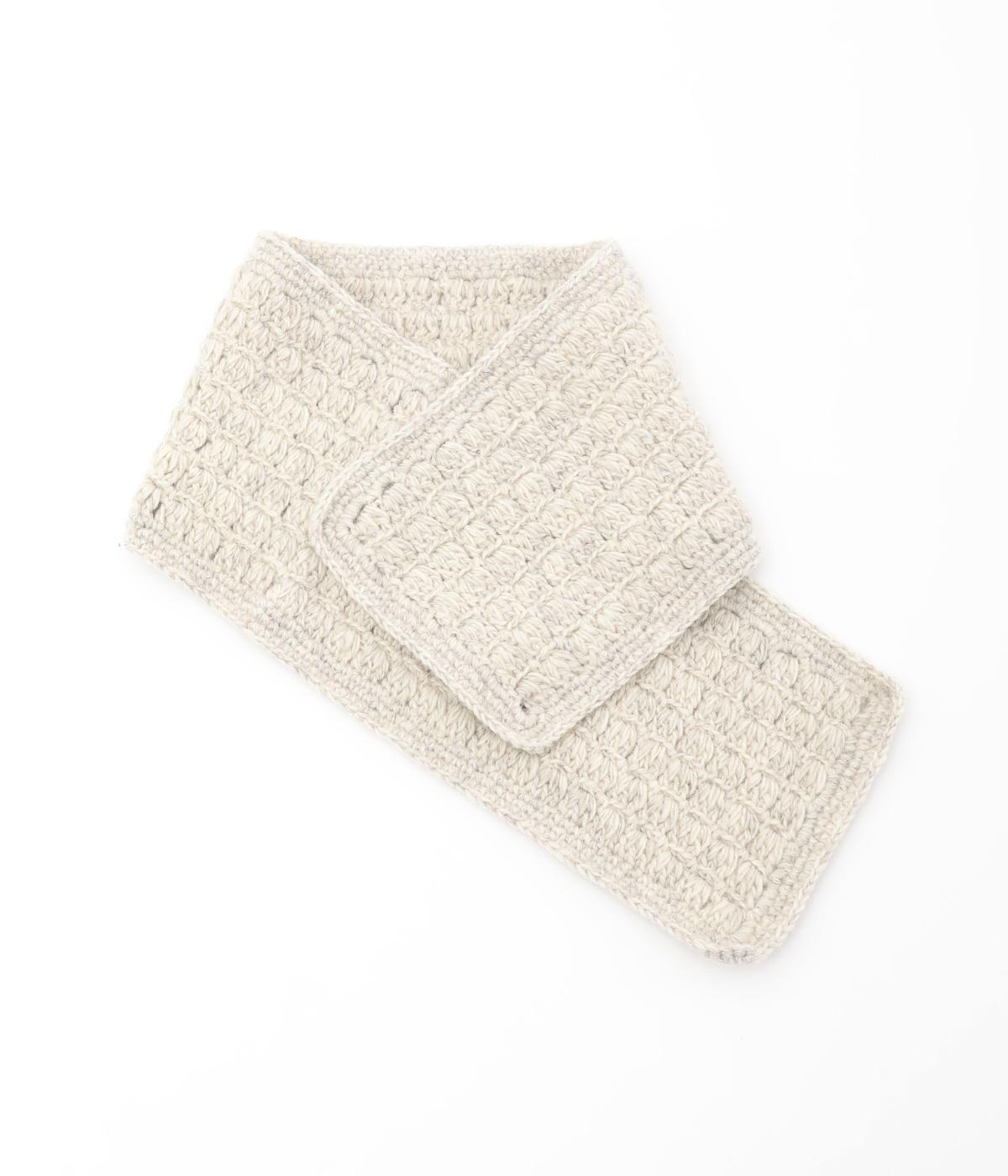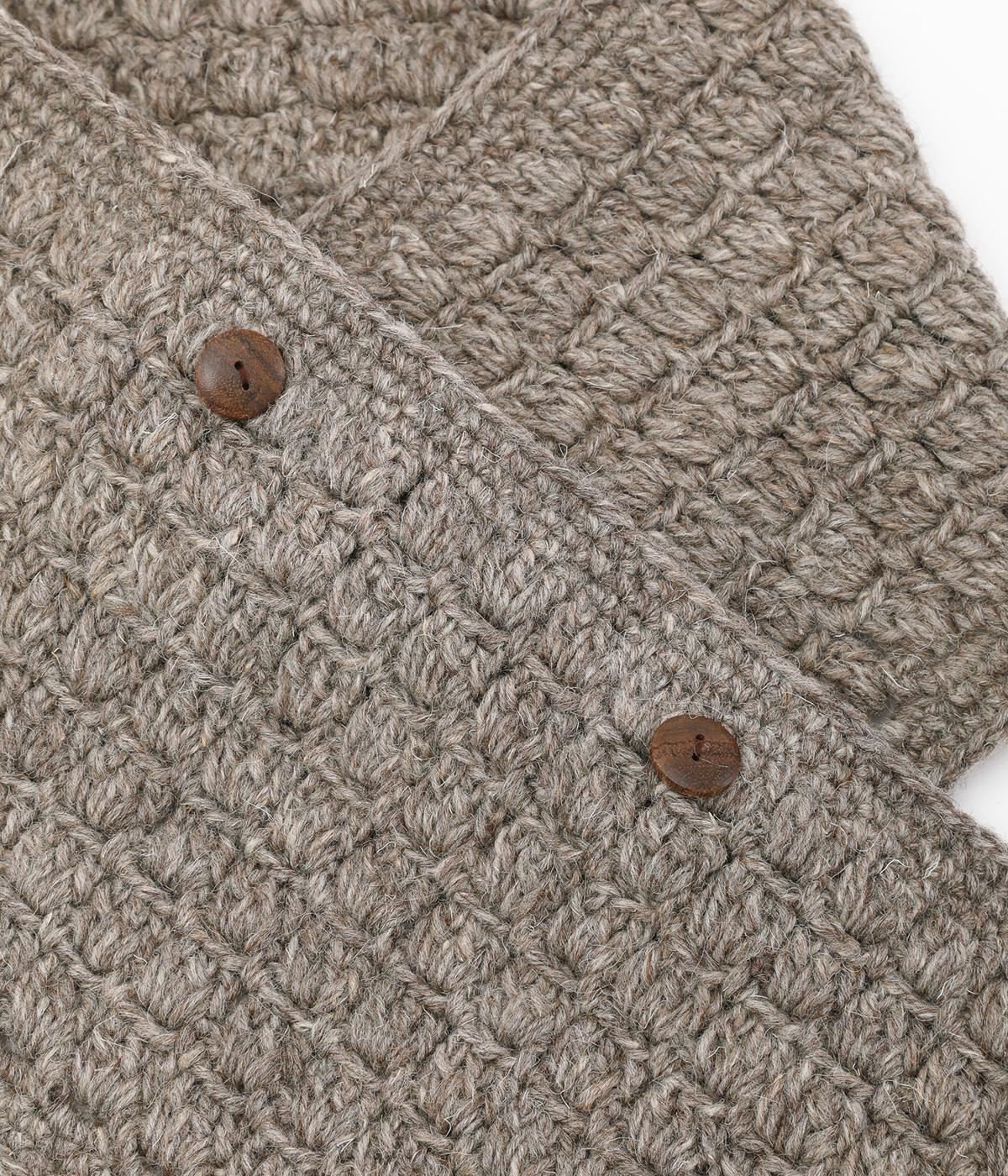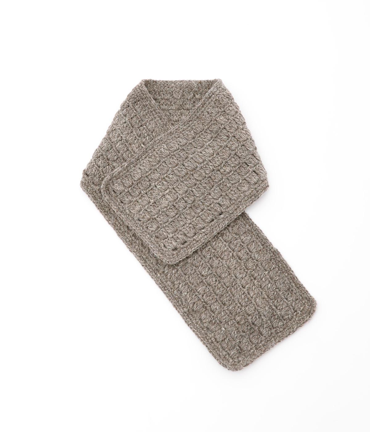 編み模様が顔まわりをやわらかく印象づけるマフラー。ボタンを好みの位置で留めることができ、その日の気分や着こなしに合わせてつけかたをアレンジできます。