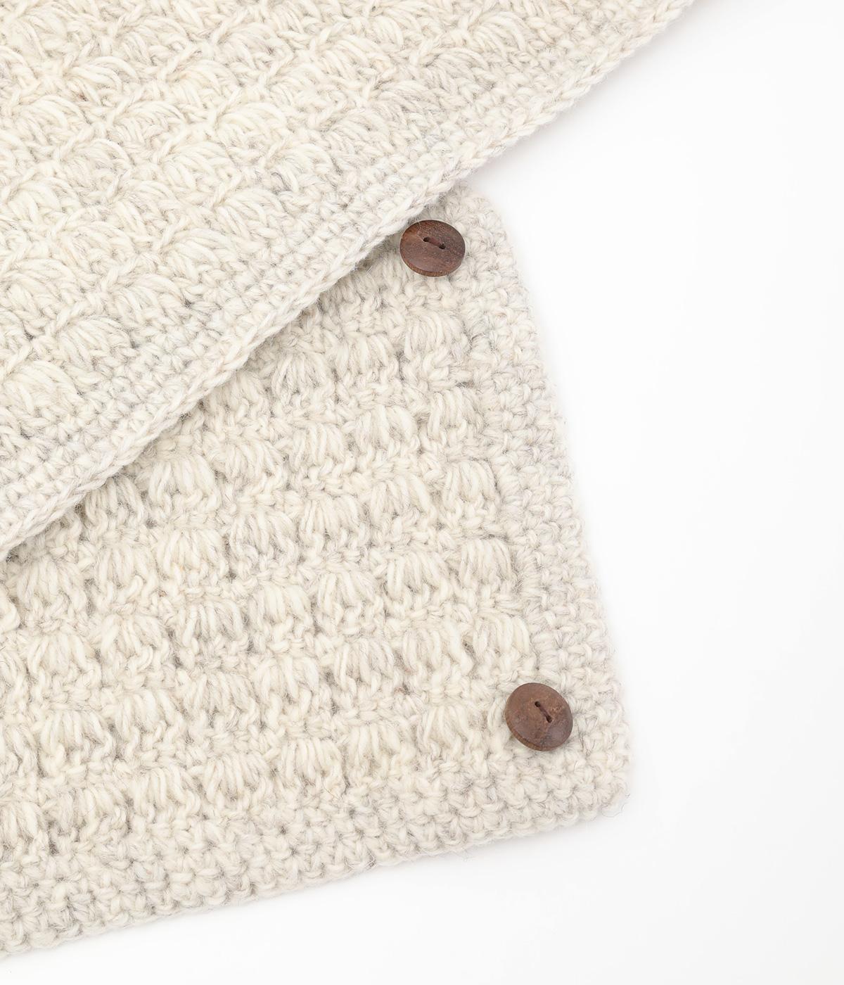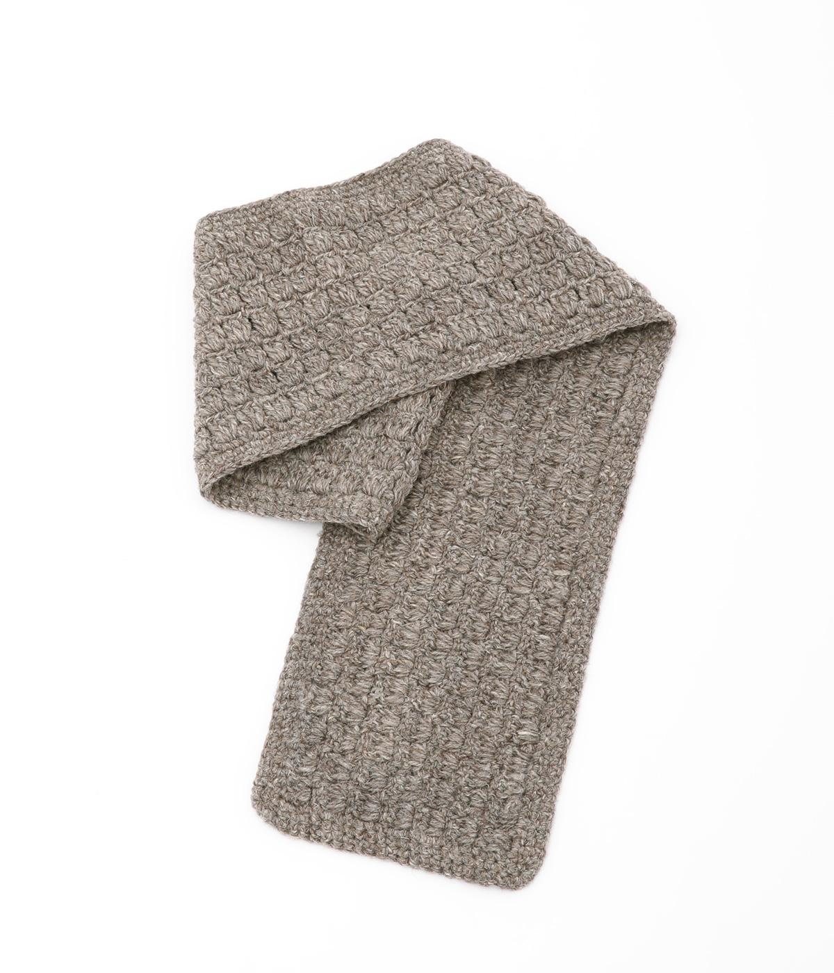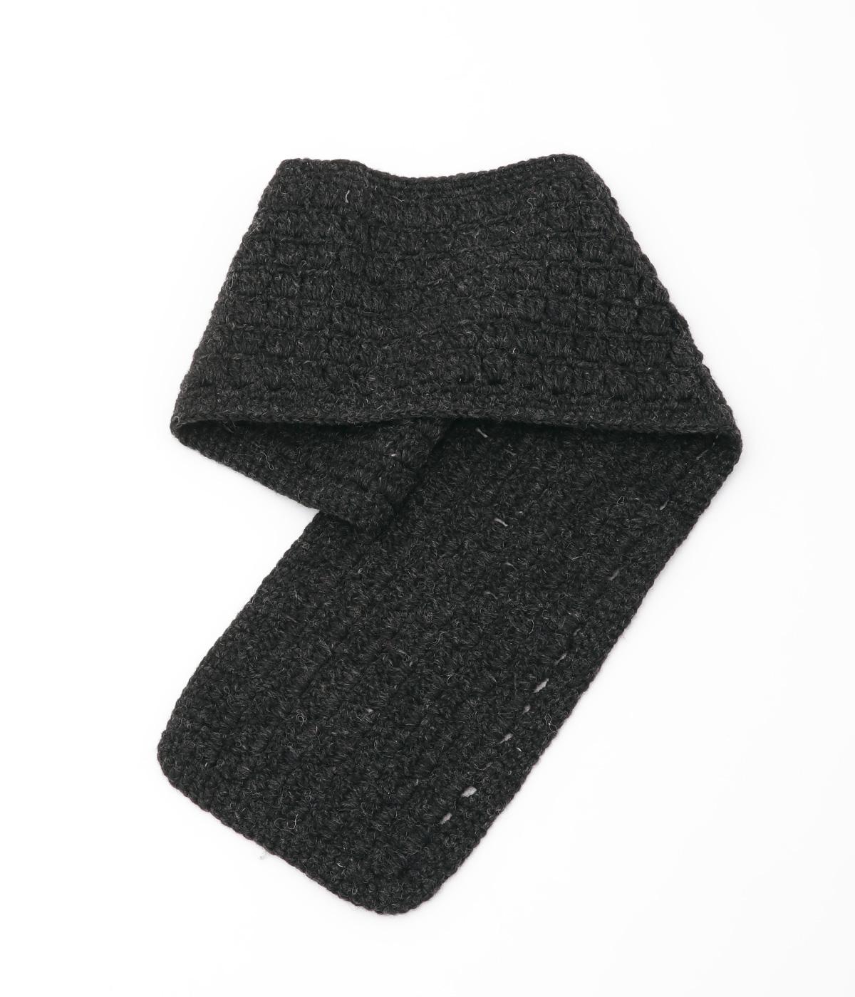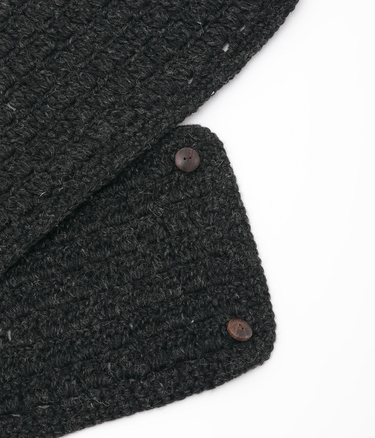 編み模様が顔まわりをやわらかく印象づけるマフラー。ボタンを好みの位置で留めることができ、その日の気分や着こなしに合わせてつけかたをアレンジできます。