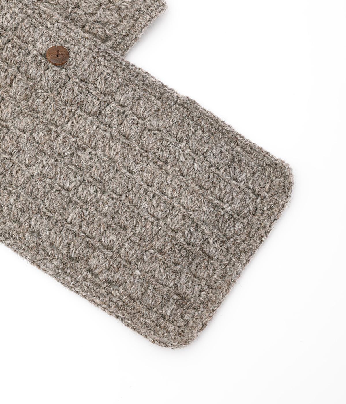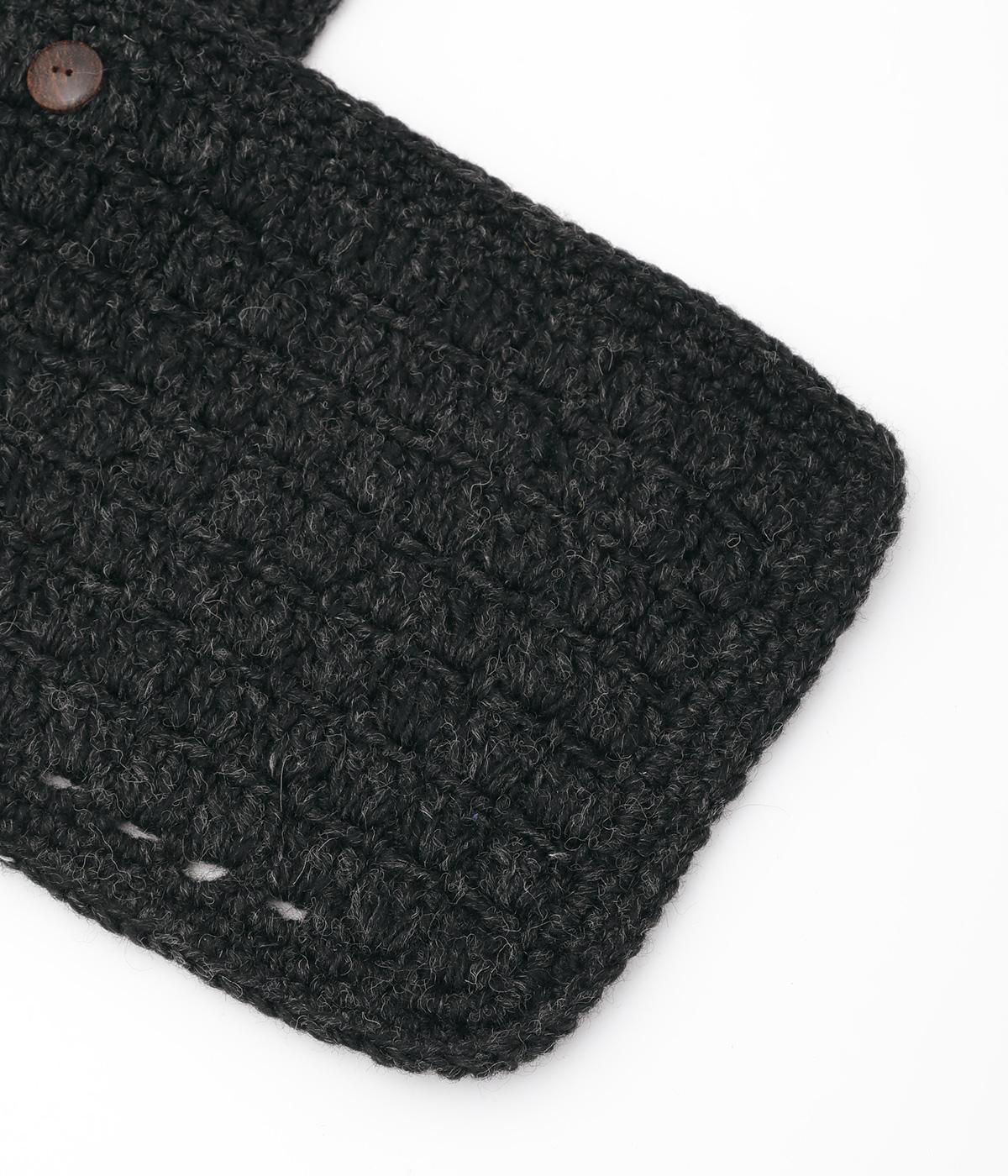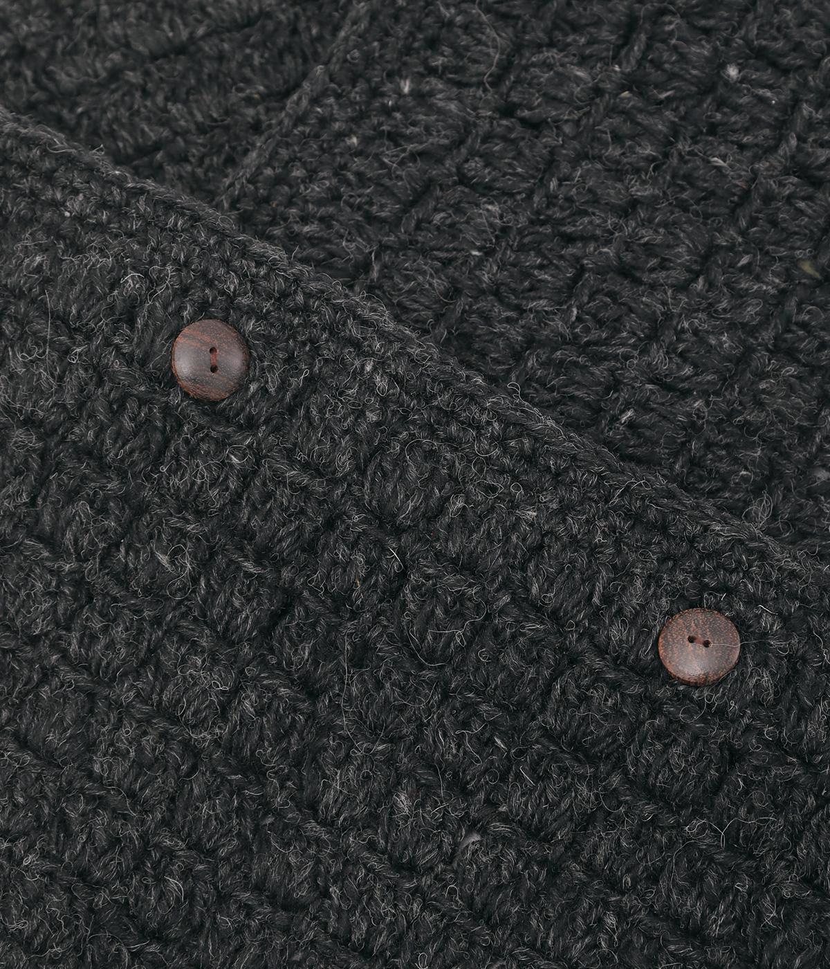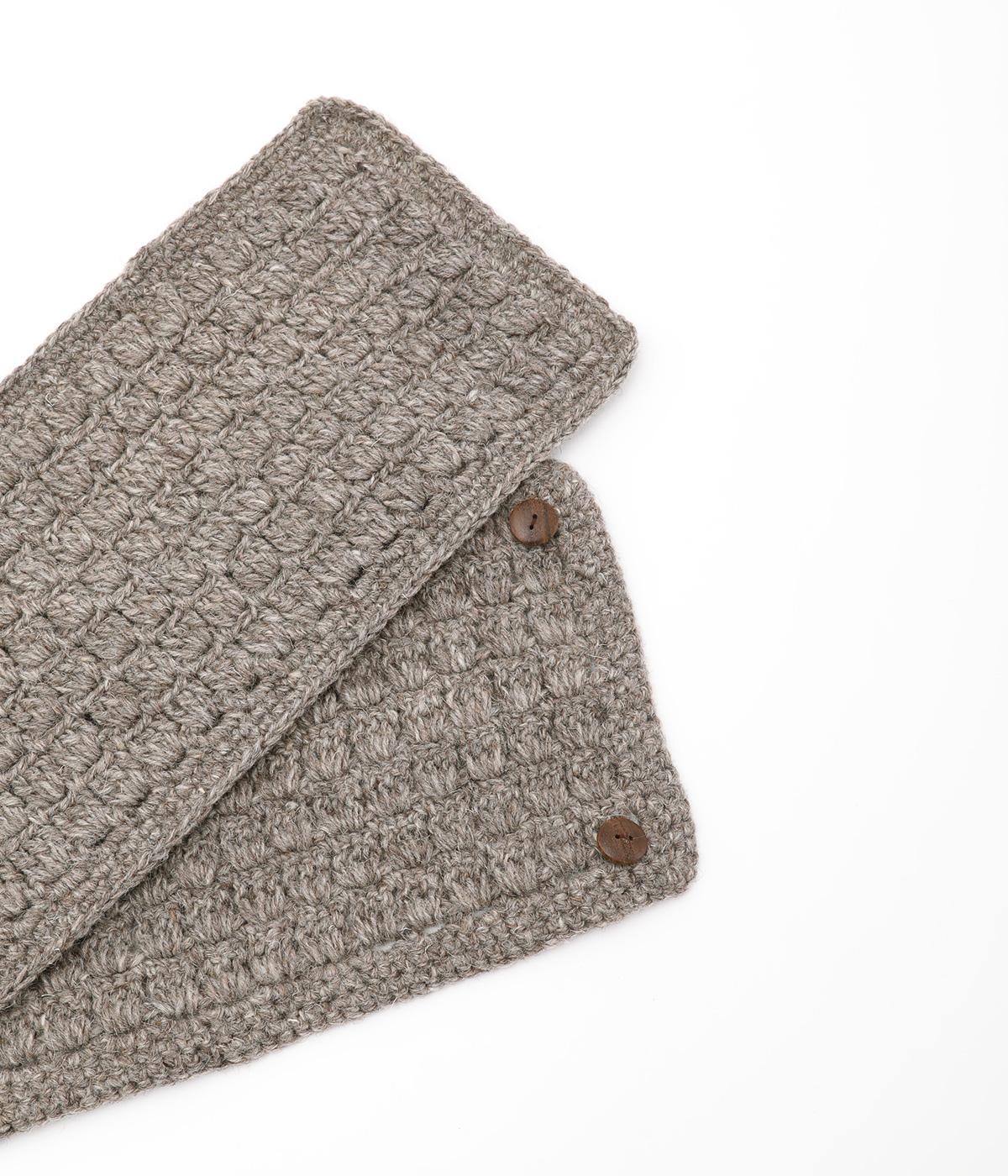 編み模様が顔まわりをやわらかく印象づけるマフラー。ボタンを好みの位置で留めることができ、その日の気分や着こなしに合わせてつけかたをアレンジできます。