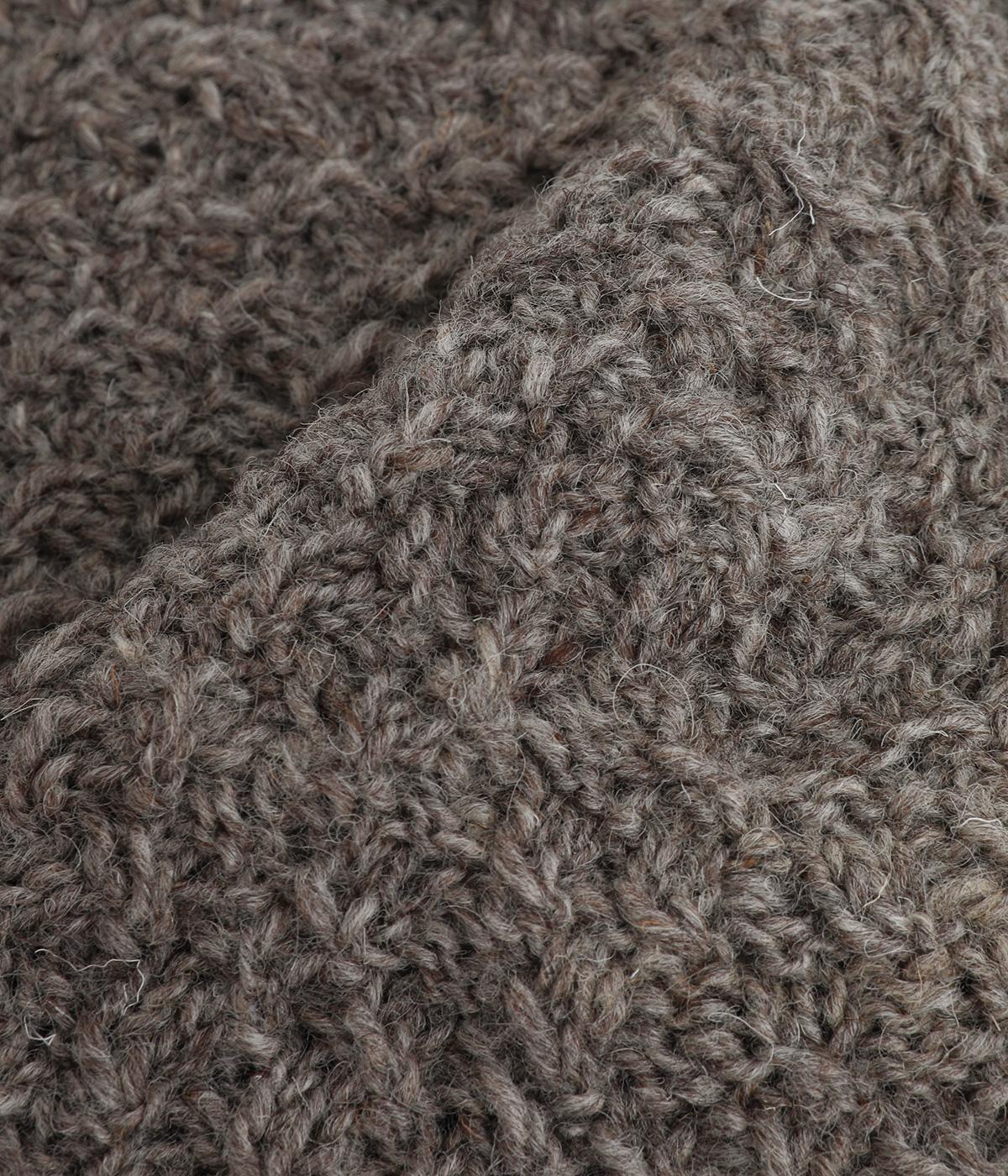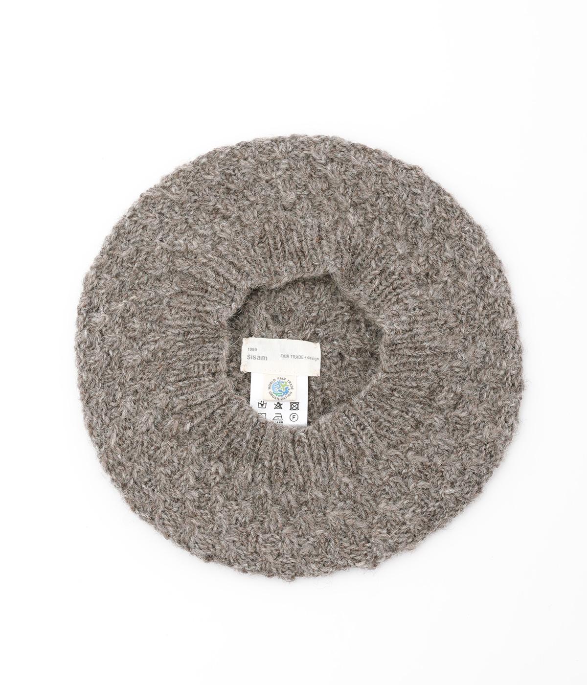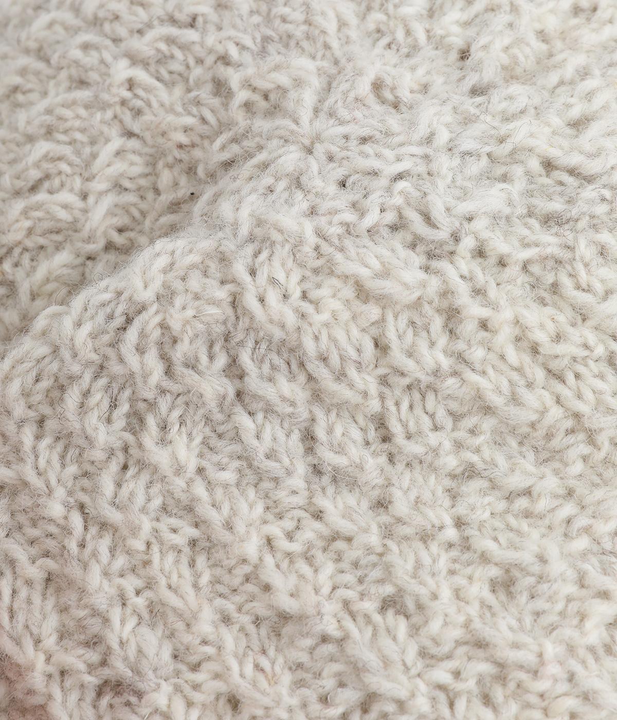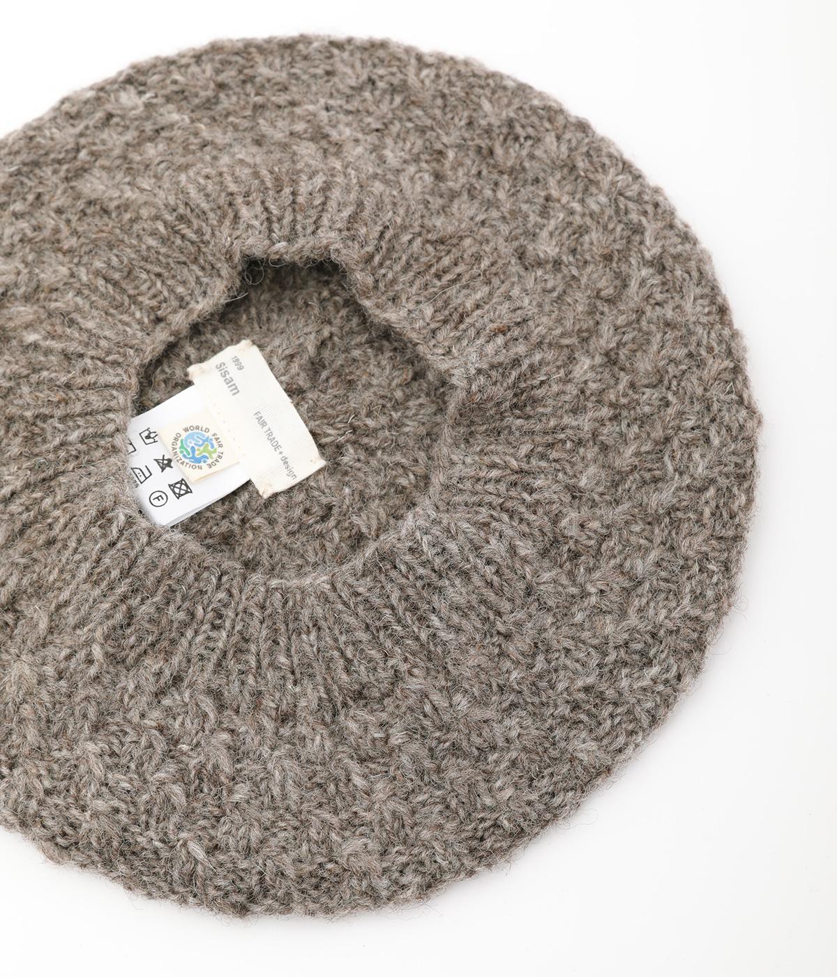 ふっくらとしたウールの毛糸を用いて、丁寧に手編みでつくられたニット生地。凹凸の映えるアラン模様がポイントです。おでこが触れる前部分にコットンの裏地をつけて、チクチク感を軽減しています。
