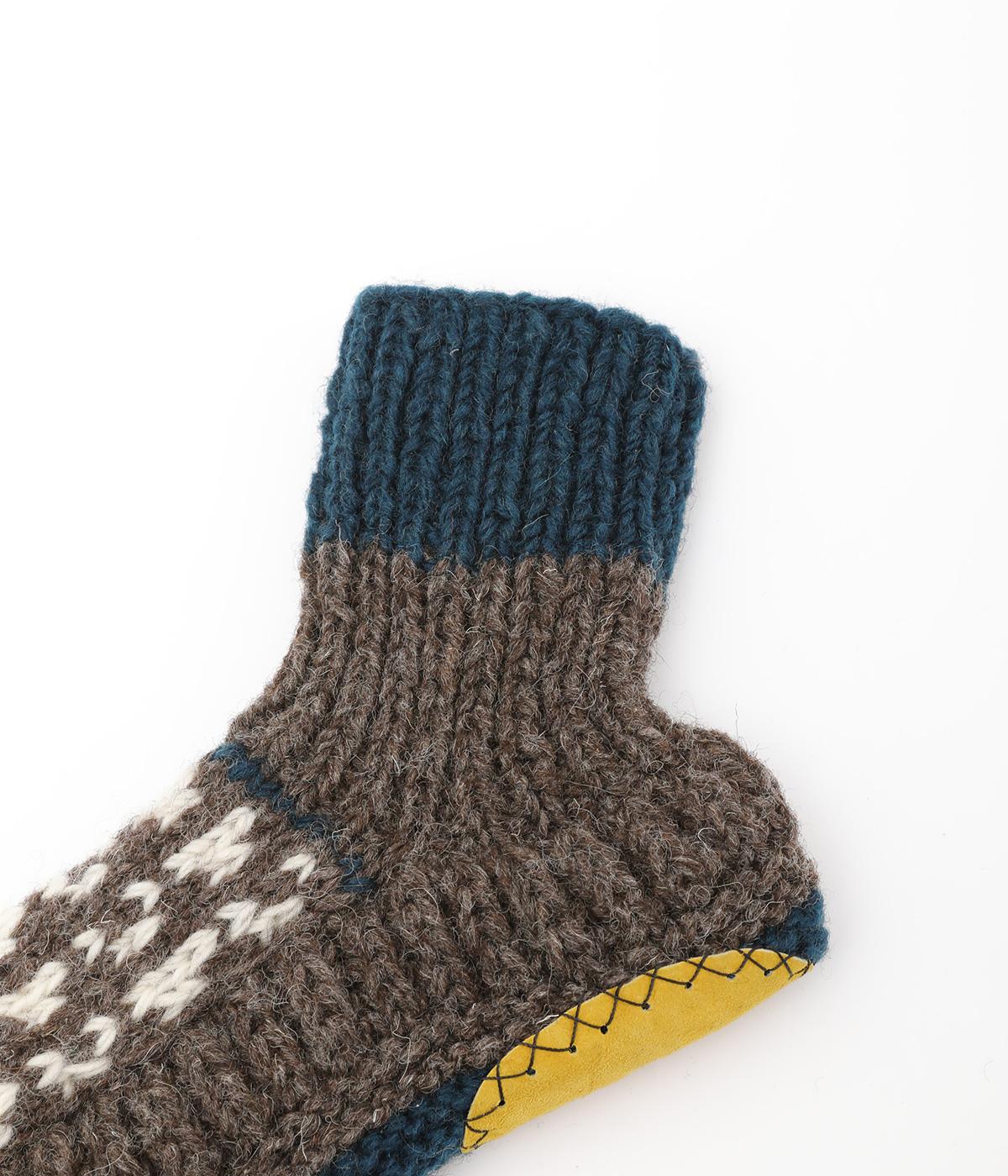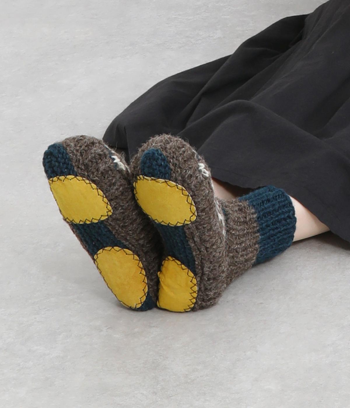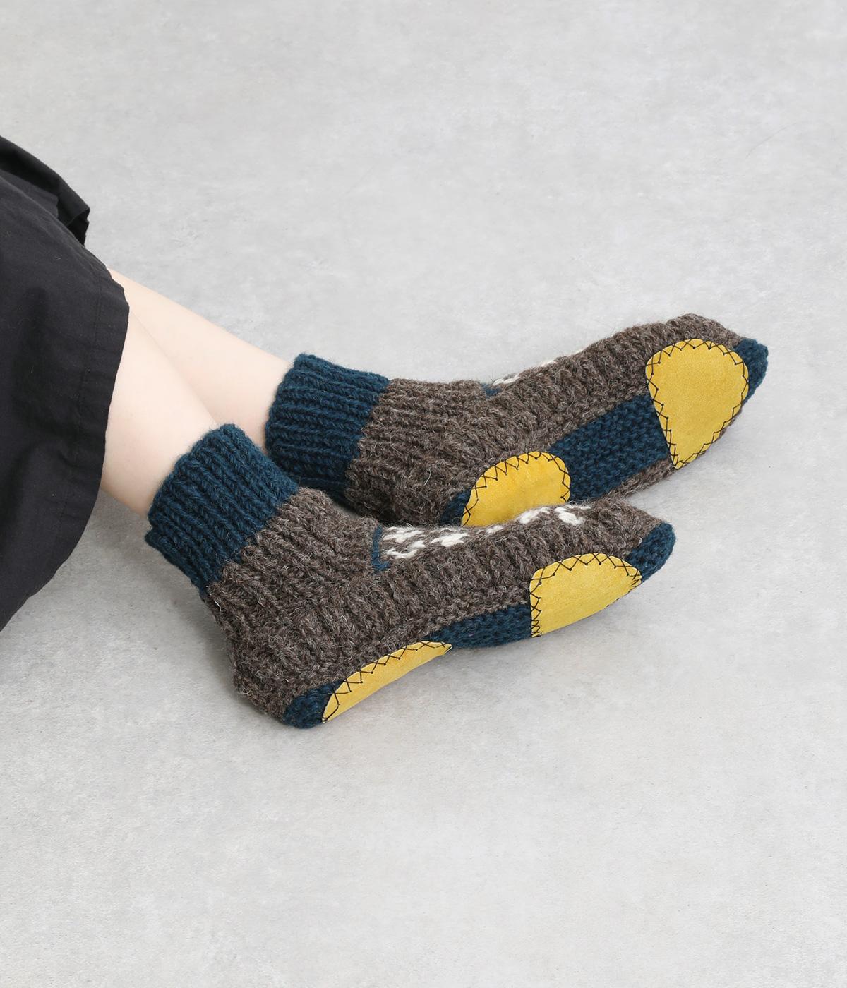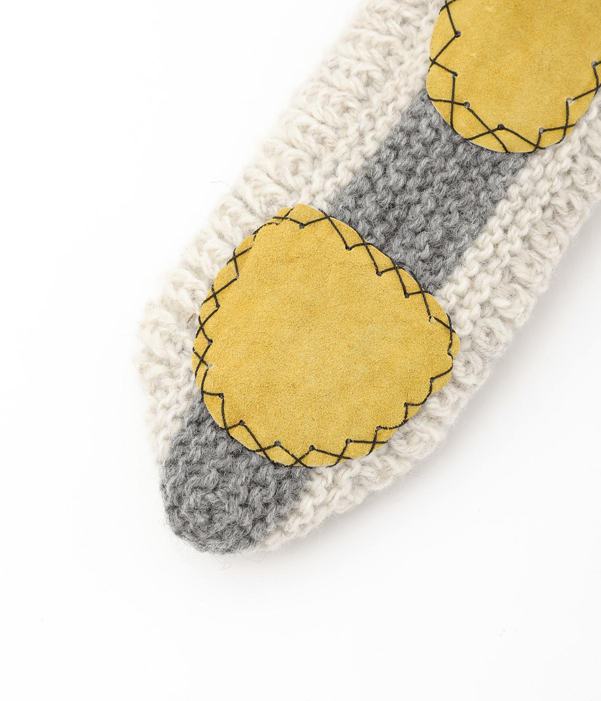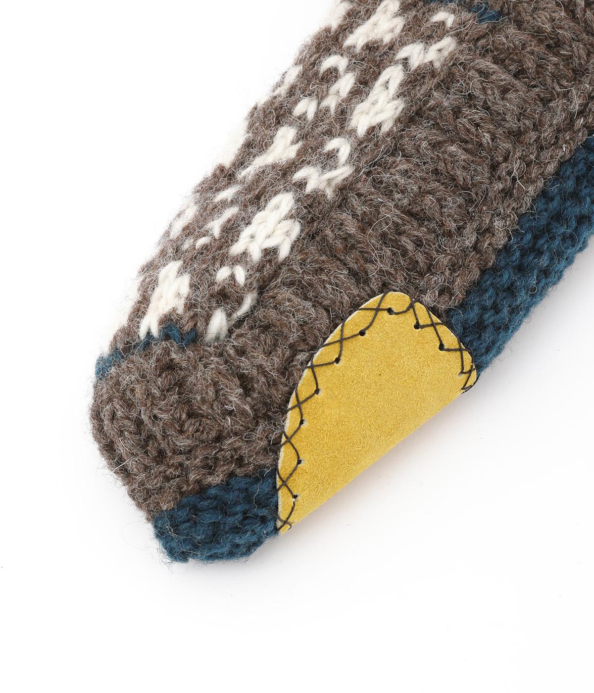 足全体をあたたかく包み込んでくれる、しっかりとした厚みのあるニット生地。空気をたっぷりと含んだウールの毛糸を使用して、一つ一つ丁寧に手編みでつくられています。チクチク感を軽減するコットンの裏地つき。爪先と踵にはレザーをつけて滑りにくくしています。