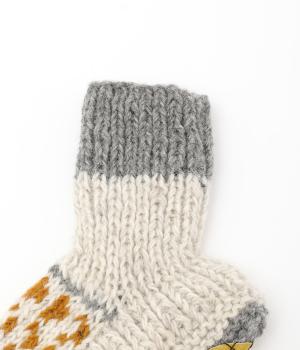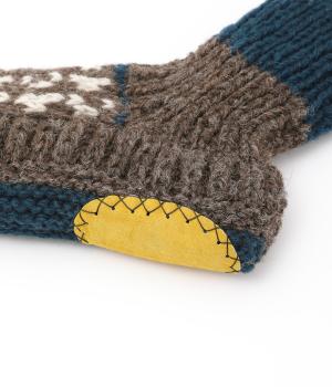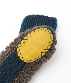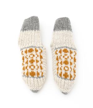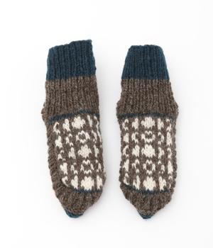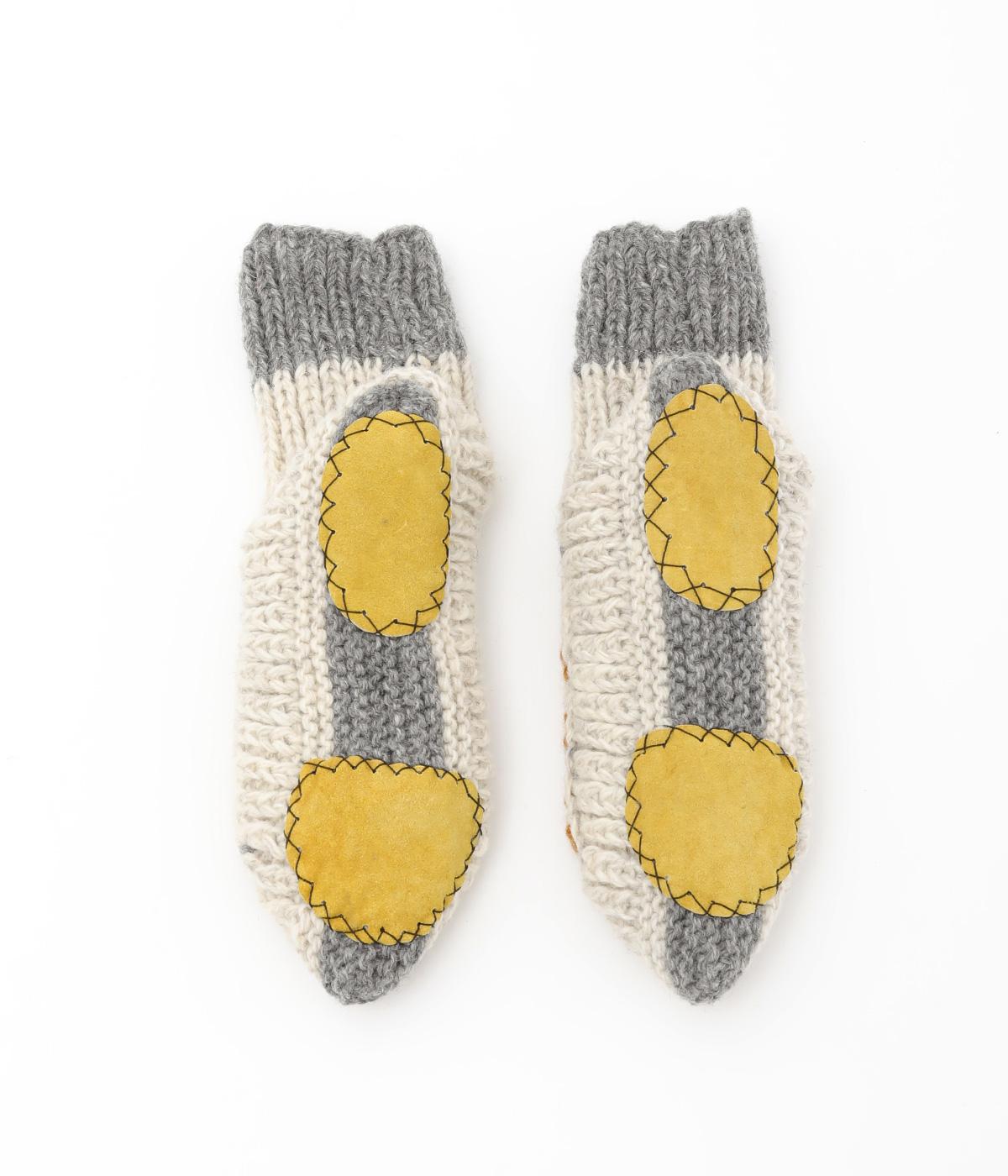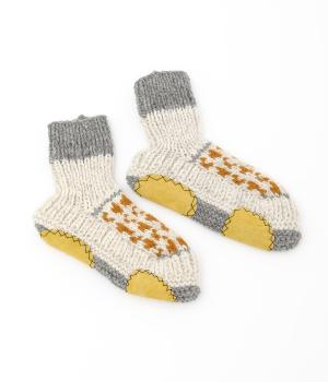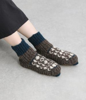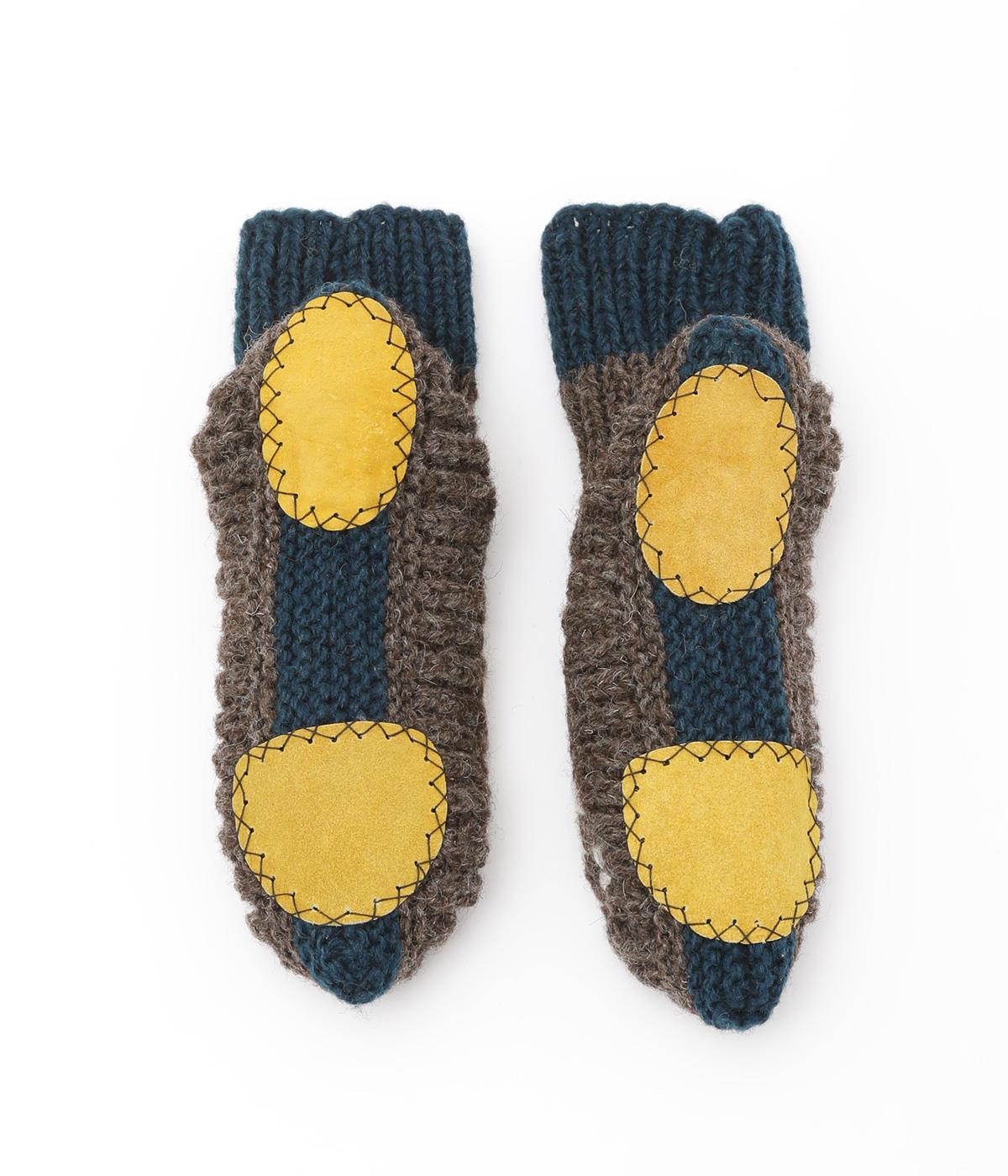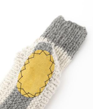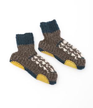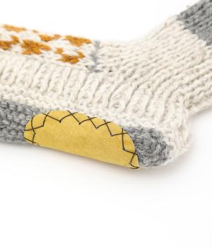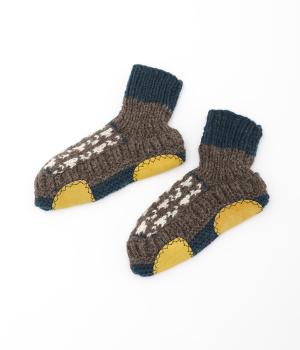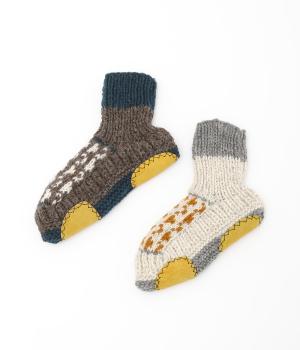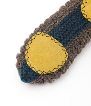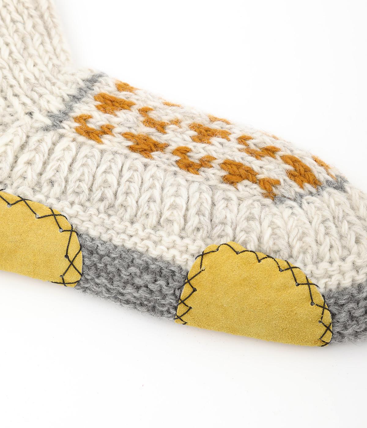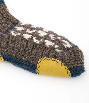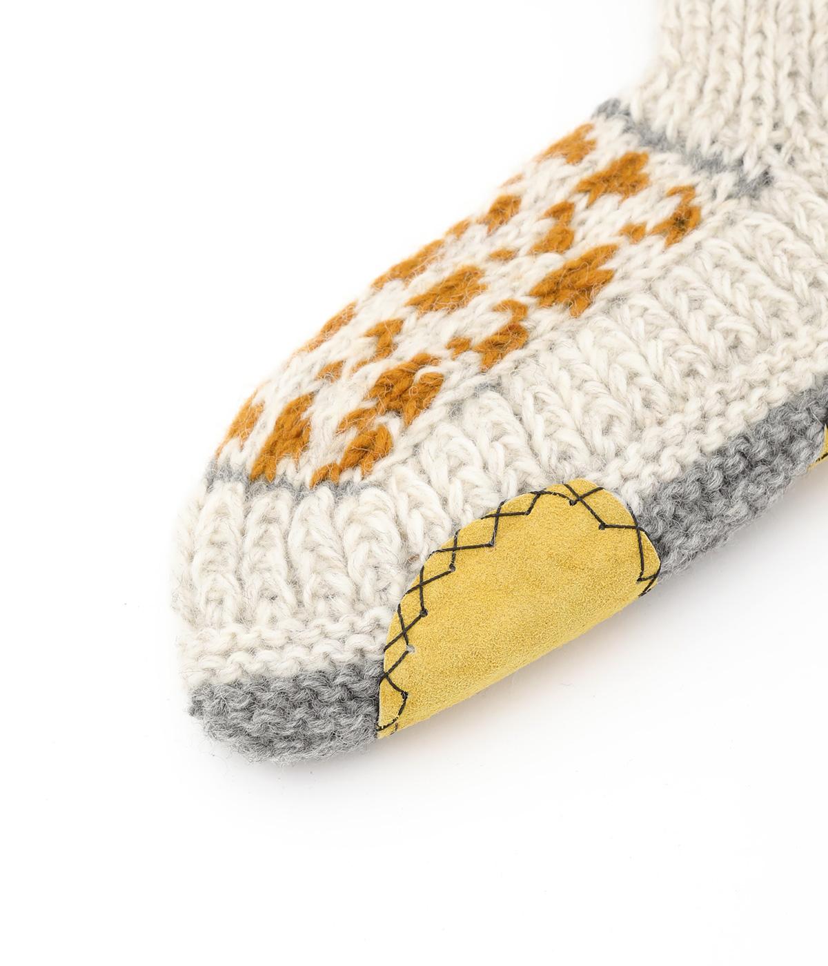 足全体をあたたかく包み込んでくれる、しっかりとした厚みのあるニット生地。空気をたっぷりと含んだウールの毛糸を使用して、一つ一つ丁寧に手編みでつくられています。チクチク感を軽減するコットンの裏地つき。爪先と踵にはレザーをつけて滑りにくくしています。