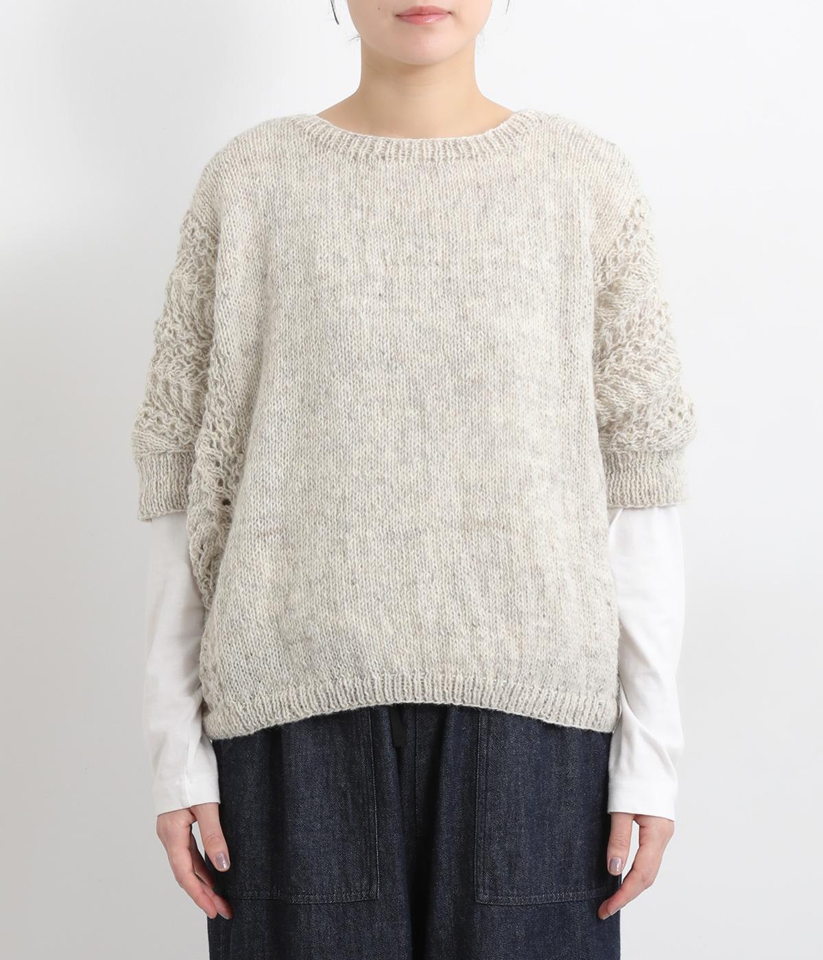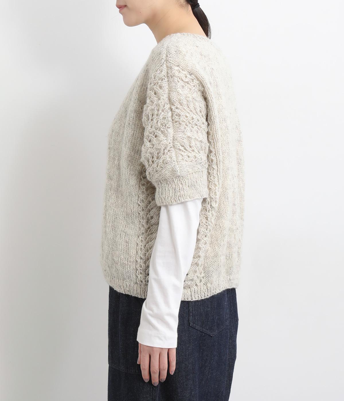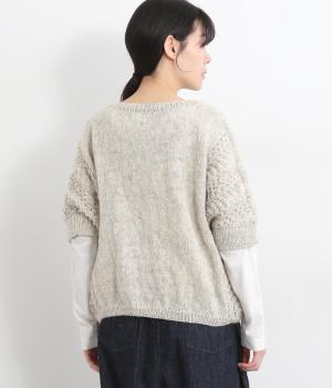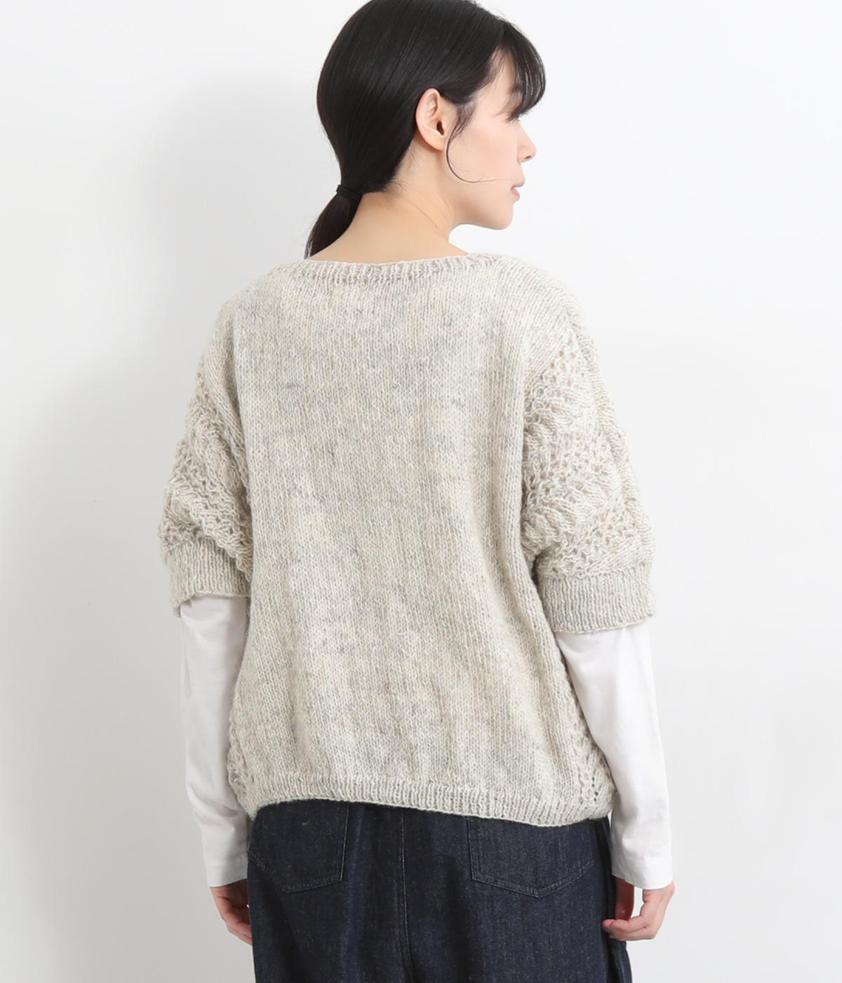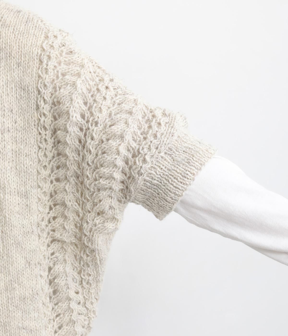 自然な風合いが魅力のウール糸を使用し、手編みで丁寧に仕上げられたあたたかみのあるニット生地。袖やサイドに透かし編みを取り入れています。
