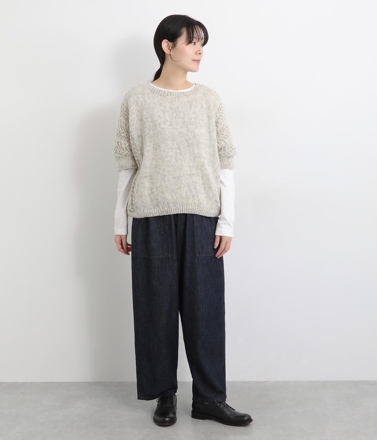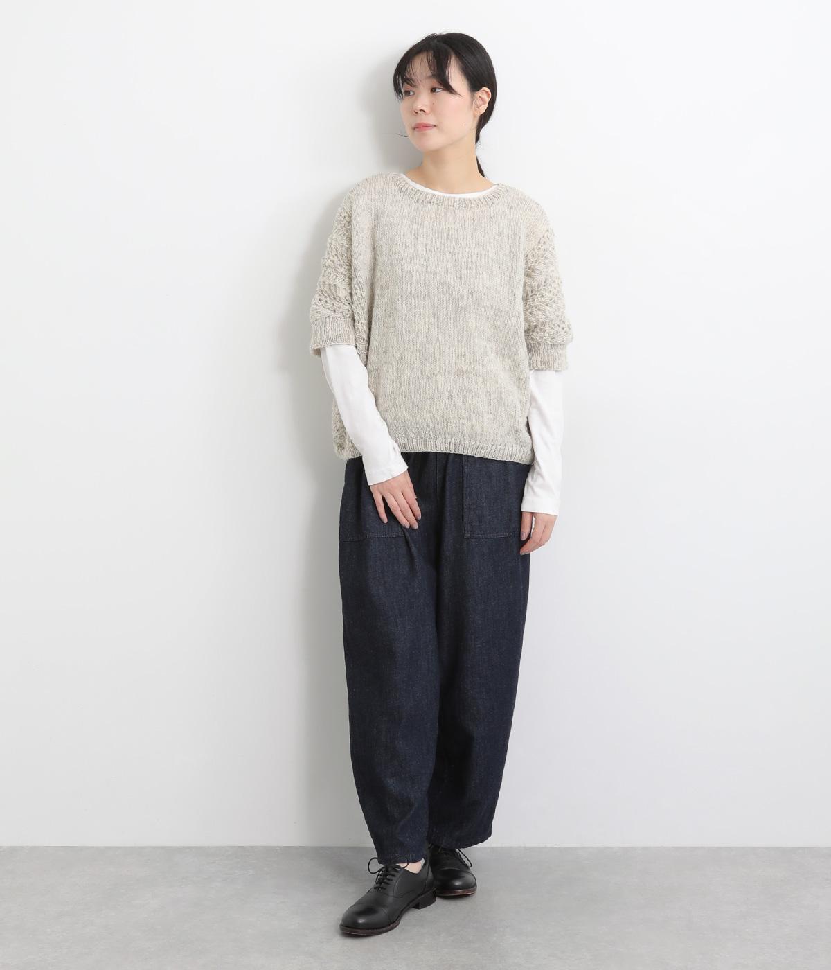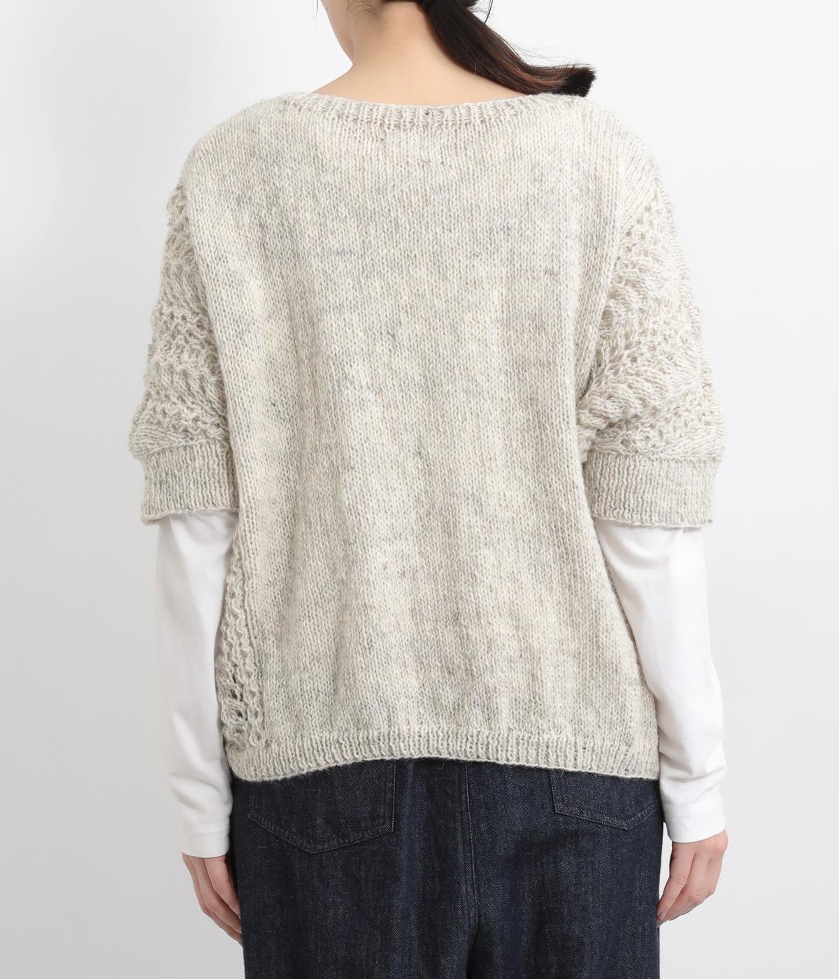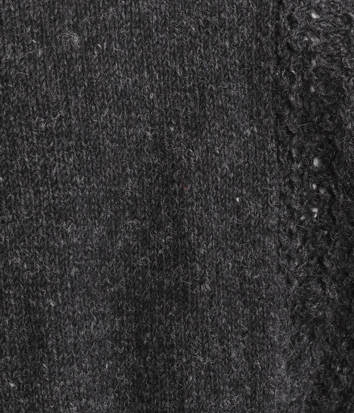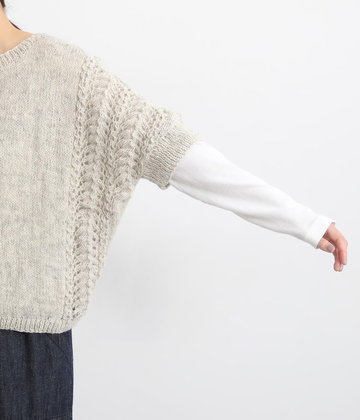 自然な風合いが魅力のウール糸を使用し、手編みで丁寧に仕上げられたあたたかみのあるニット生地。袖やサイドに透かし編みを取り入れています。
